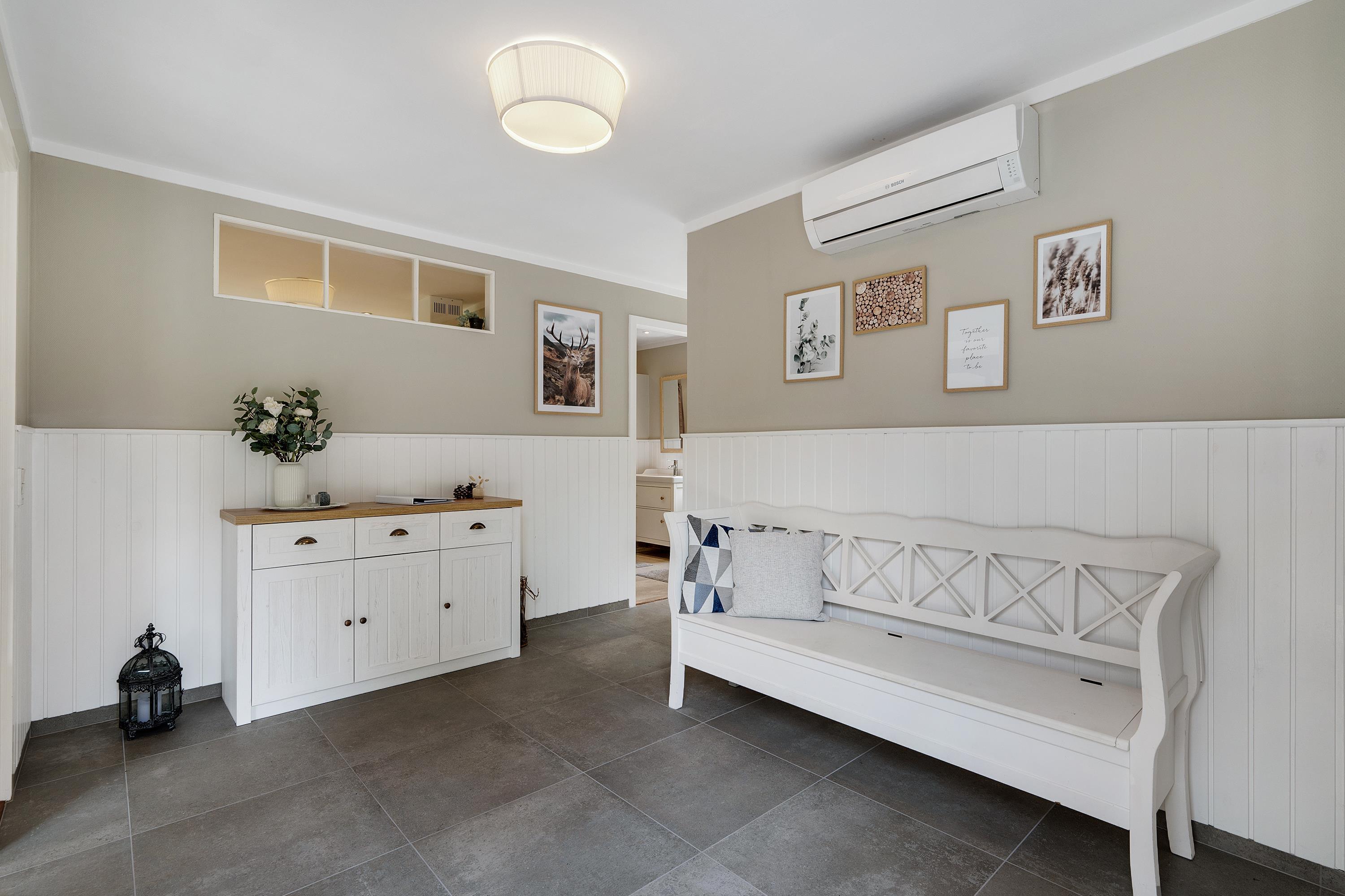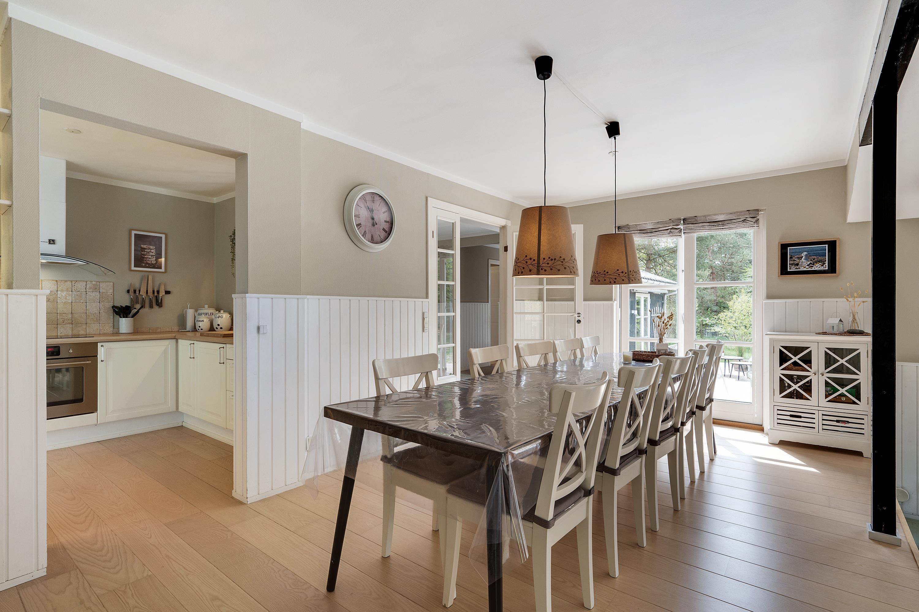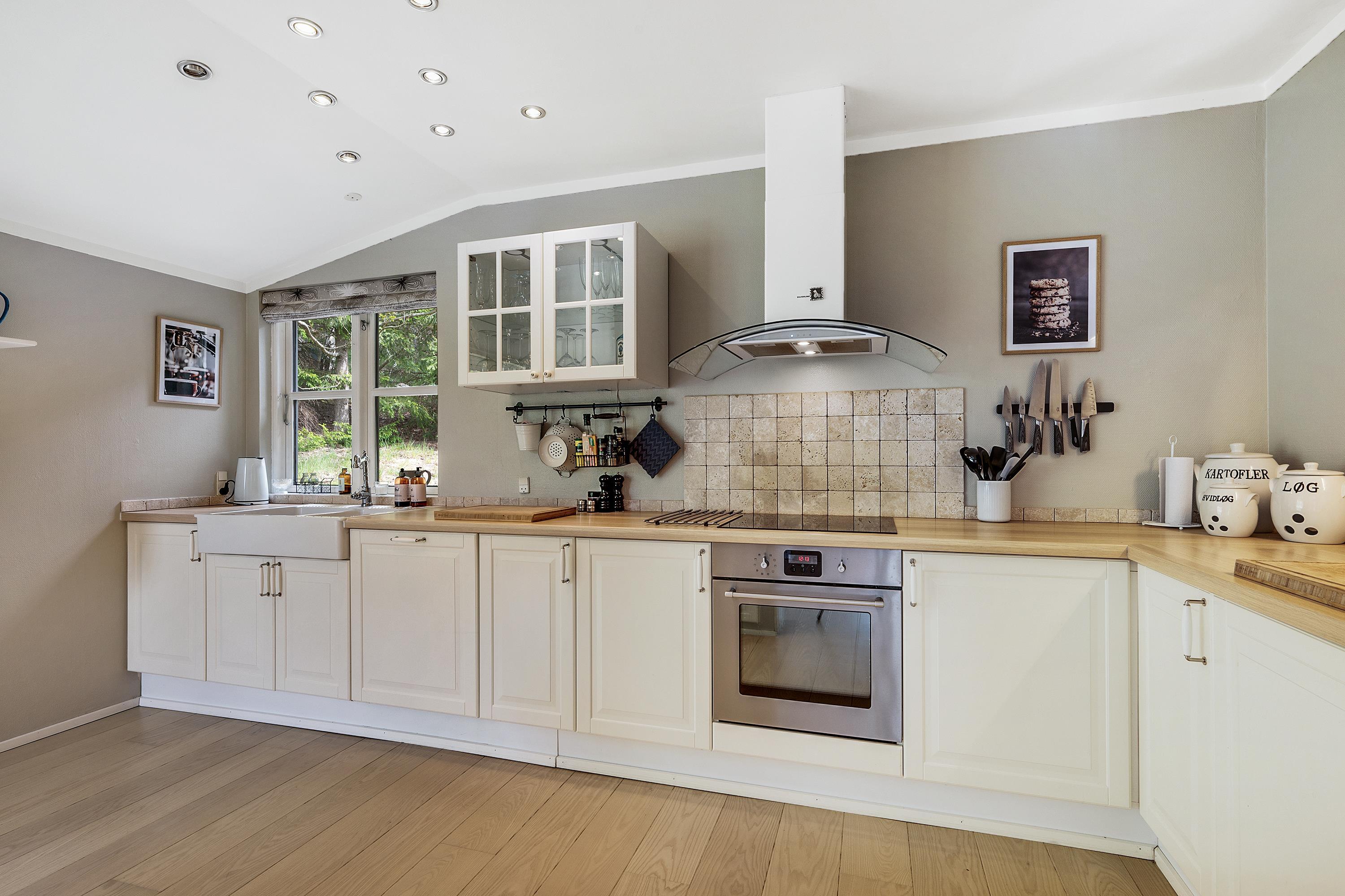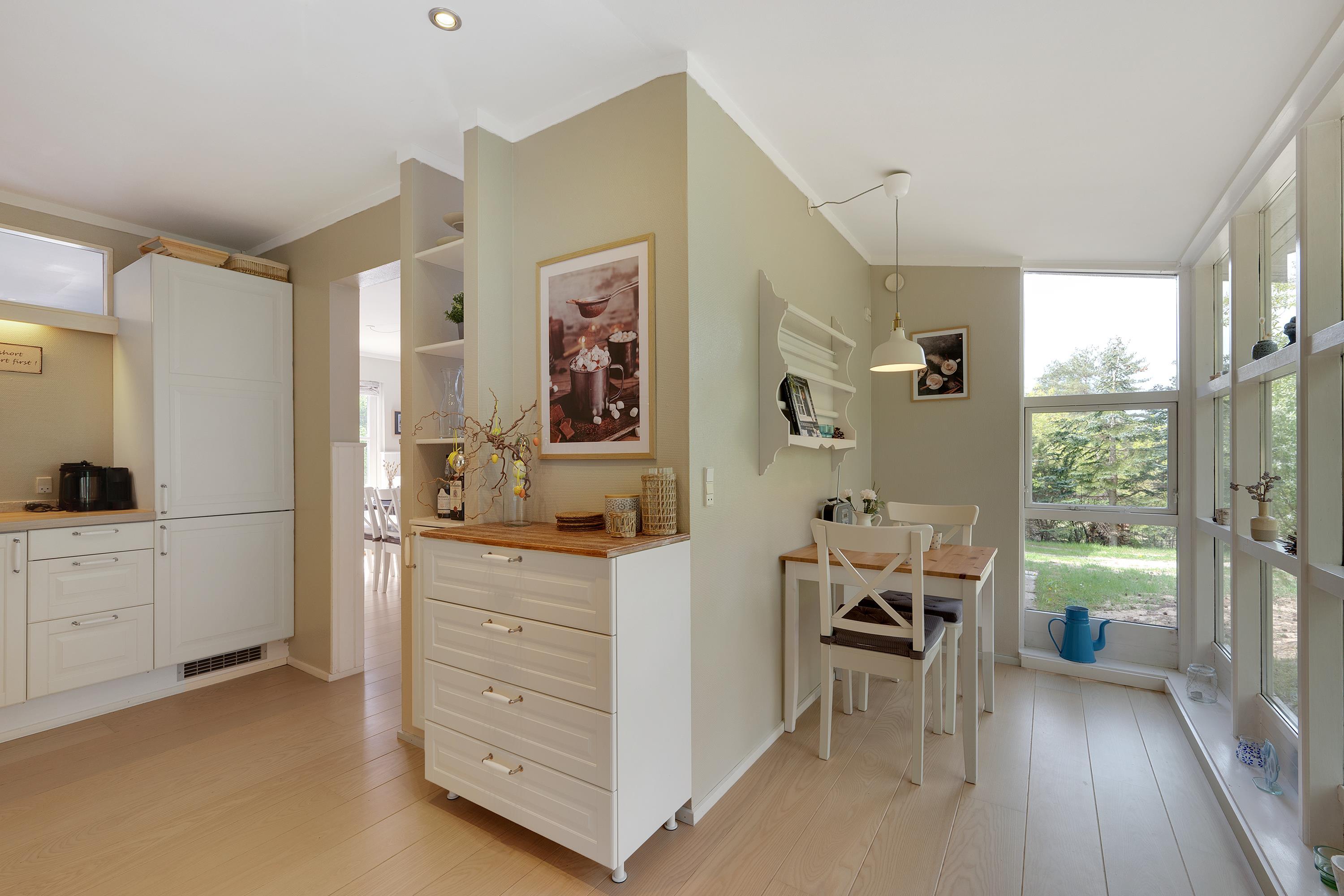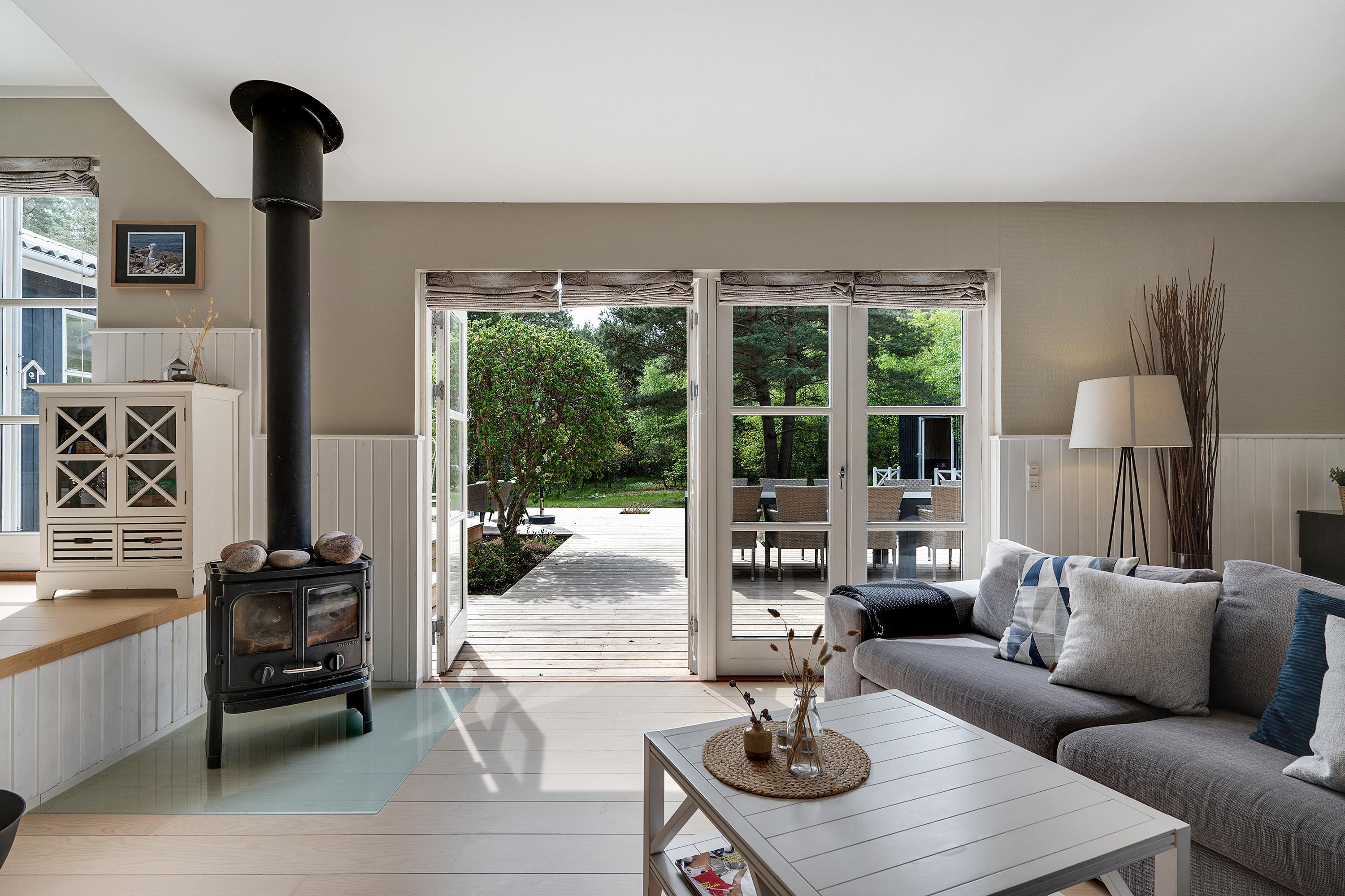 Das große, helle und gut eingerichtete Wohnzimmer verfügt über einen Holzofen, Essecke für 10 Personen, gemütliche Sofaecke mit SMART-TV mit dänischen Free-Sendern und Chromecaster, Playstation, Radio und eine schöne Ecke mit 2 guten Sesseln. Das Wohnzimmer hat Zugang zur Terrasse und steht in offener Verbindung mit einer leckeren, hellen und rustikalen Landhausküche mit Cerankochfeld, Backofen, Kühl-/Gefrierschrank und Spülmaschine.