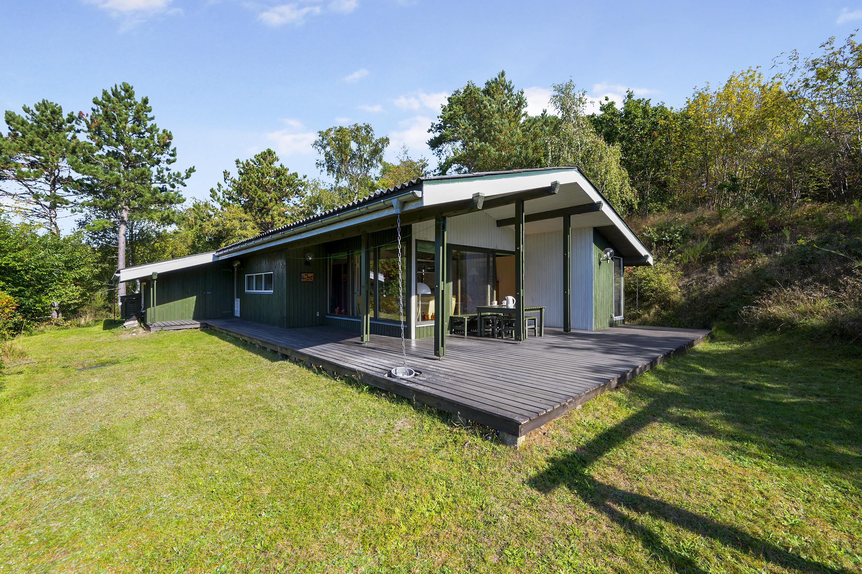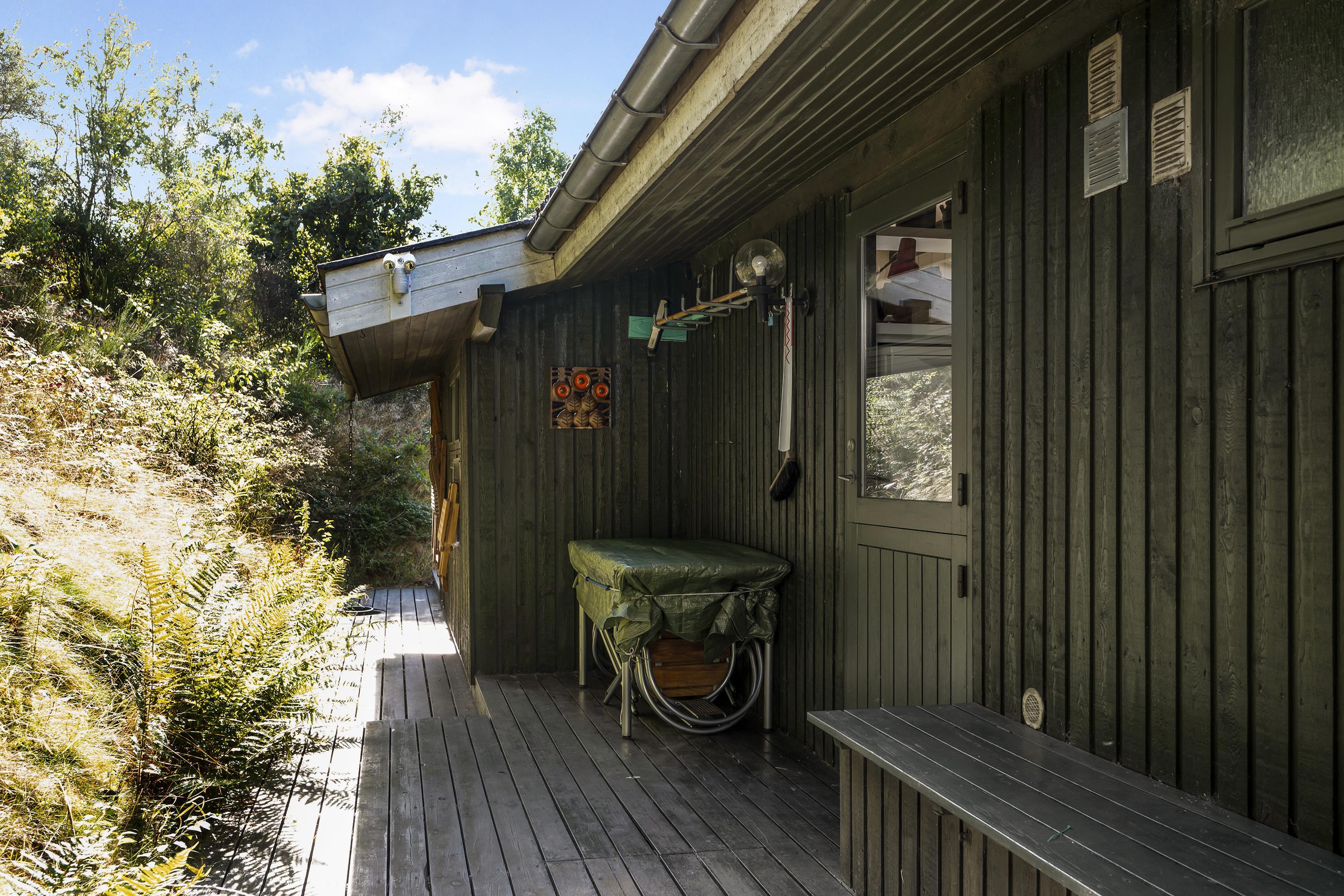 Dieses ältere, aber gepflegte und laufend modernisierte Ferienhaus liegt hoch und komplett ungestört auf einem hügeligen Naturgrundstück in einem attraktiven Ferienhausgebiet im Osten von Ebeltoft. Schöne und teilweise überdachte, nach Süden und Westen gewandte Holzterrasse auf drei Seiten des Hauses, mit Gartenmöbeln, Liegestühlen, Sonnenschirm und Grill. Auf dem Grundstück befindet sich eine Schaukel für die Kinder.