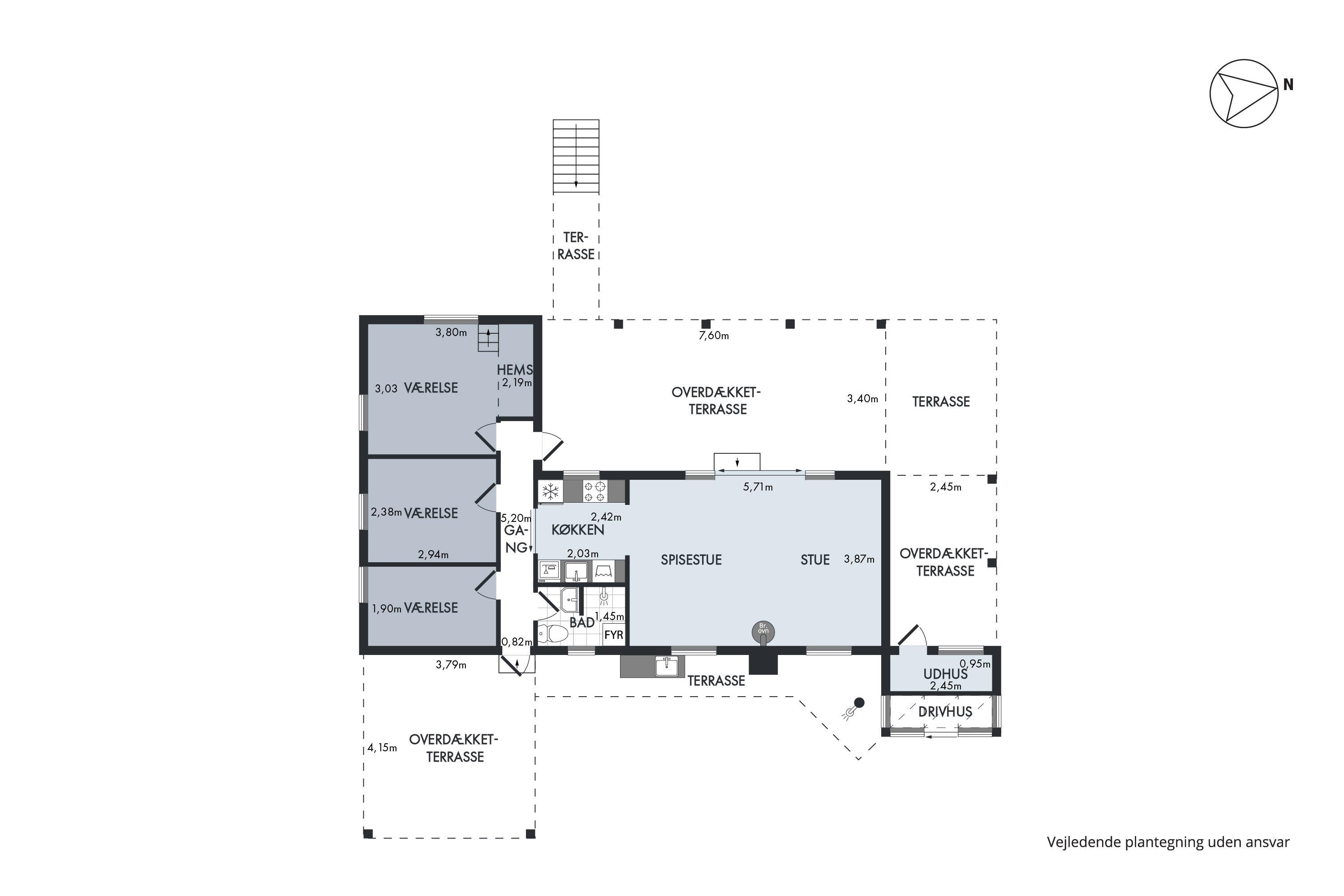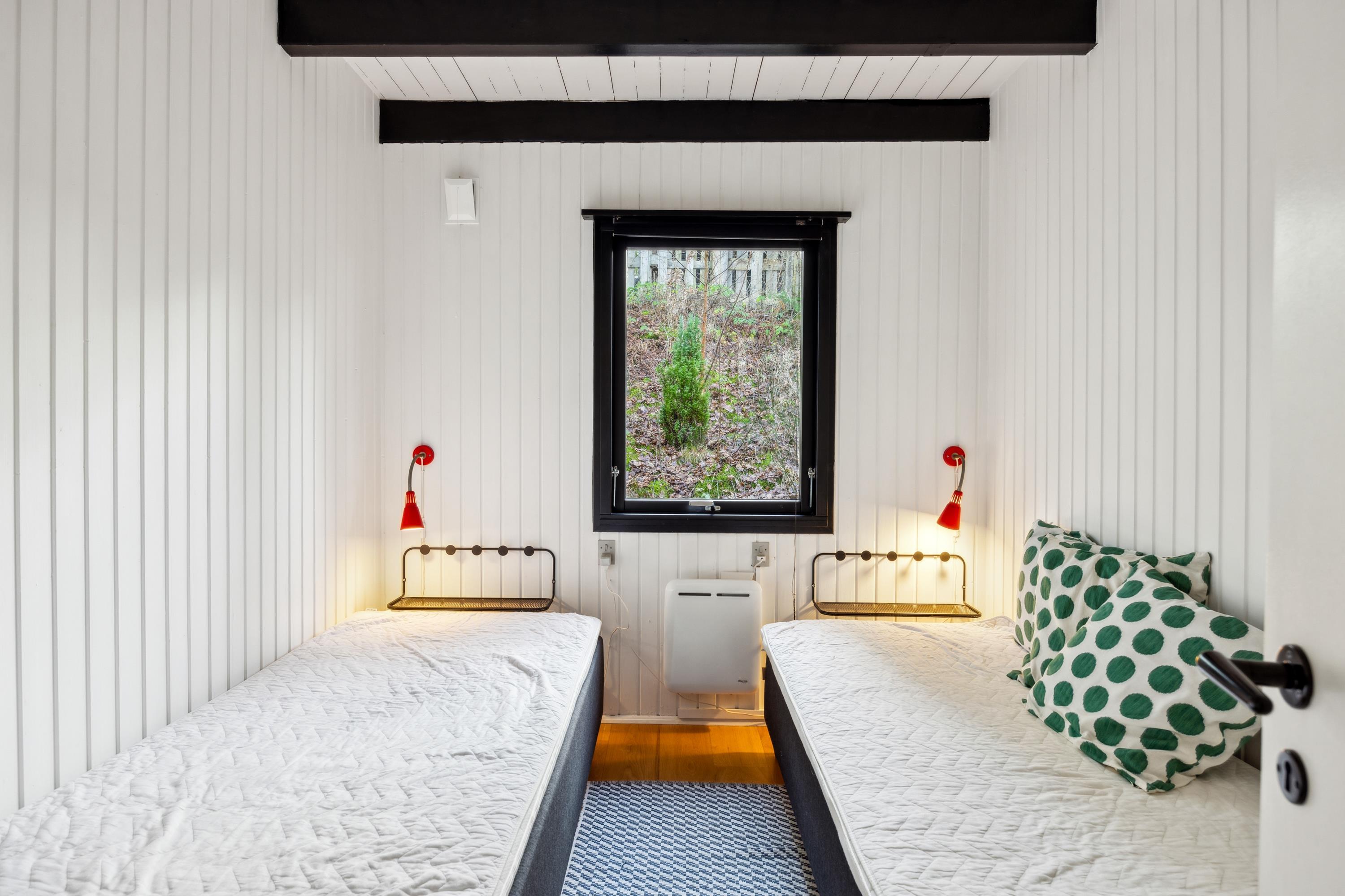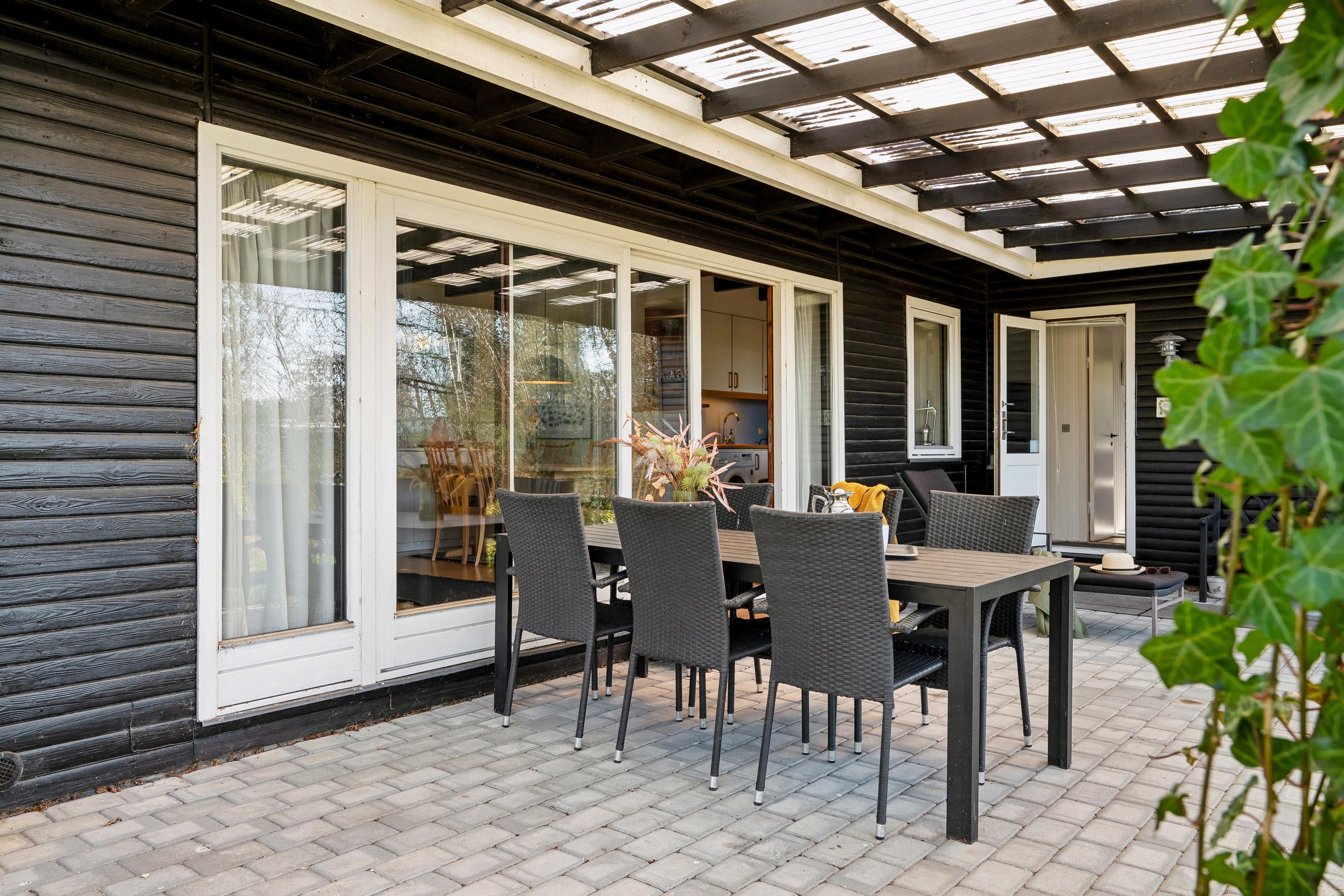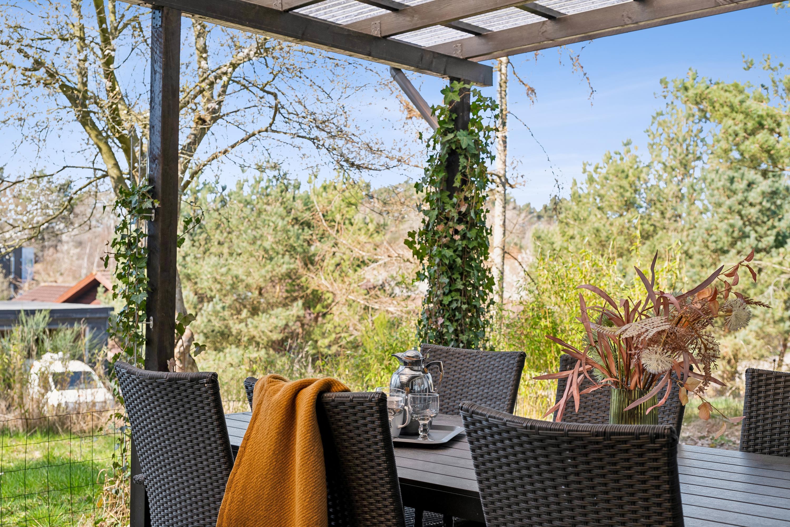 Die Schlafplätze verteilen sich auf drei Schlafzimmer: eines mit zwei Einzelbetten, eines mit einem Einzelbett und eines mit einem Doppelbett. Hinter dem Haus befindet sich eine weitere überdachte Terrasse – ebenfalls mit Gartenmöbeln und Grill.