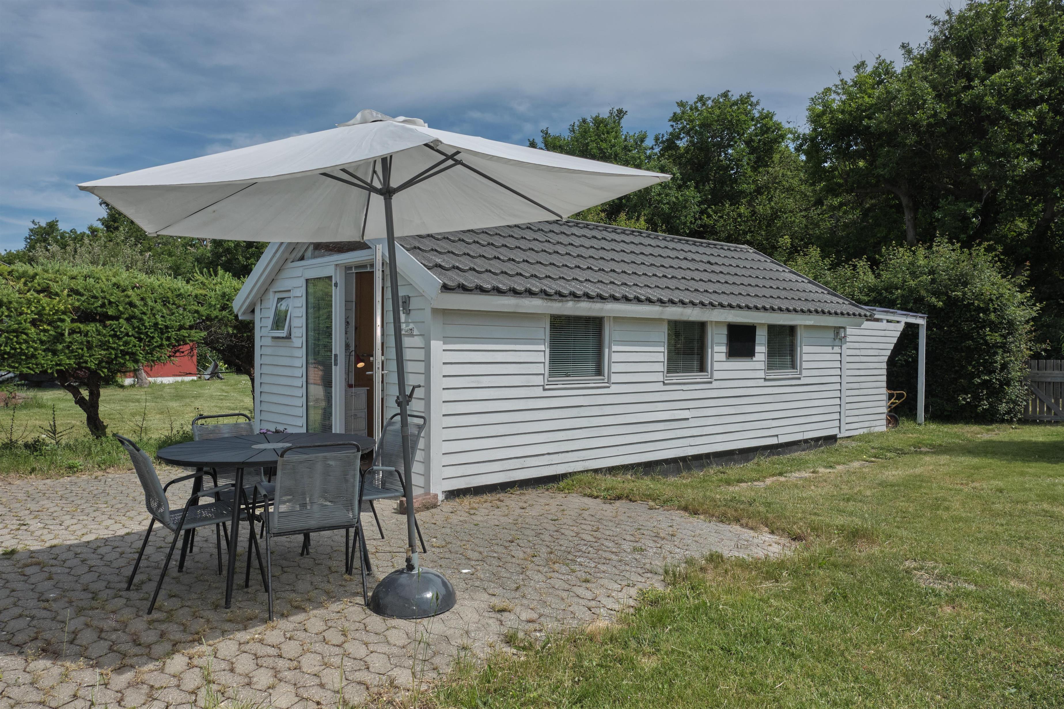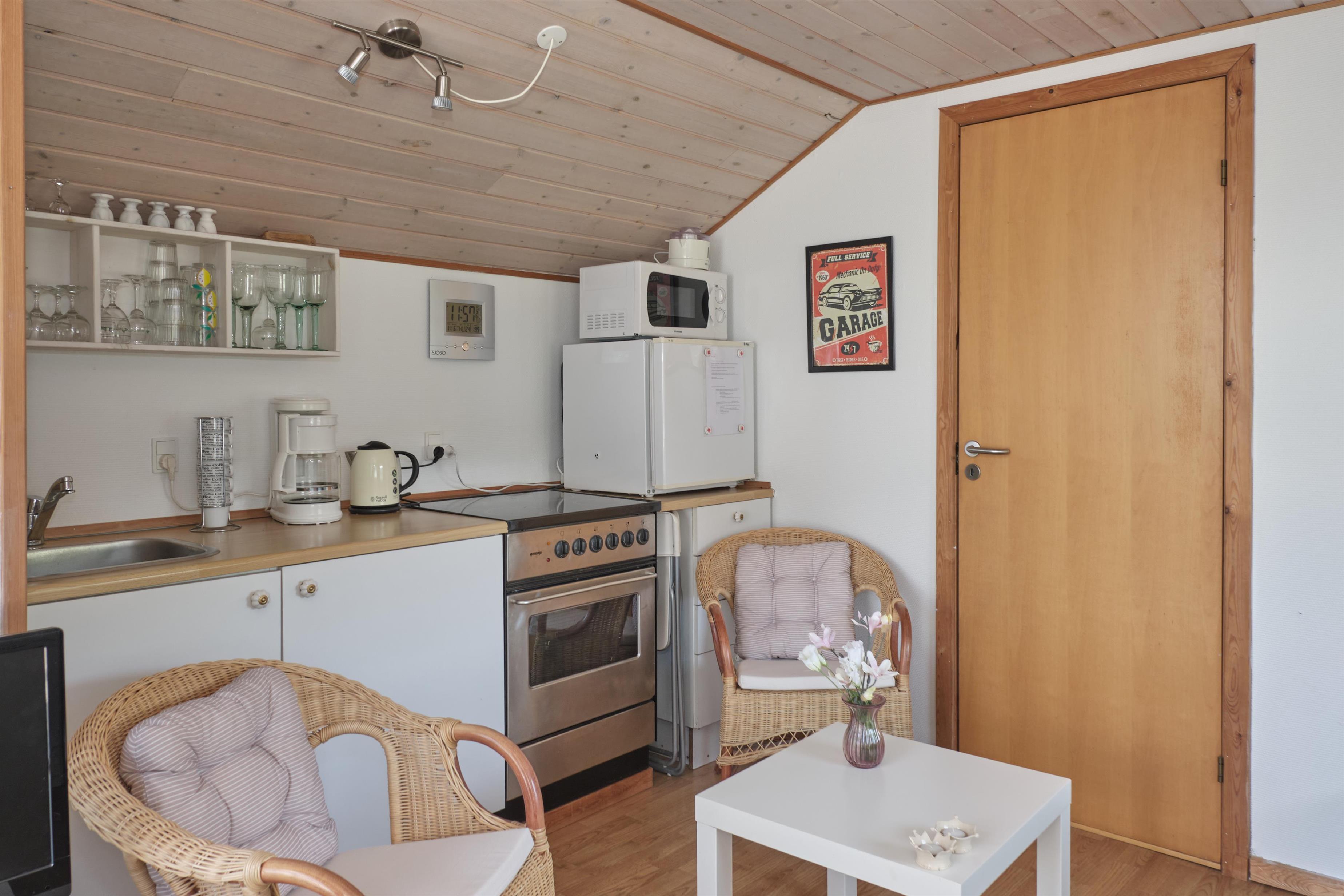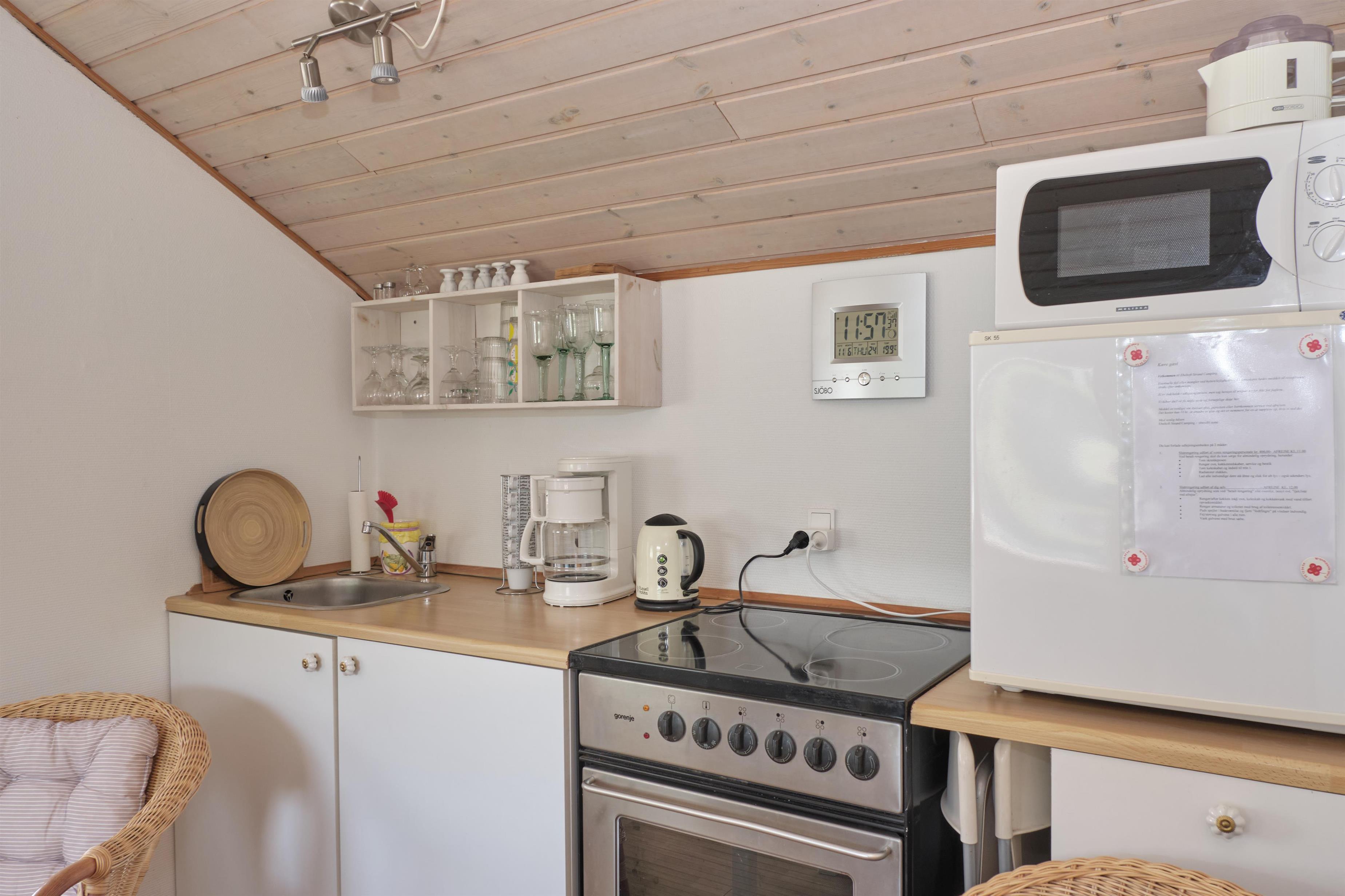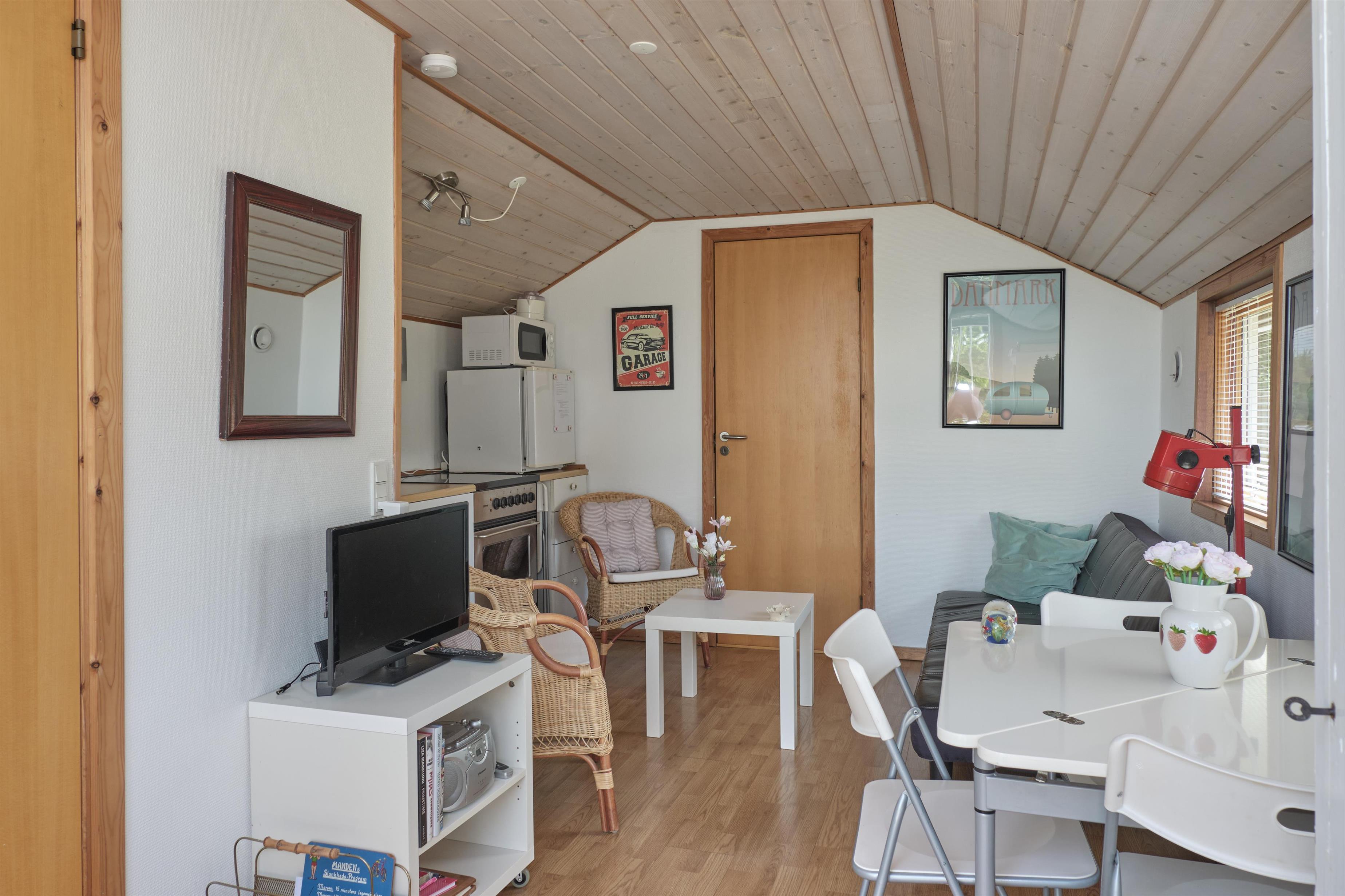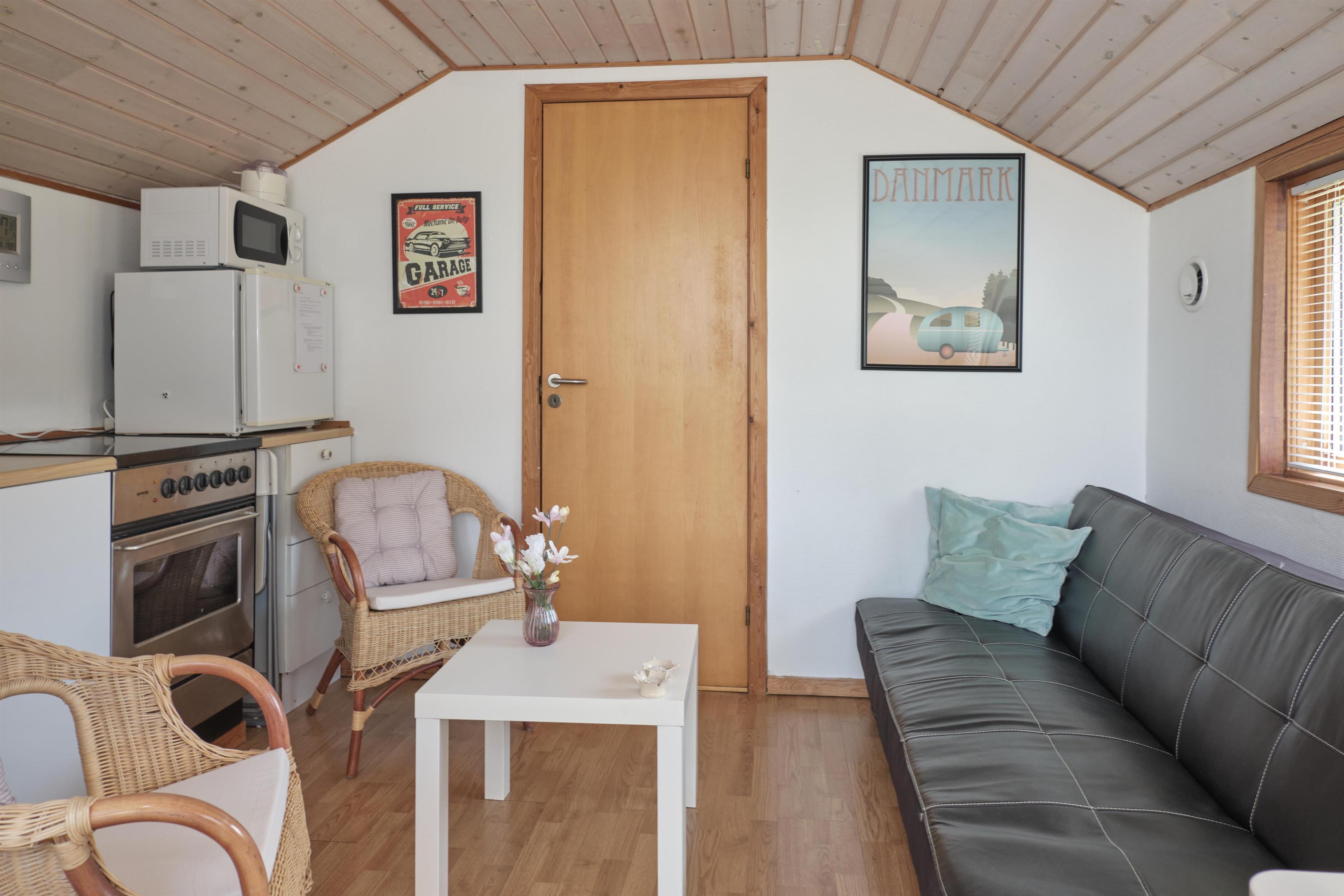 Durch eine Doppeltür kommt man von der Terrasse in den Wohnraum mit integrierter Küche, Essplatz für vier Personen, Sofa und Sesseln sowie TV mit dänischen Programmen (nur kostenlose). Die Küche ist mit Glaskeramikherd, kleinem Kühlschrank und Mikrowelle ausgestattet. Hinter dem Wohnraum liegt das geräumige Schlafzimmer mit Doppelbett und Etagenbett (insgesamt vier Schlafplätze). Außerdem gibt es ein Schlafsofa im Wohnraum. Praktisches, gefliestes Badezimmer mit Dusche.