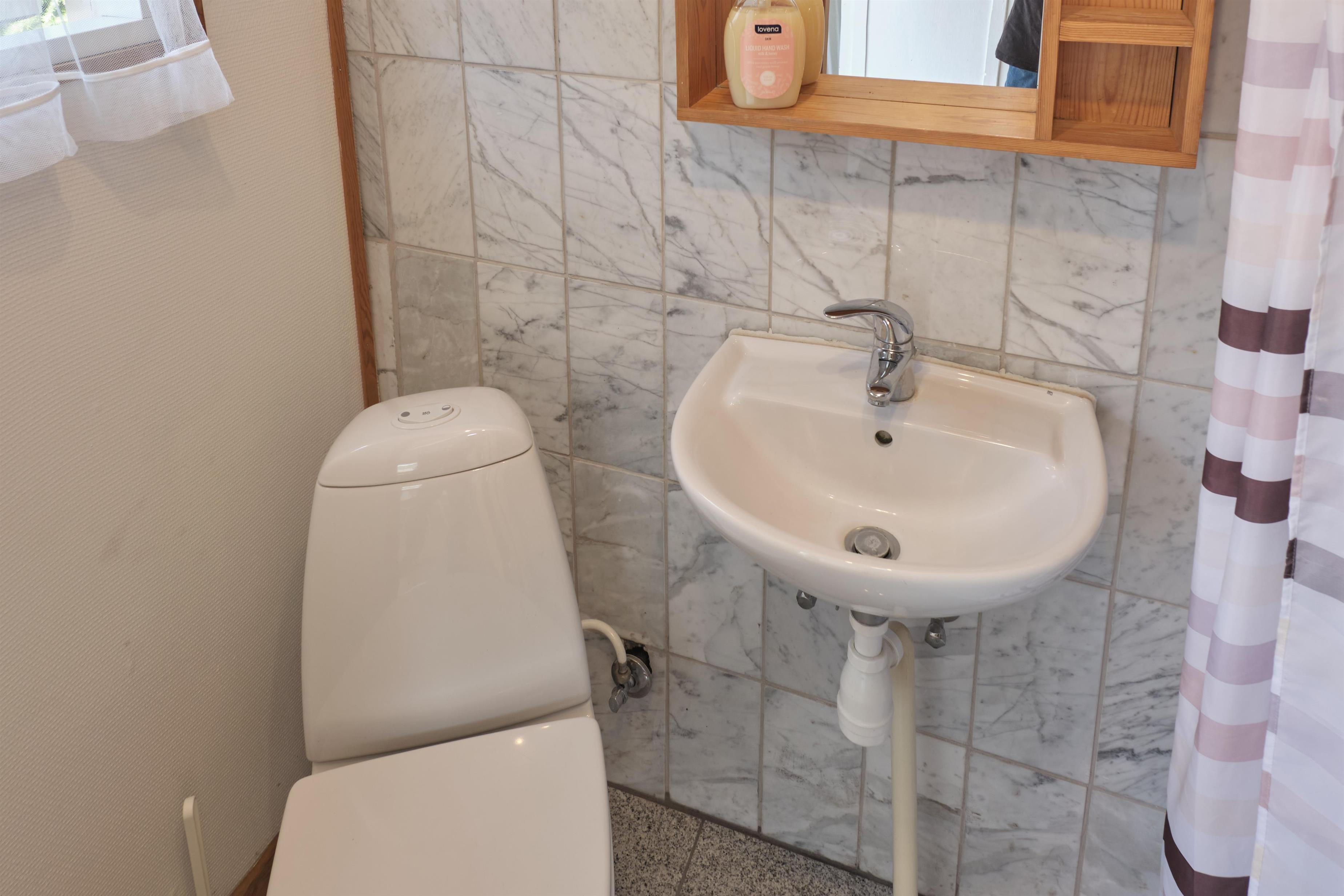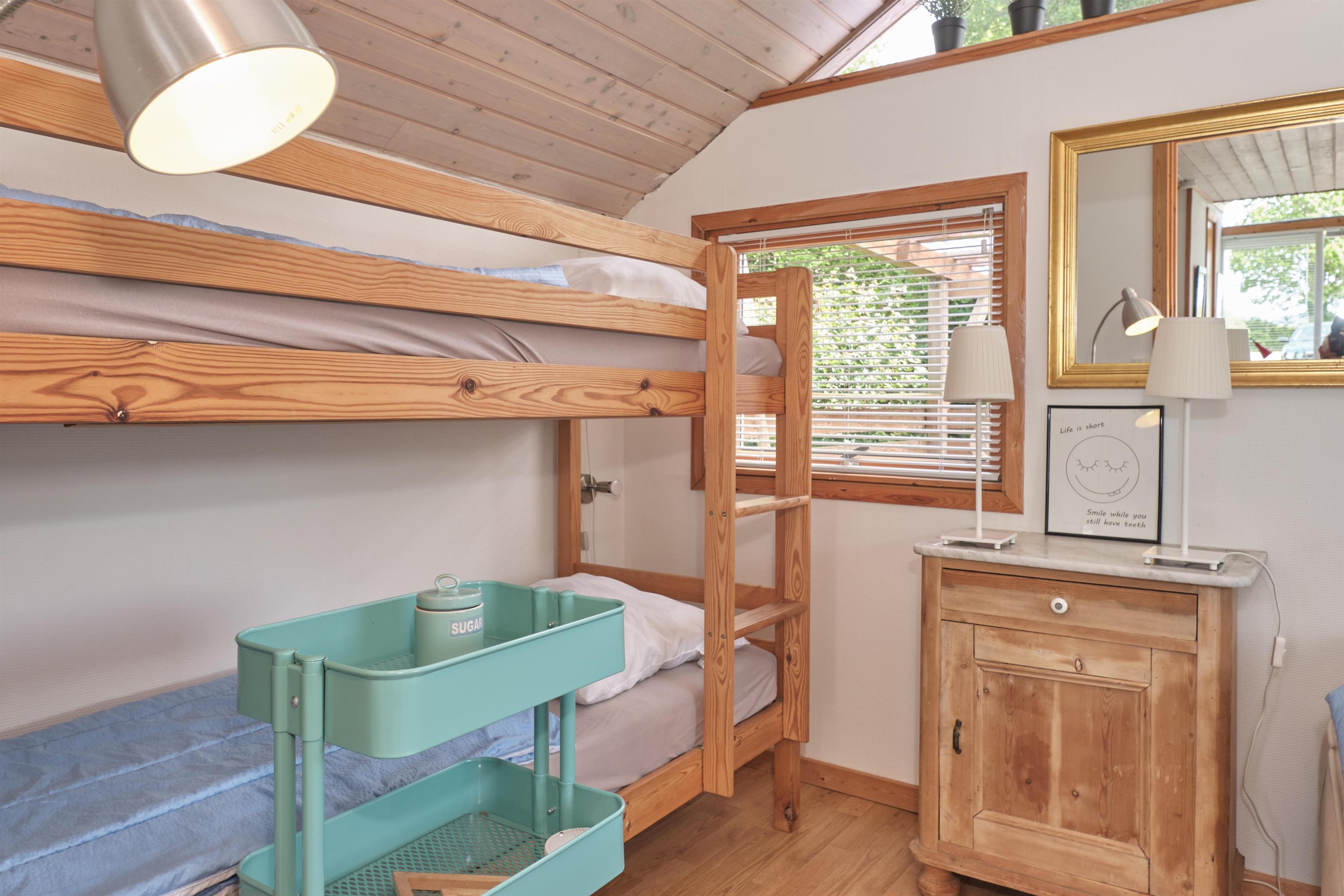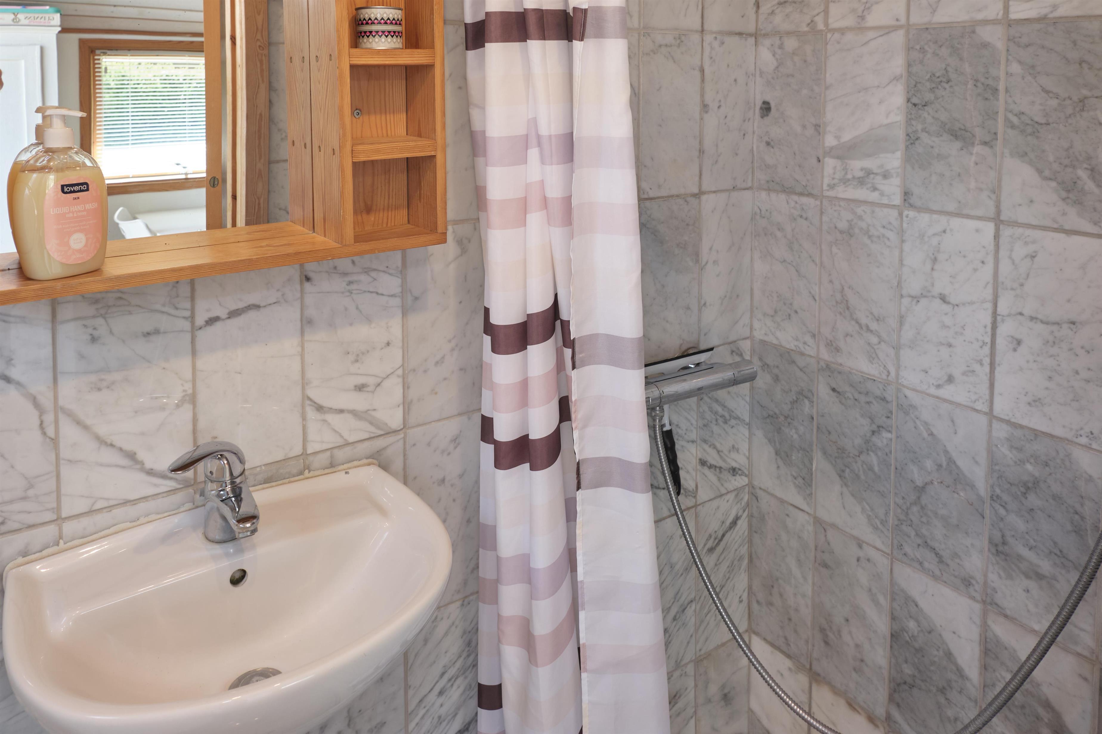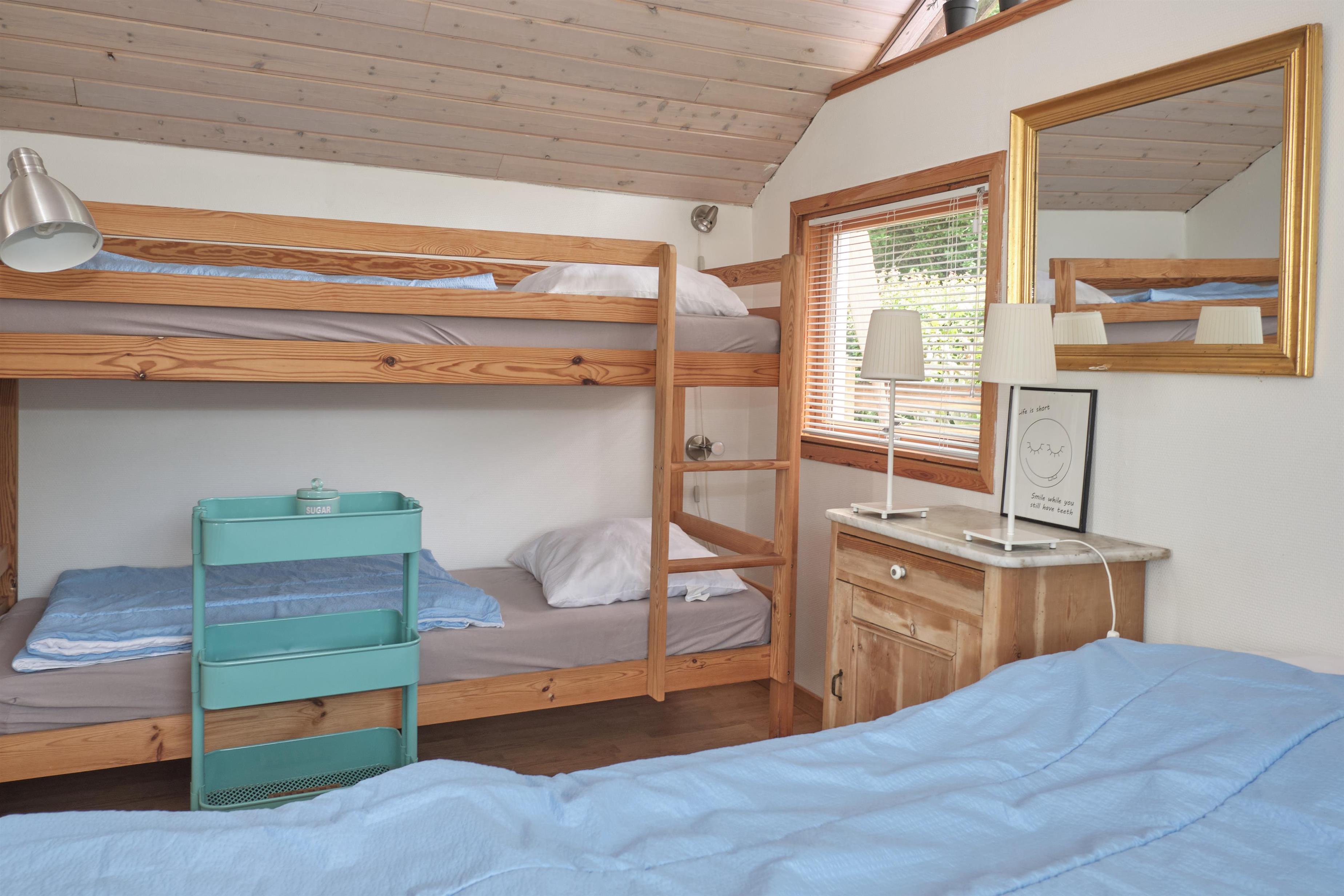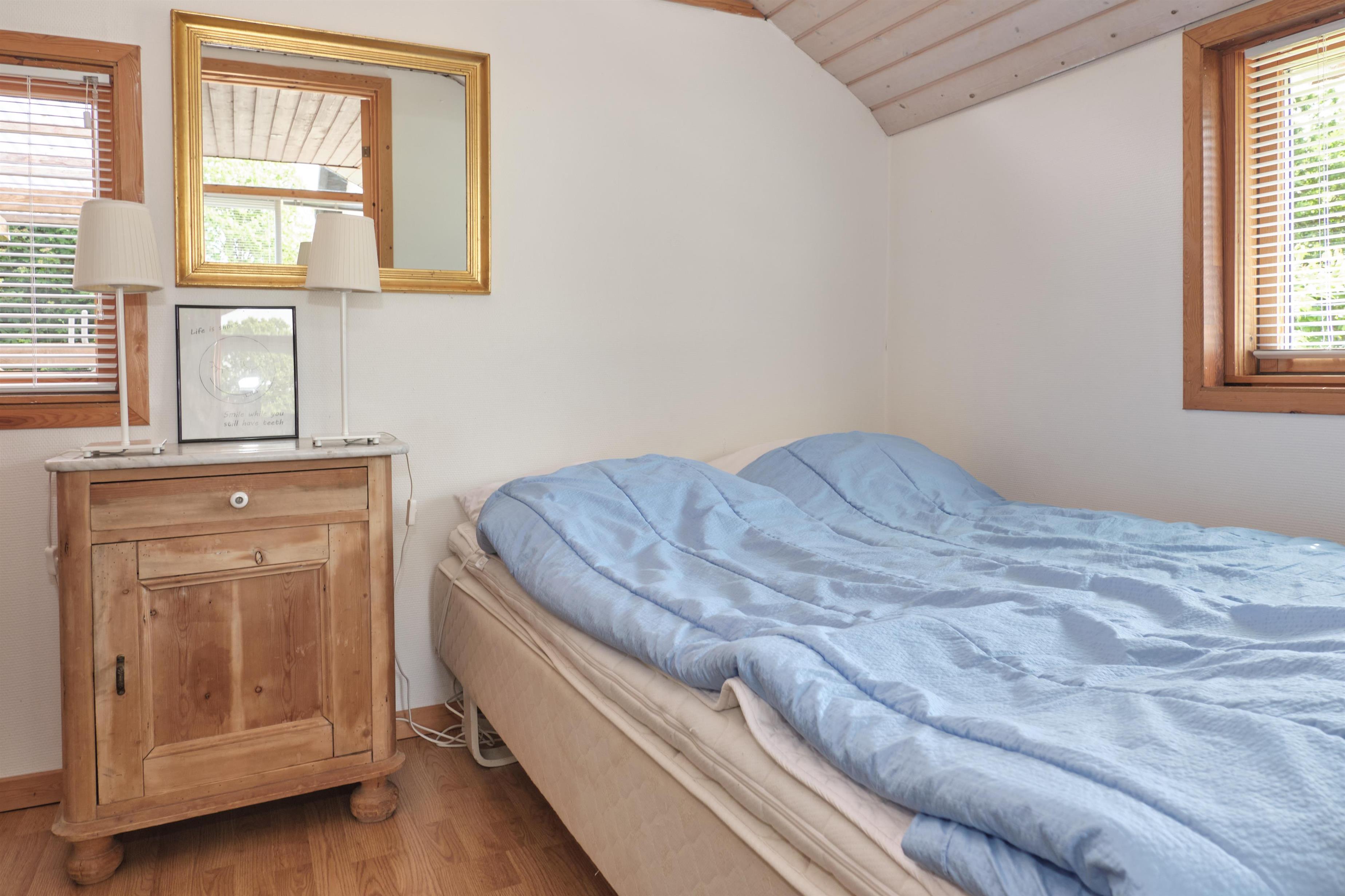 Durch eine Doppeltür kommt man von der Terrasse in den Wohnraum mit integrierter Küche, Essplatz für vier Personen, Sofa und Sesseln sowie TV mit dänischen Programmen (nur kostenlose). Die Küche ist mit Glaskeramikherd, kleinem Kühlschrank und Mikrowelle ausgestattet. Hinter dem Wohnraum liegt das geräumige Schlafzimmer mit Doppelbett und Etagenbett (insgesamt vier Schlafplätze). Außerdem gibt es ein Schlafsofa im Wohnraum. Praktisches, gefliestes Badezimmer mit Dusche.
