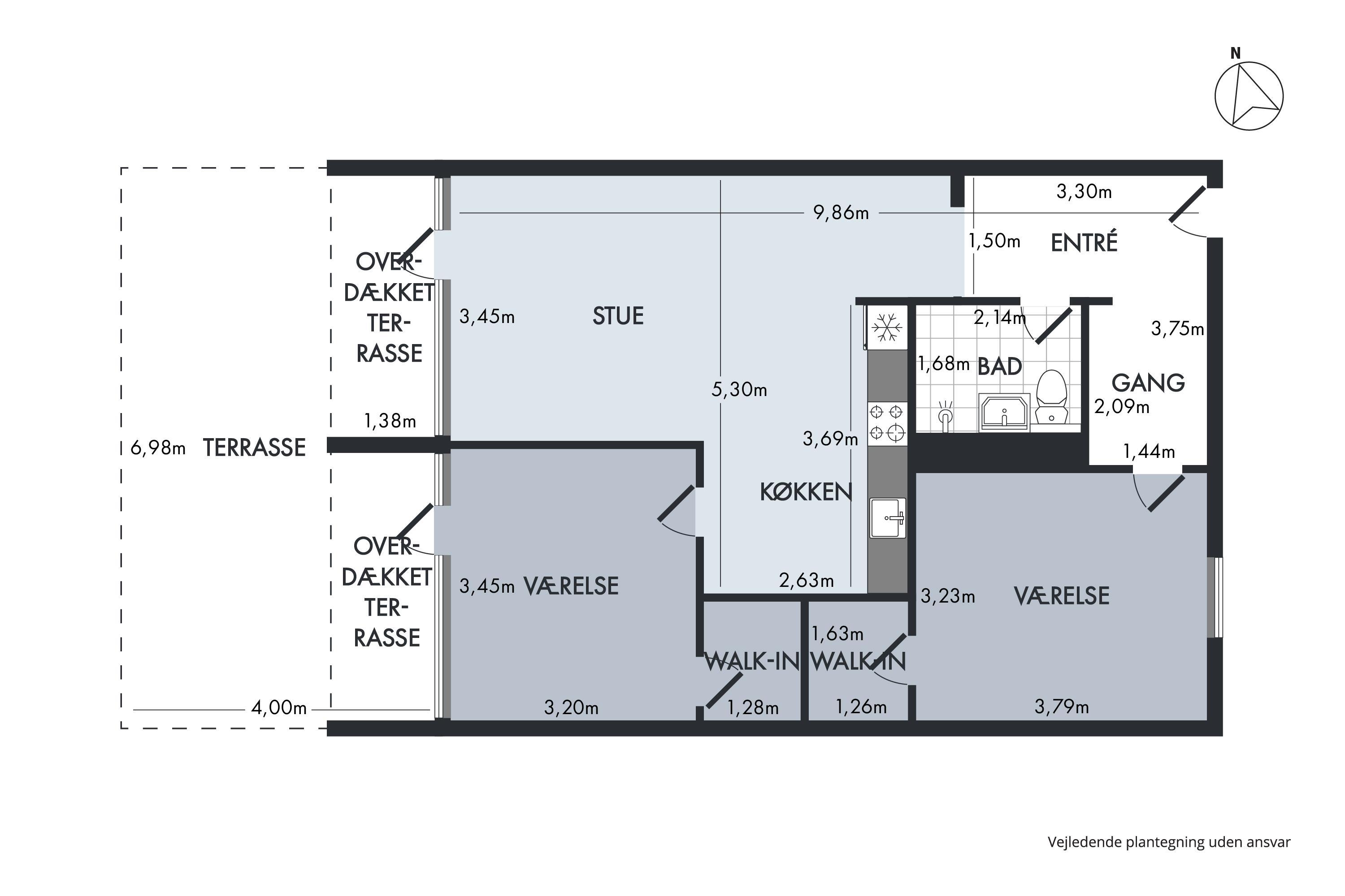 Von dem großzügigen Flur betritt man das helle Wohnzimmer in offener Verbindung mit der Küche und mit Zugang zur Terrasse. Hier befindet sich eine Essecke für 4 Personen, großzügige Sofagarnitur und Fernseher mit kostenlosen dänischen Sendern.
