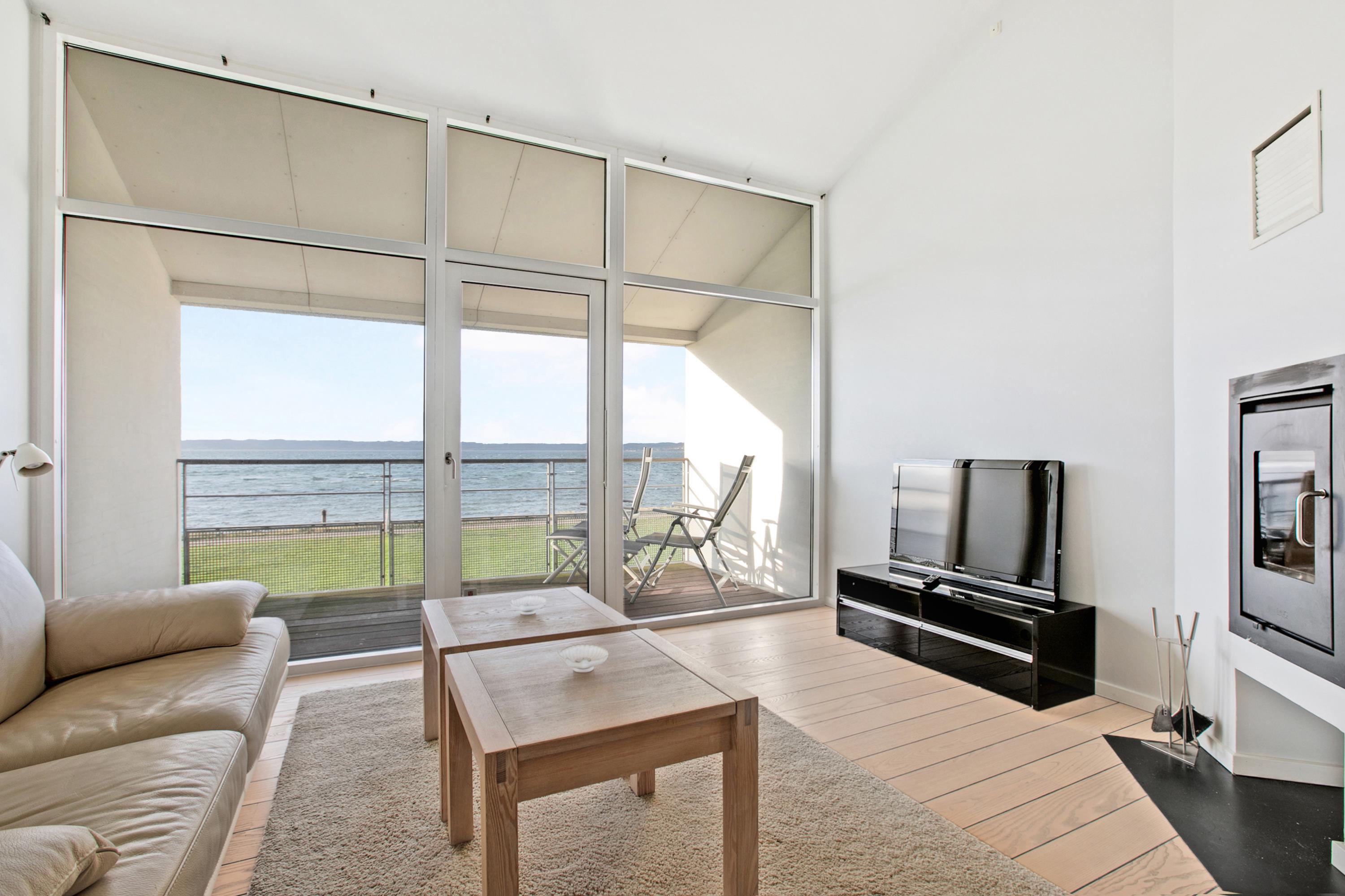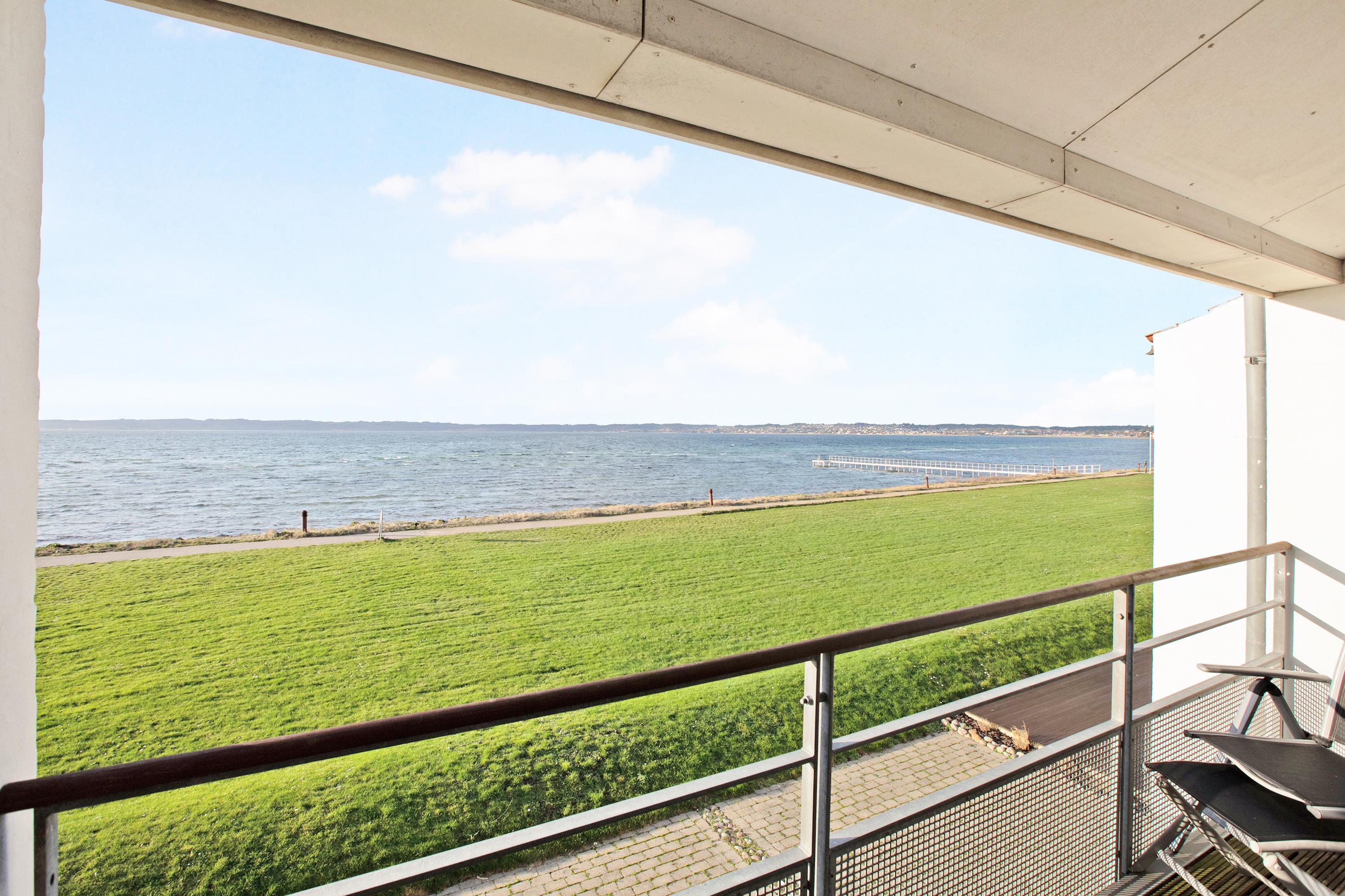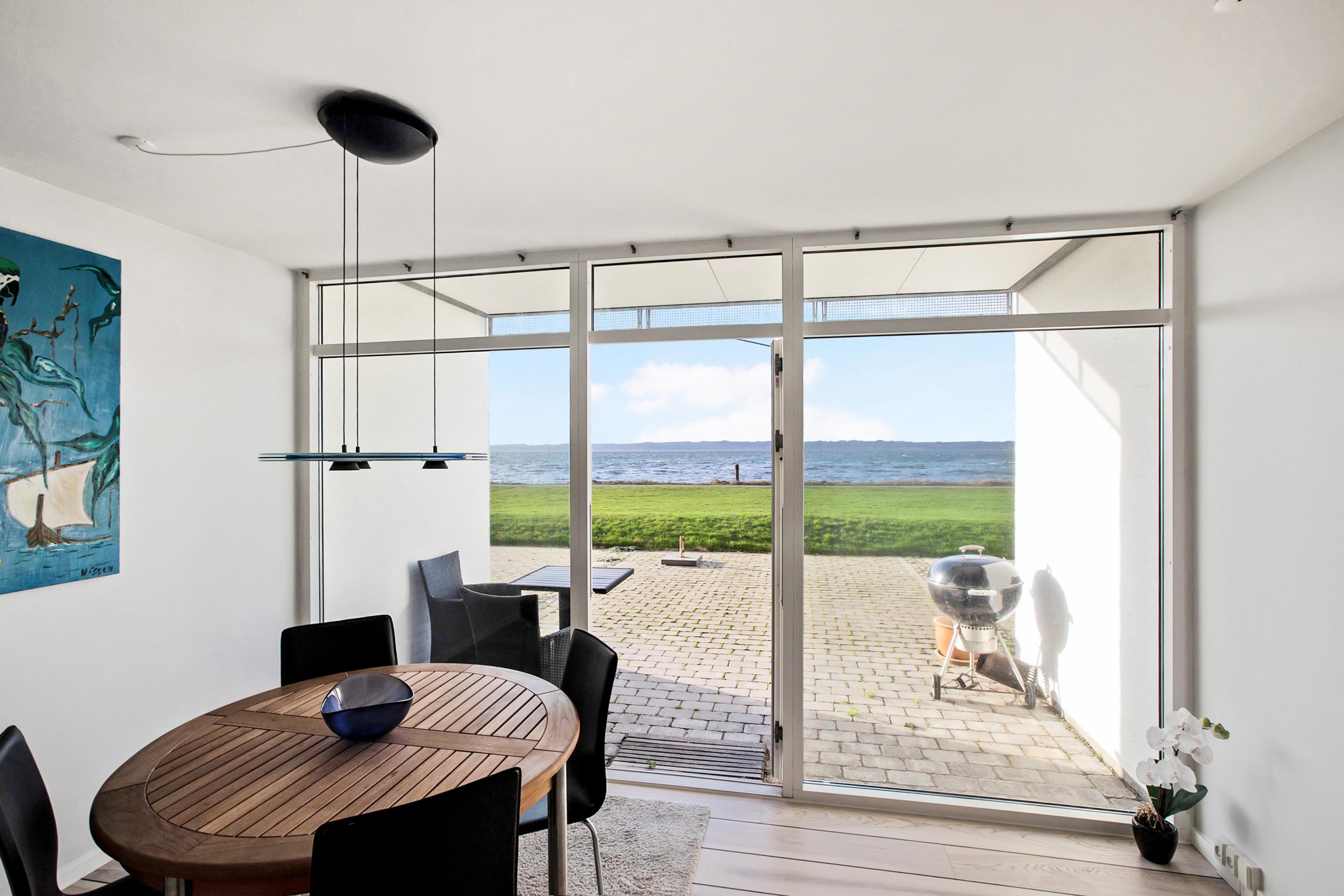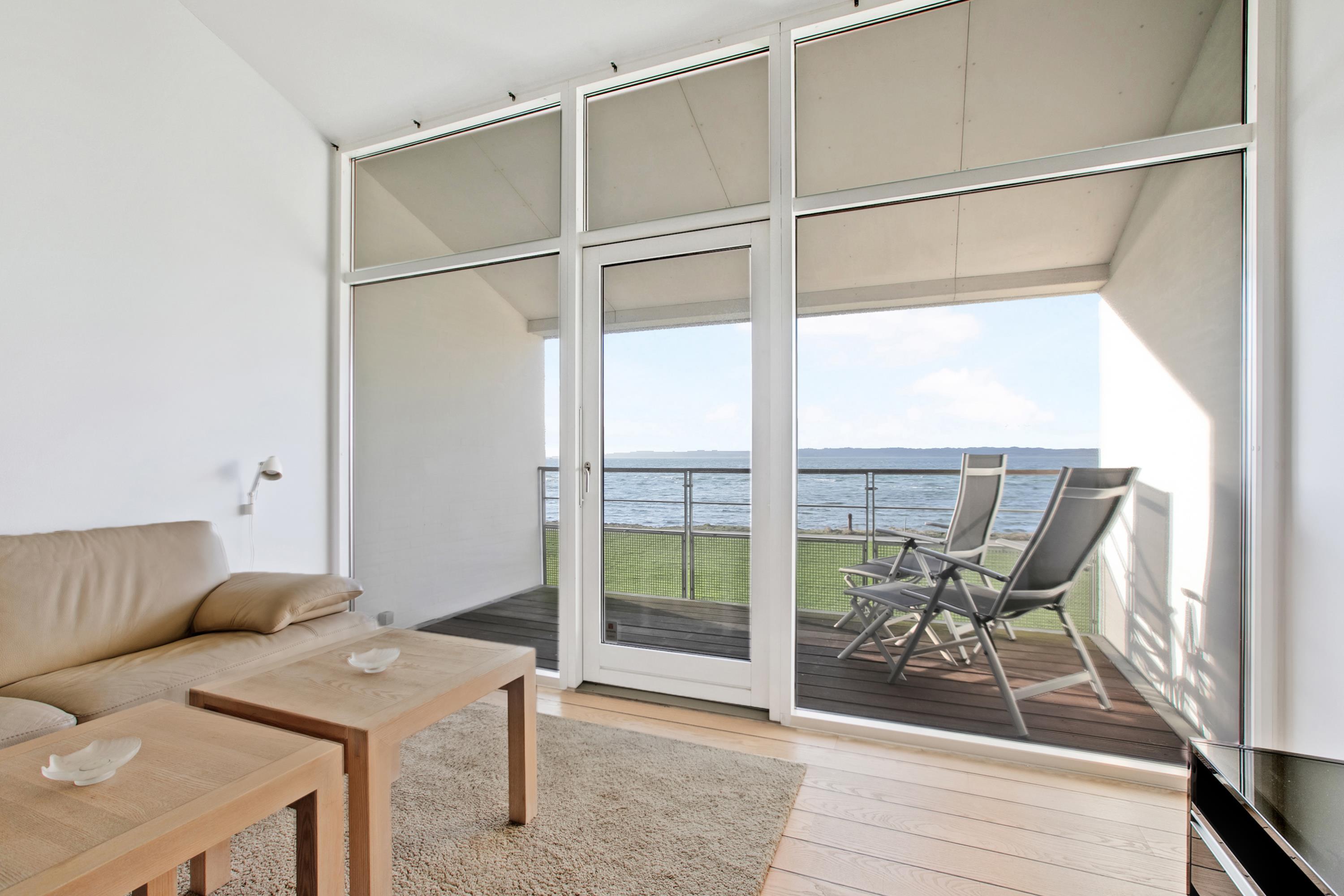 Helle Ferienwohnung in erster Reihe mit Blick auf die Bucht Ebeltoft Vig und Nähe zum kinderfreundlichen Strand.