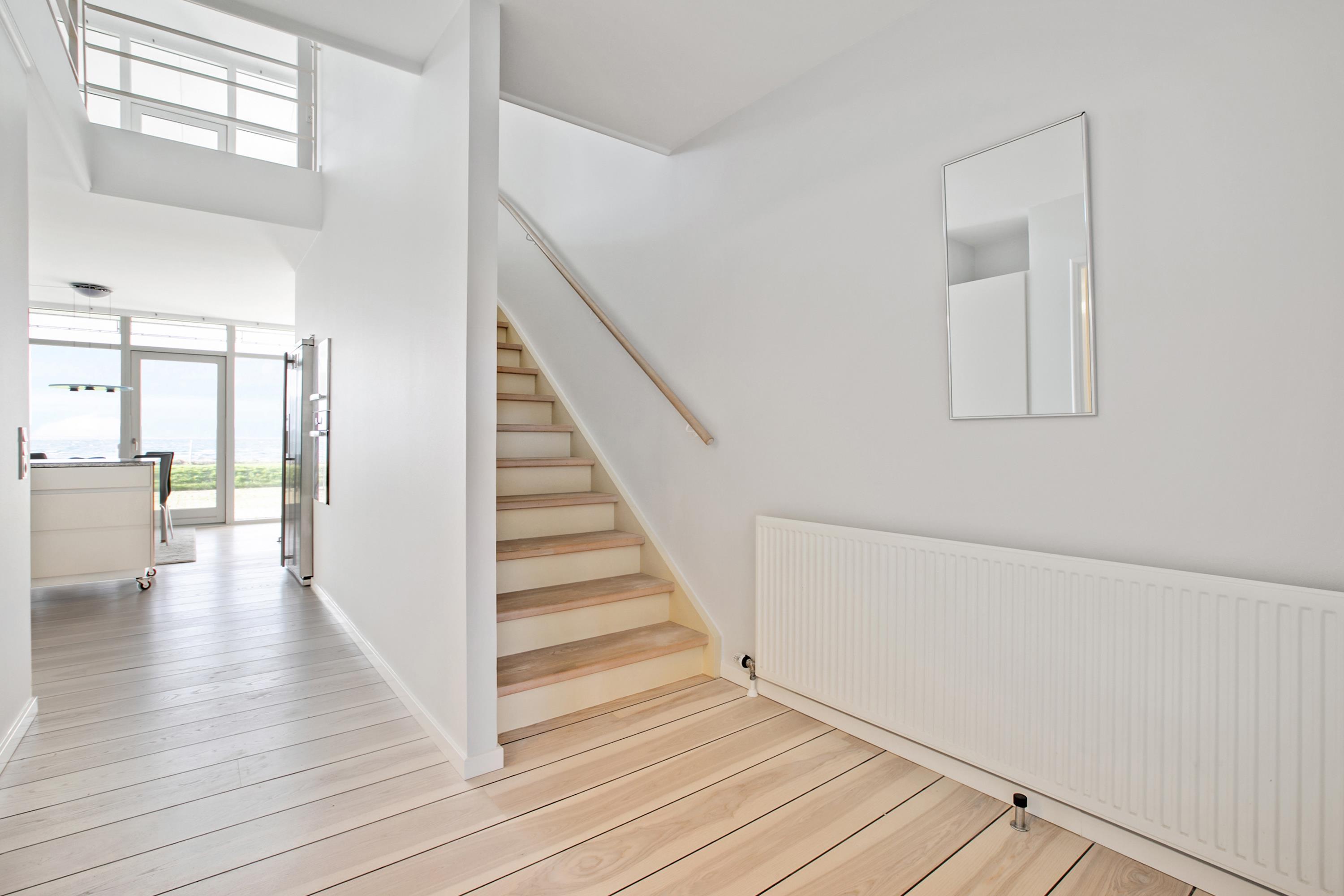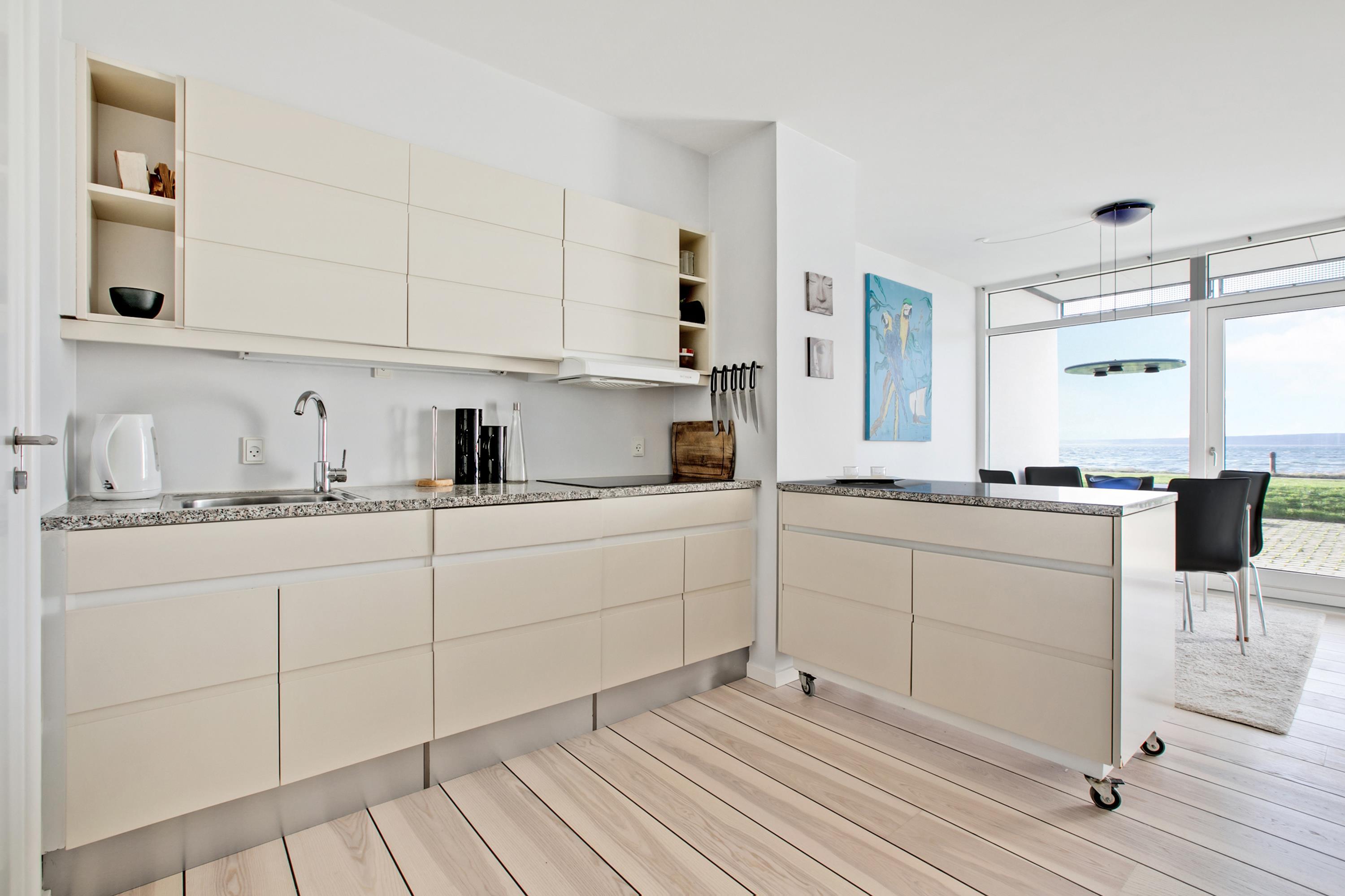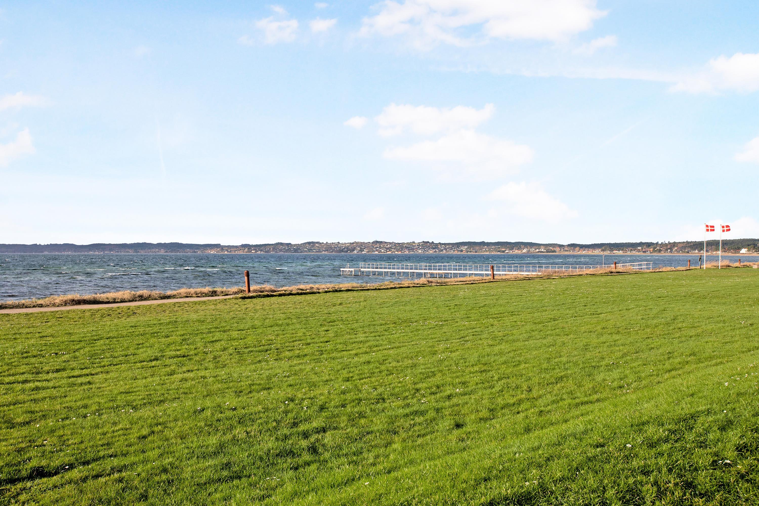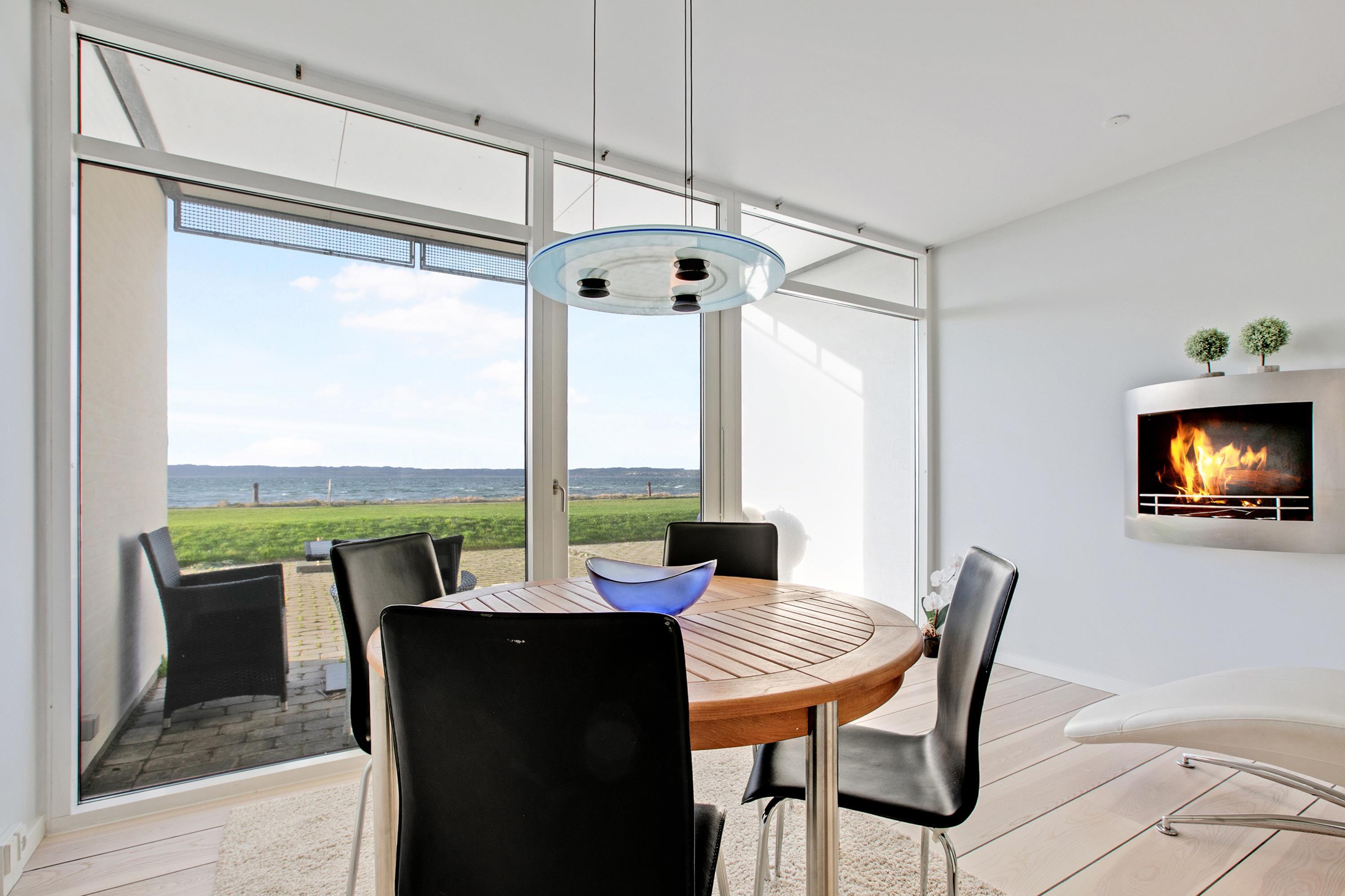 Helle Ferienwohnung in erster Reihe mit Blick auf die Bucht Ebeltoft Vig und Nähe zum kinderfreundlichen Strand.