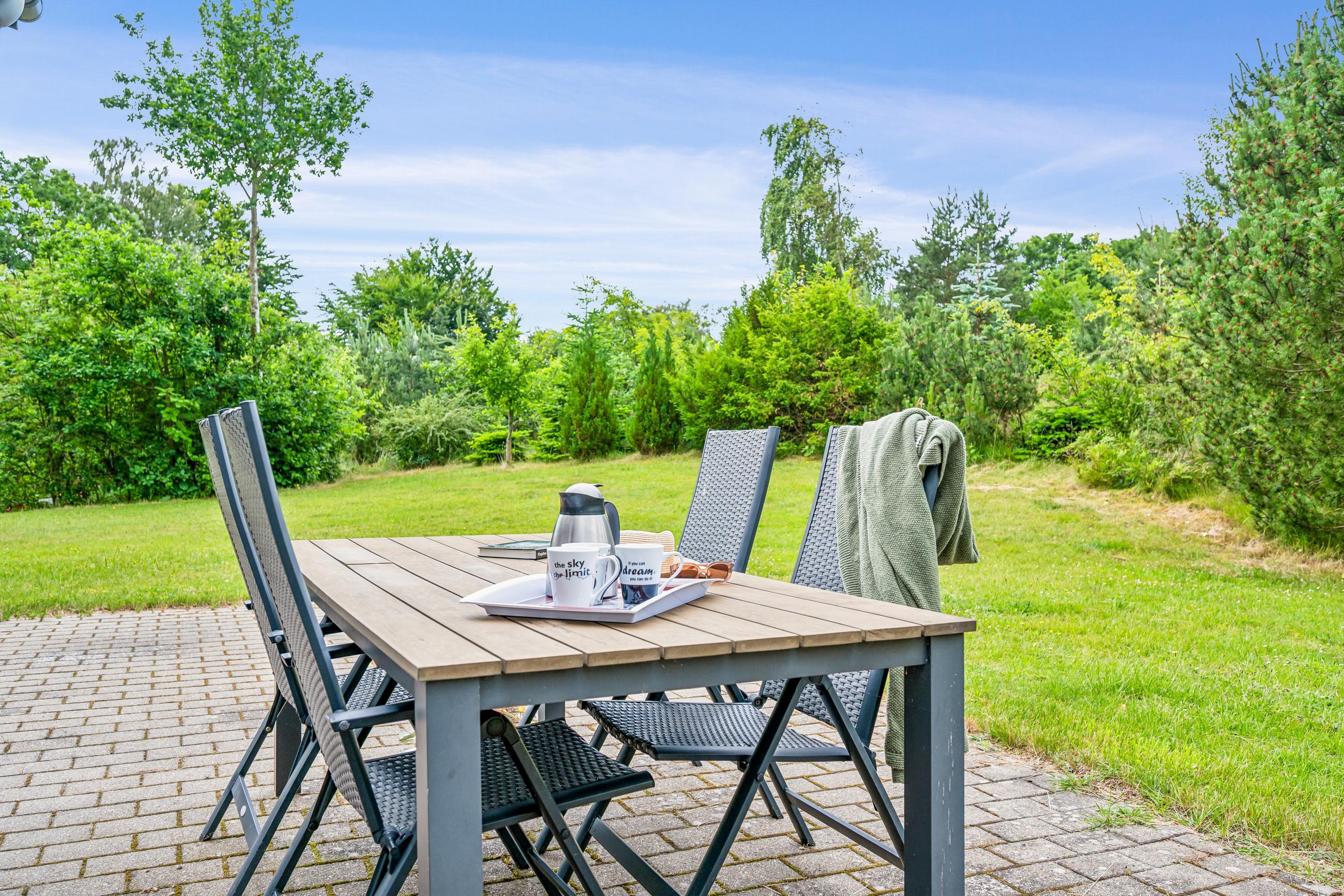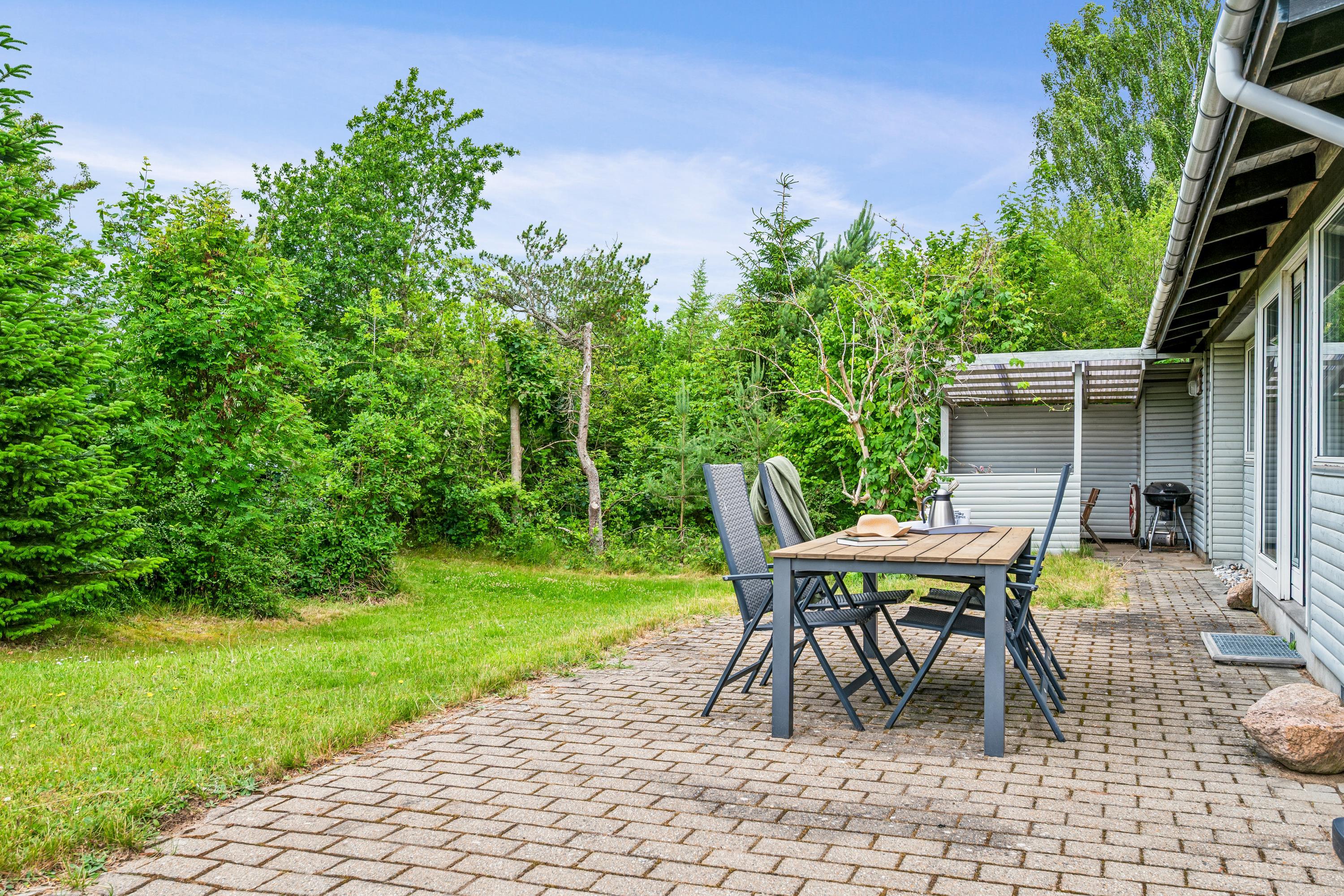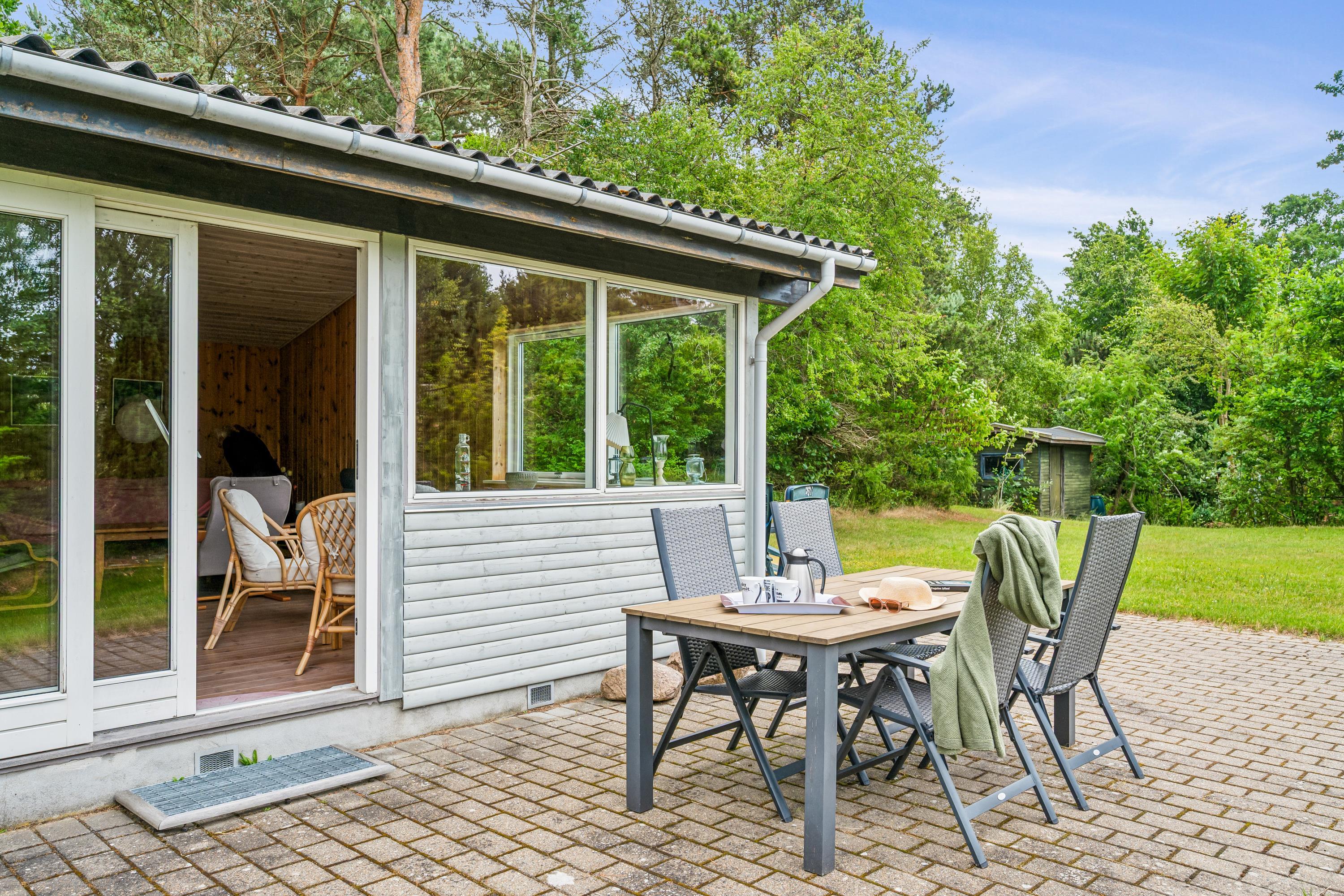 Das Haus liegt auf einem wirklich schönen, bewachsenen Grundstück mit gemütlichen Ecken. Zum Haus gehören sowohl eine überdachte als auch eine offene Terrasse mit Gartenmöbeln, Liegestühlen und Grill. Das Haus liegt nur 100 Meter von einem schönen Naturpfad entfernt. Die Lage in Vibæk Strand ist ein gemütliches und kinderfreundliches Gebiet, nahe an einem guten Sandstrand und mit guten Einkaufsmöglichkeiten in fußläufiger Entfernung vom Haus. Die Stadt Ebeltoft mit ihren vielen Attraktionen und Sehenswürdigkeiten ist nur 5 Autominuten entfernt. Am Hafen befindet sich das Glasmuseum, das führend in moderner Glaskunst ist. Hier findet man auch mehrere gute Restaurants und Geschäfte sowie die Möglichkeit, frisch gefangenen Fisch zu kaufen. In Ebeltoft befindet sich auch das Alte Rathaus, zu dem Menschen von nah und fern kommen, um zu heiraten. In der Sommerzeit kann man hier außerdem um 20 und 21 Uhr die Nachtwächter treffen, die singend durch die Straßen auf ihrer Abendrunde gehen. Eine Viertelstunde Autofahrt vom Haus entfernt liegt der Ree Park. Dort besteht die Möglichkeit, auf Jeep-Safari zu gehen und die wilden Tiere ganz nah zu erleben. Etwa eine halbe Stunde Autofahrt vom Haus entfernt befinden sich das Kattegatcenter in Grenaa, wo man beim Füttern der großen Haie mithelfen kann, und der größte Freizeitpark Skandinaviens.