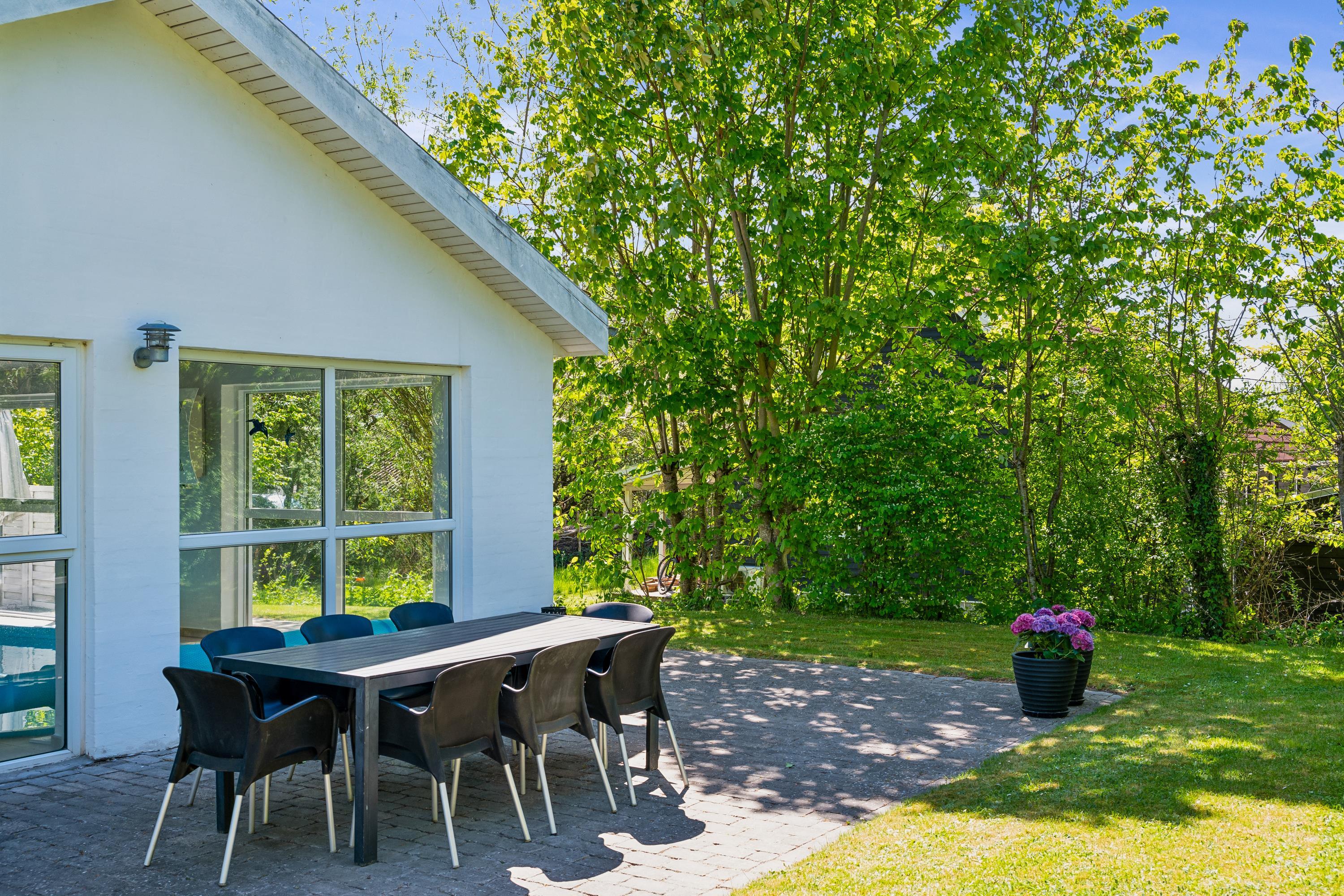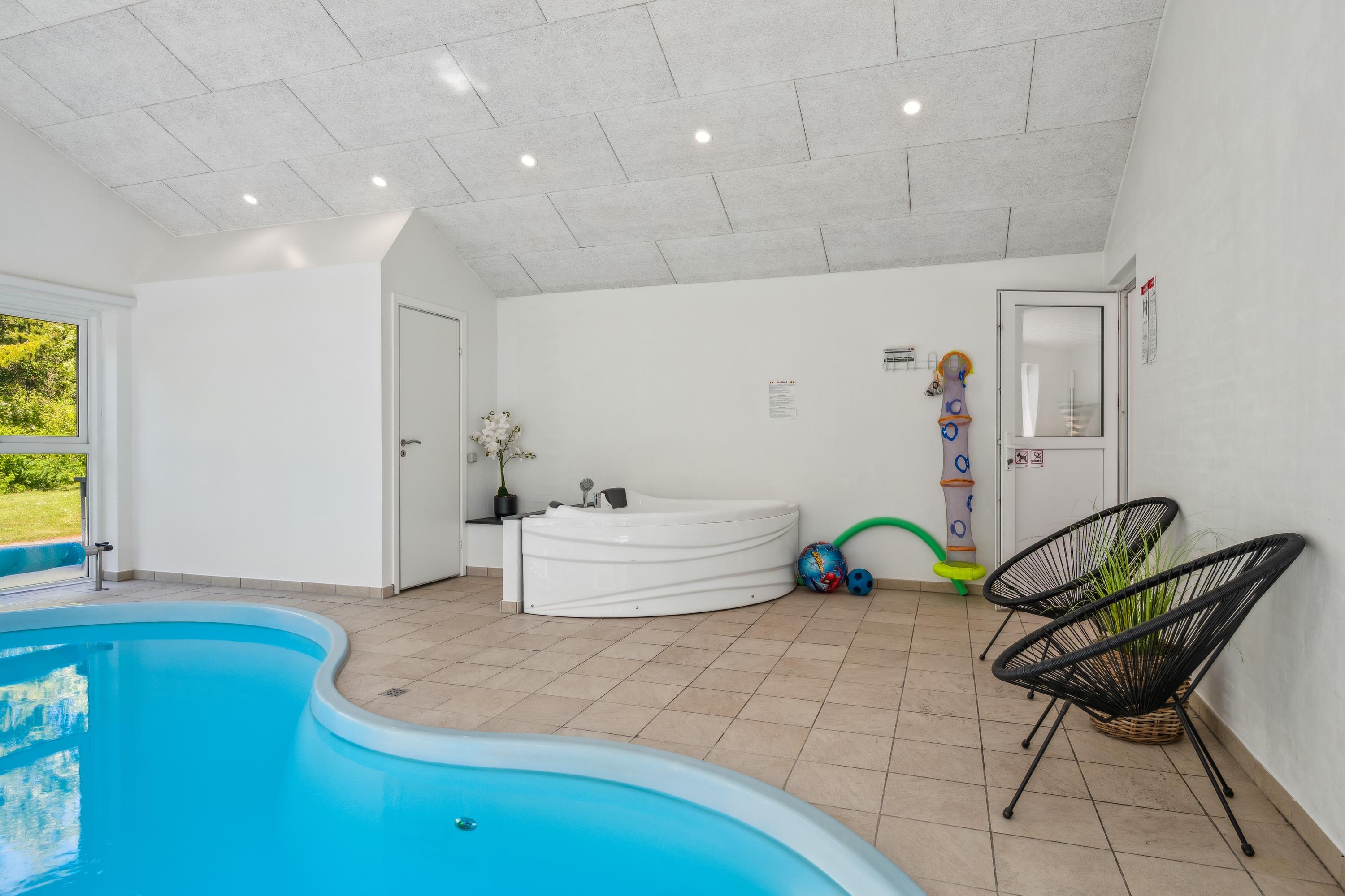 Äußerst gut ausgestattetes und gepflegtes Ferienhaus mit Innenpool, zentral gelegen im beliebten Gebiet bei Egsmark Strand, nicht weit von einem schönen Badestrand mit Badesteg und vom malerischen Städtchen Ebeltoft entfernt. Große Terrasse mit gutem Windschutz, Zugang von Wohnzimmer und Poolraum, und ausgestattet mit Terrassenheizung, Gartenmöbeln, Liegestühlen und Grill. Auf dem Grundstück gibt es Sandkasten, Fußballtor, Schaukel, Rutsche und eine Feuerstelle.