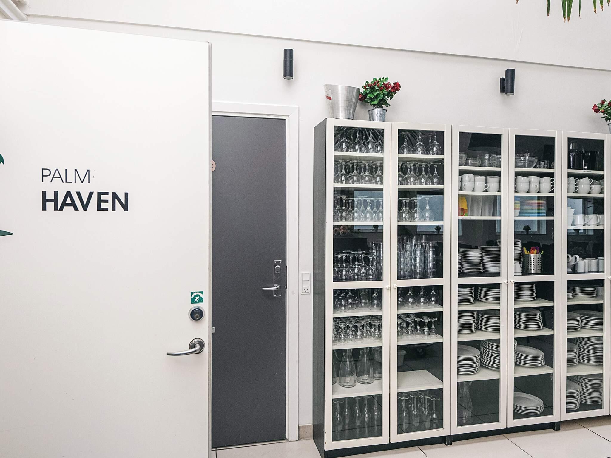 Im Gemeinschaftsraum gibt es u.a. einen großen Essbereich für bis zu 36 Personen und eine große, offene Küche in der das Festmahl und weitere Mahlzeiten zubereitet werden können. Diese ist u.a. mit zwei Kochherden, zwei Geschirrspülern und einem großen Kühlschrank umfassend ausgestattet, damit hier für entsprechend viele Menschen gekocht werden kann.