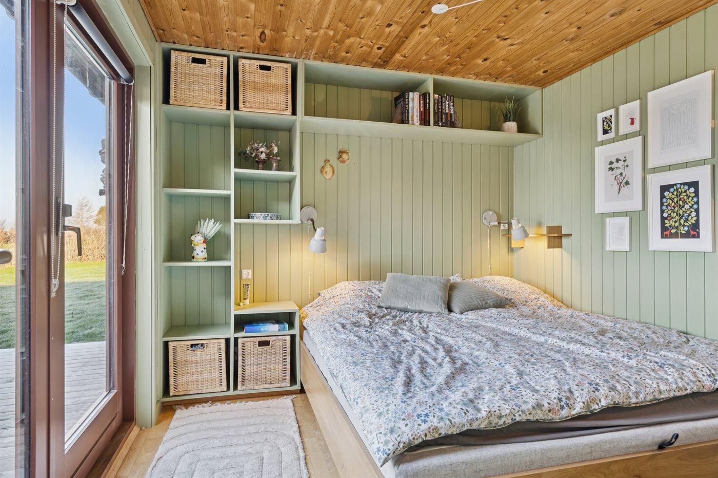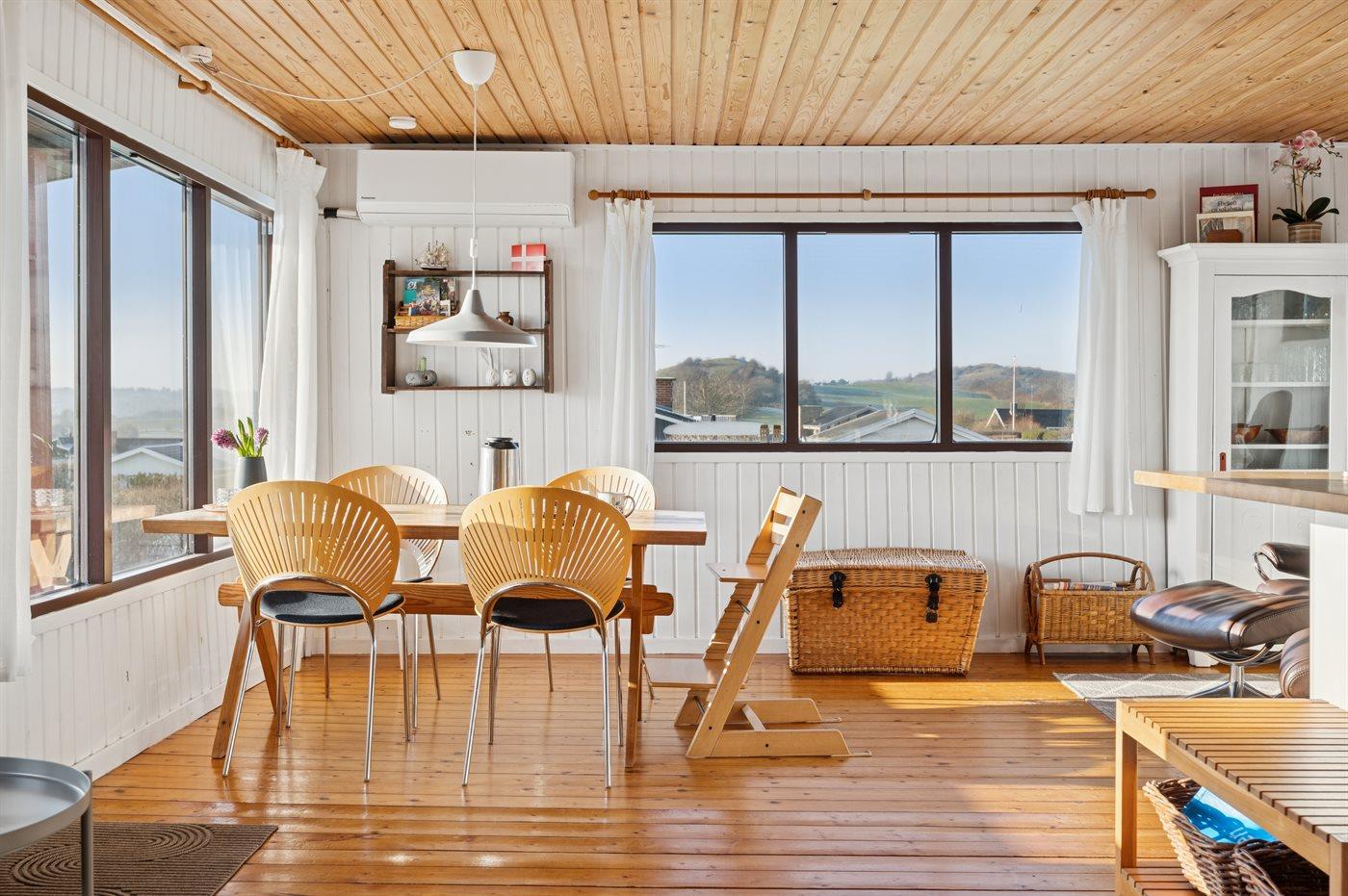 Hoch in den Hügeln von Dråby liegt dieses gemütliche Ferienhaus mit Blick über die Umgebung und das Wasser.