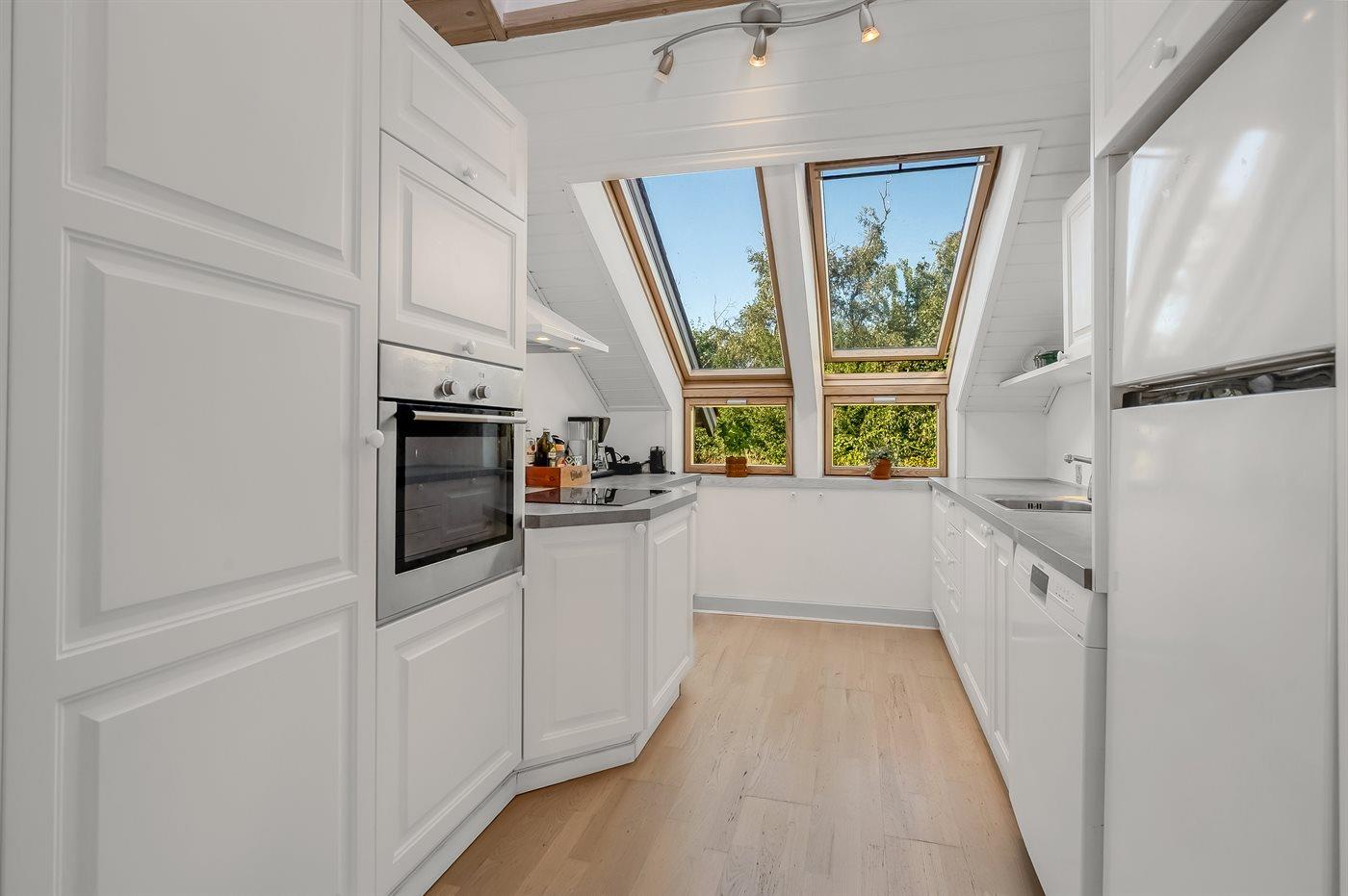 Die Küche ist mit Kühlschrank ausgestattet. Außerdem gibt es 4 Induktions-Kochzonen, Umluftofen, Mikrowelle sowie Geschirrspüler.