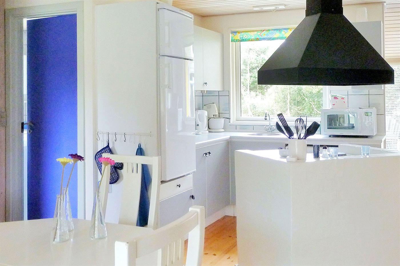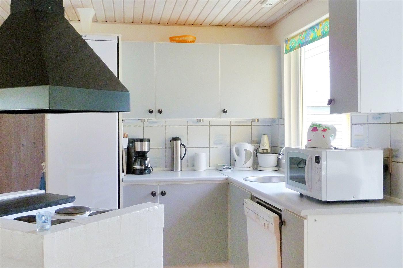 Die Küche ist mit Kühlschrank ausgestattet. Außerdem gibt es 4 elektrische Kochplatten, Backofen, Mikrowelle sowie Geschirrspüler.