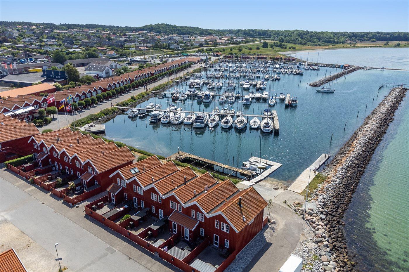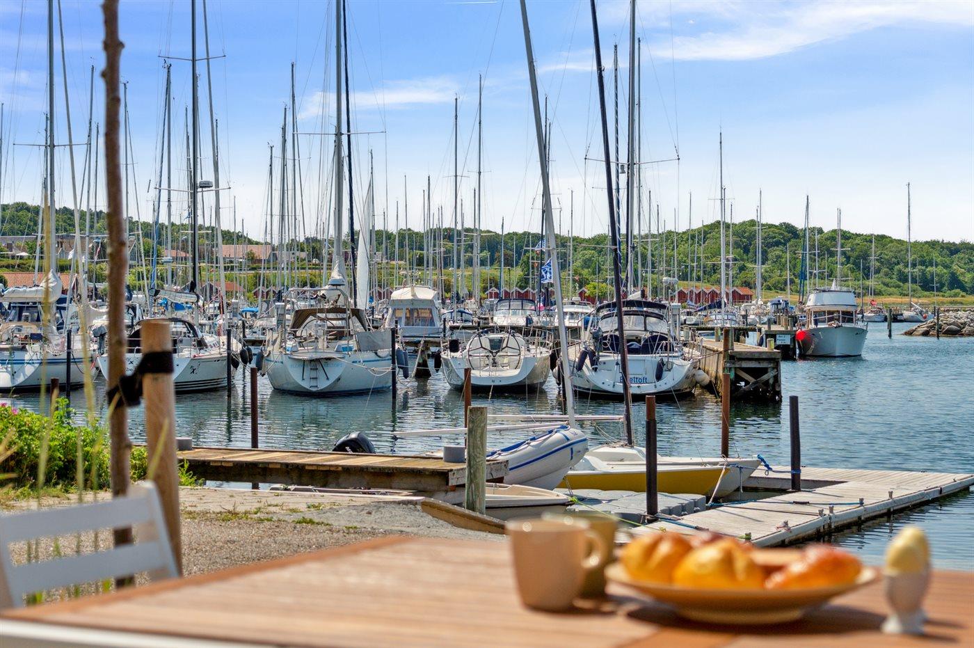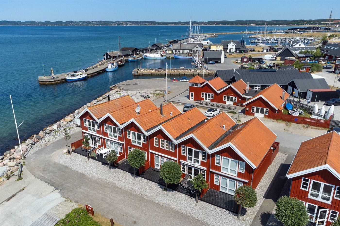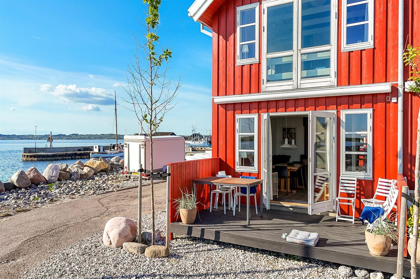 Gemütliches Reihenhaus mit Meerblick und privater Terrasse im Hafen von Ebeltoft, ideal für entspannte Ferien am Wasser.