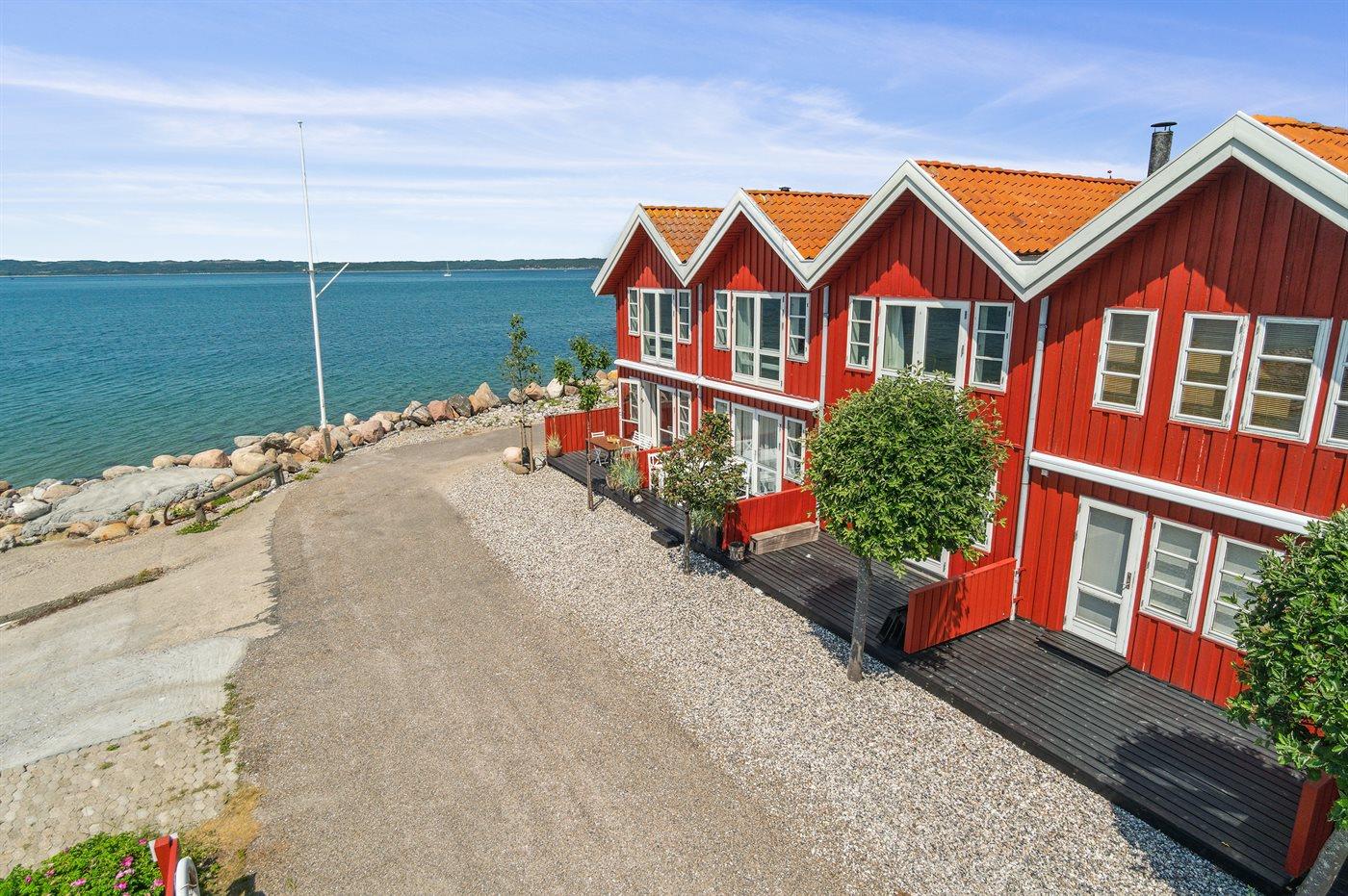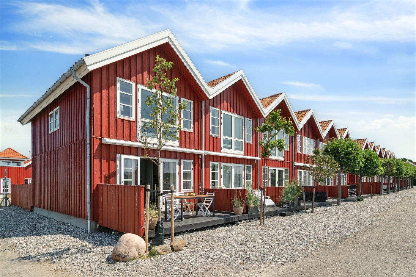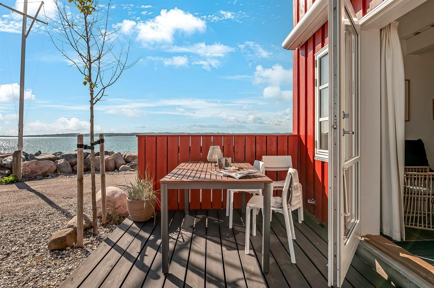 Gemütliches Reihenhaus mit Meerblick und privater Terrasse im Hafen von Ebeltoft, ideal für entspannte Ferien am Wasser.