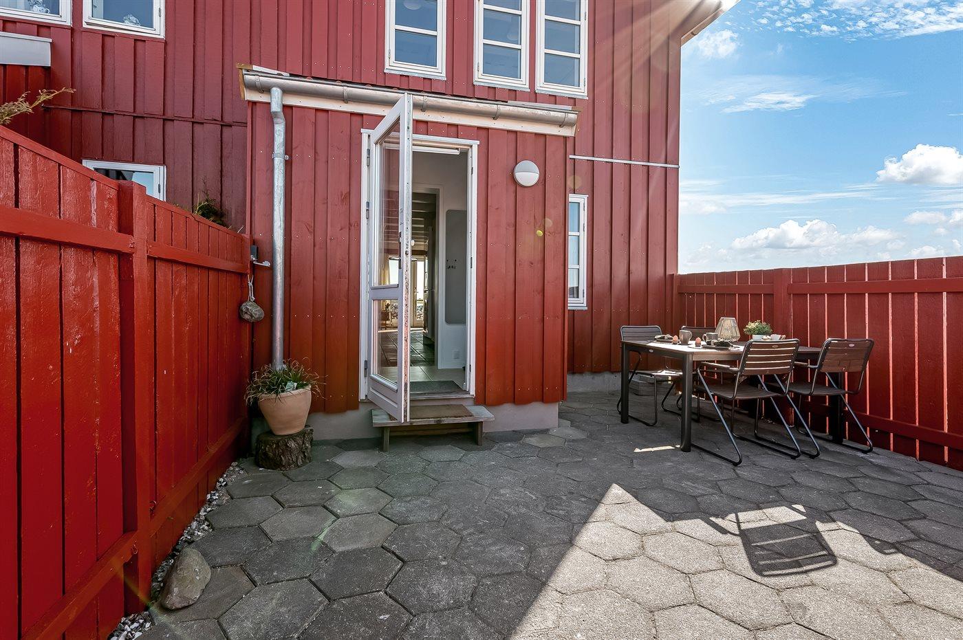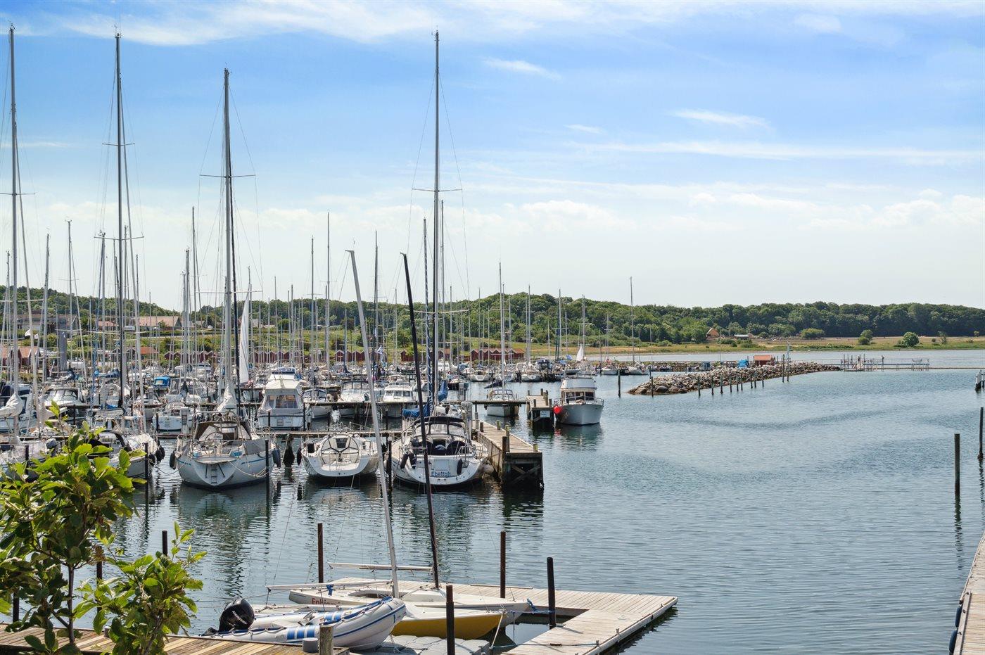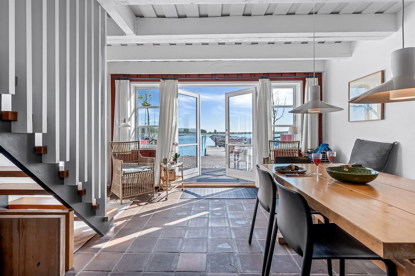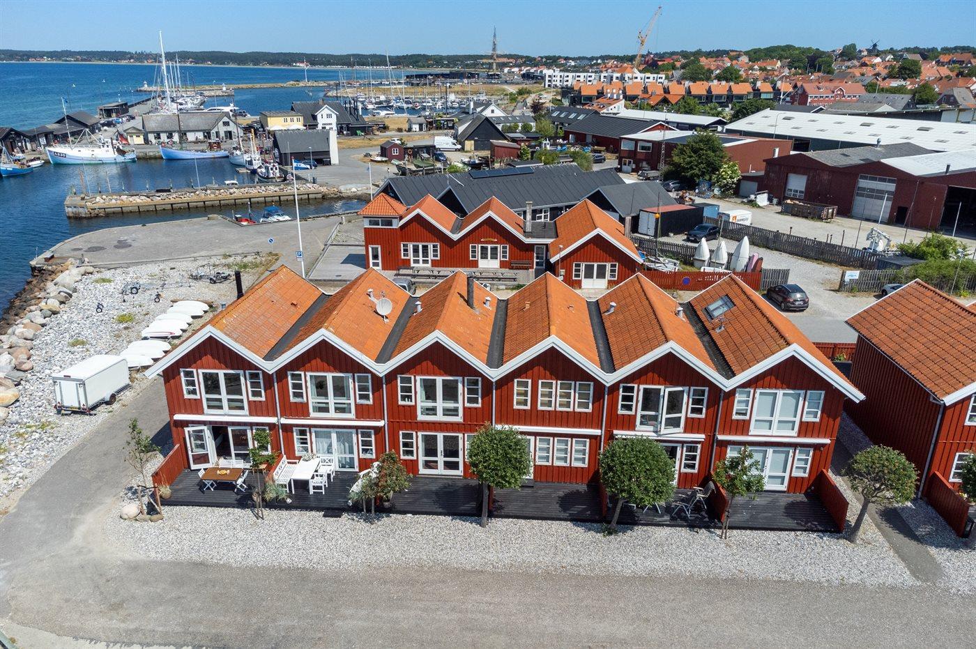 Gemütliches Reihenhaus mit Meerblick und privater Terrasse im Hafen von Ebeltoft, ideal für entspannte Ferien am Wasser.