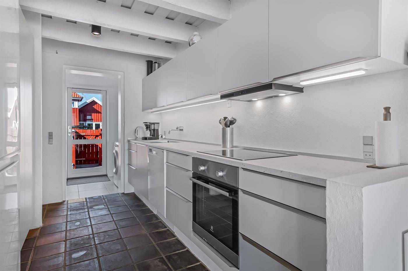 Die Küche ist mit Kühlschrank ausgestattet. Außerdem gibt es 4 Keramik-Kochfelder, Umluftofen sowie Geschirrspüler.