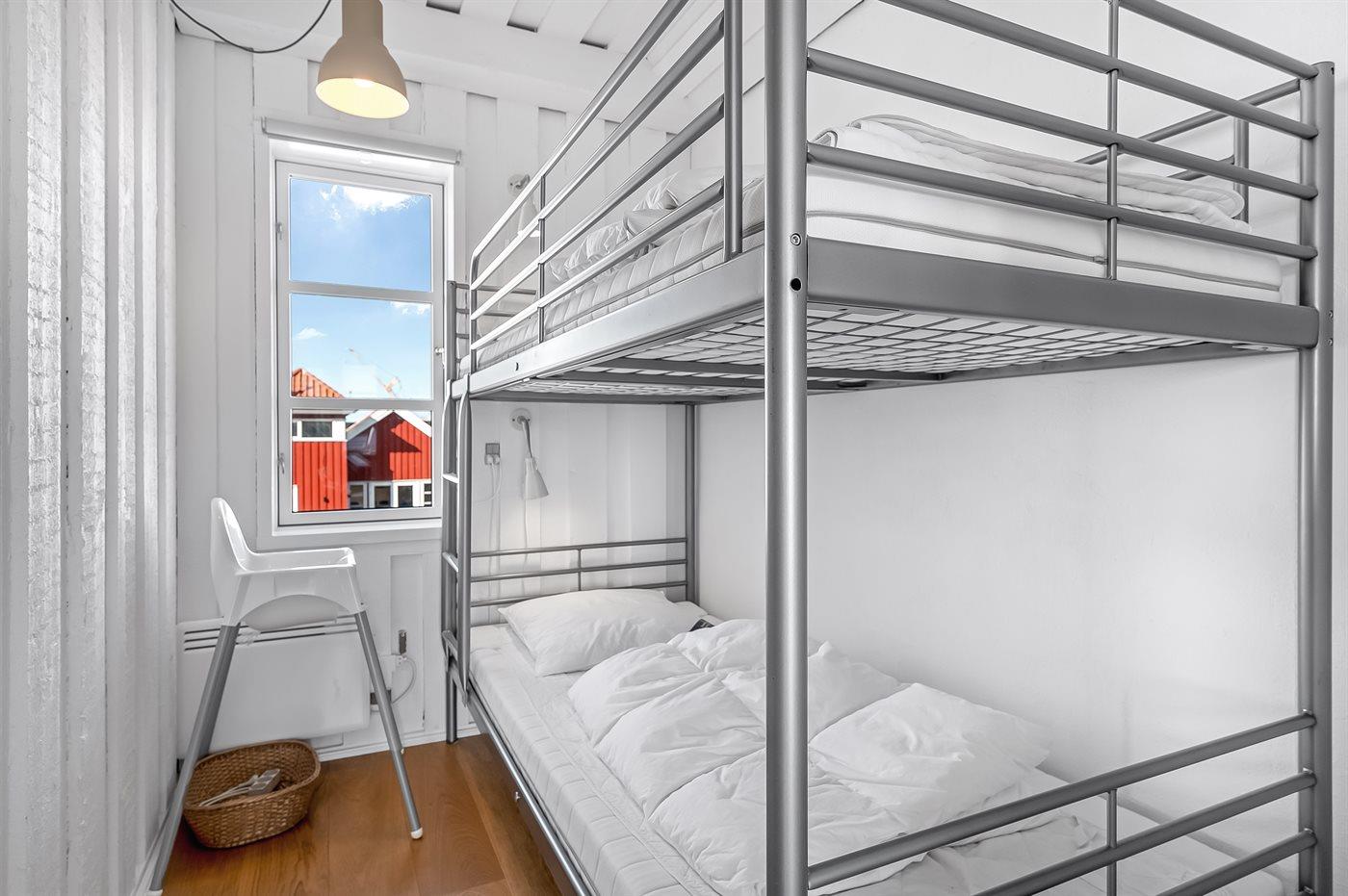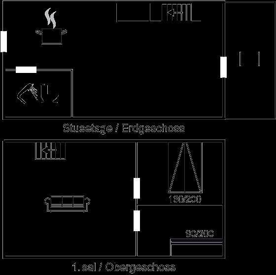 Die Schlafplätze verteilen sich auf 2 Schlafräume. 2 Schlafplätze in einem Doppelbett. 2 Schlafplätze in einem Etagenbett. 2 Schlafplätze auf Matratzen. 2 von diesen Schlafplätzen befinden sich im offenen Obergeschoss.