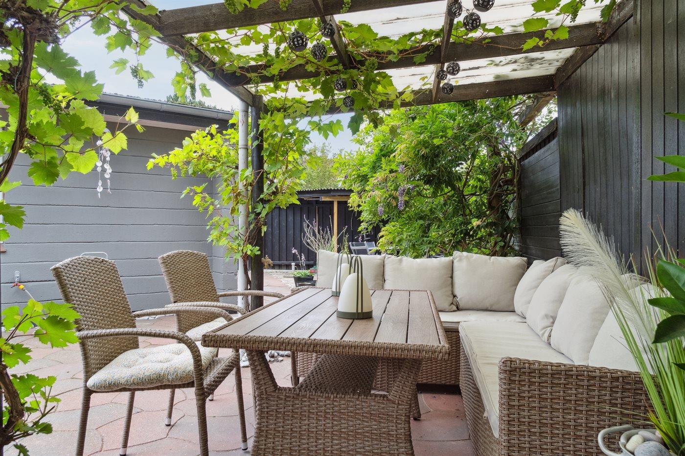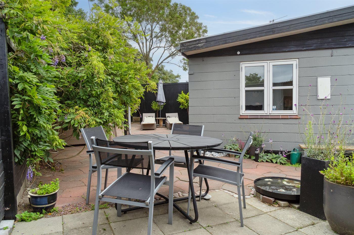 Auf dem geschlossenen Grundstück gibt es einen schönen Innenhof, der Windschatten und gemütliche Ecken bietet. Hier kann man sonnige Tage und milde Sommerabende genießen, lecker grillen oder sich einfach mit einem guten Buch entspannen. Der geschlossene Garten sorgt für Privatsphäre und Sicherheit für Kinder.