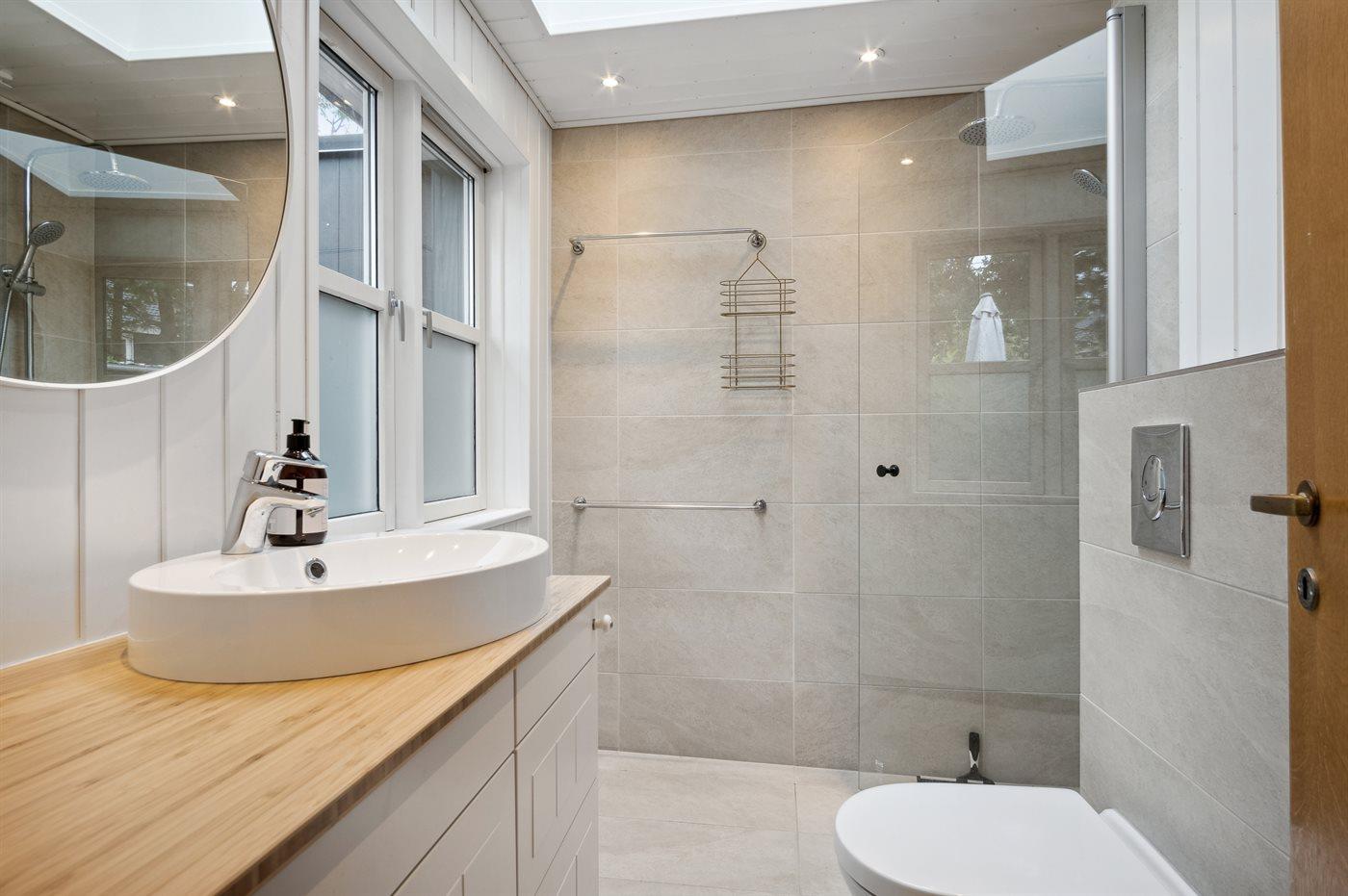 Es gibt 1 Badezimmer mit Duschnische und 2 Toiletten, davon 1 Gästetoilette. Fußbodenheizung in 1 Badezimmer.