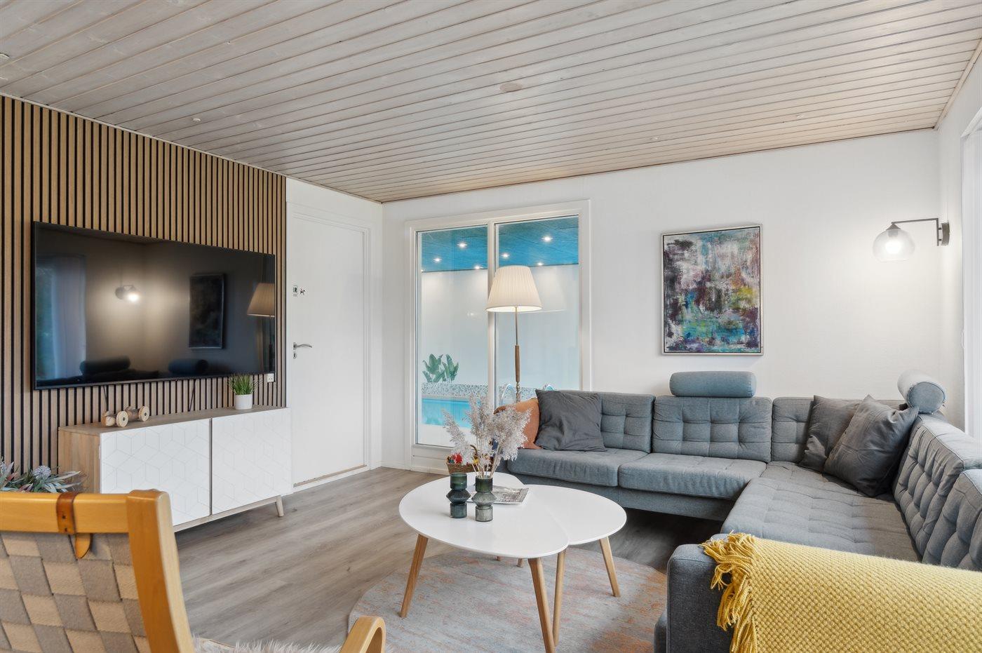 Modernisiertes Ferienhaus mit privatem Pool und Strandnähe in Ebeltoft, ideal für erholsame Tage mit Komfort und Sauna.