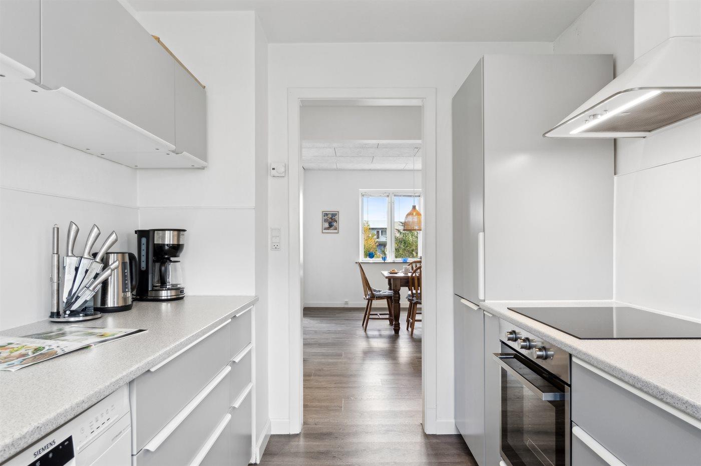 Die Küche ist mit Kühlschrank ausgestattet. Außerdem gibt es 4 Induktions-Kochzonen, Umluftofen sowie Geschirrspüler.