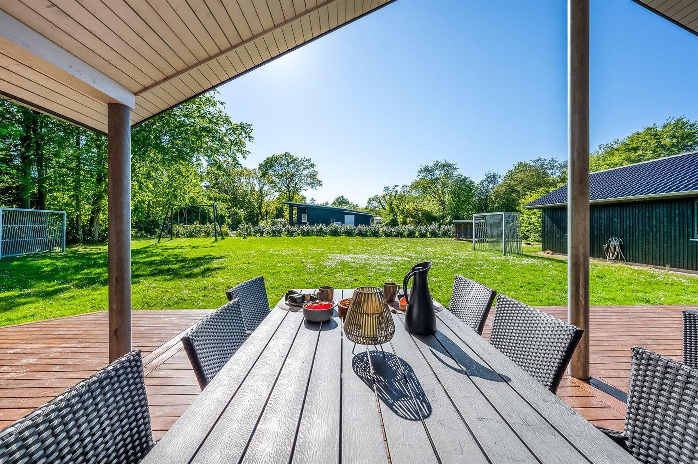 Besonders die große Küche, die mit dem Wohnbereich kombiniert ist, beeindruckt mit ihrem hervorragenden Lichteinfall durch die großen Fensterfronten. Zum Ferienhaus gehört außerdem eine schöne Terrasse, die teilweise überdacht ist – hier kannst du dich aufhalten, wenn das Wetter mal nicht mitspielt oder wenn du den Schatten bevorzugst.