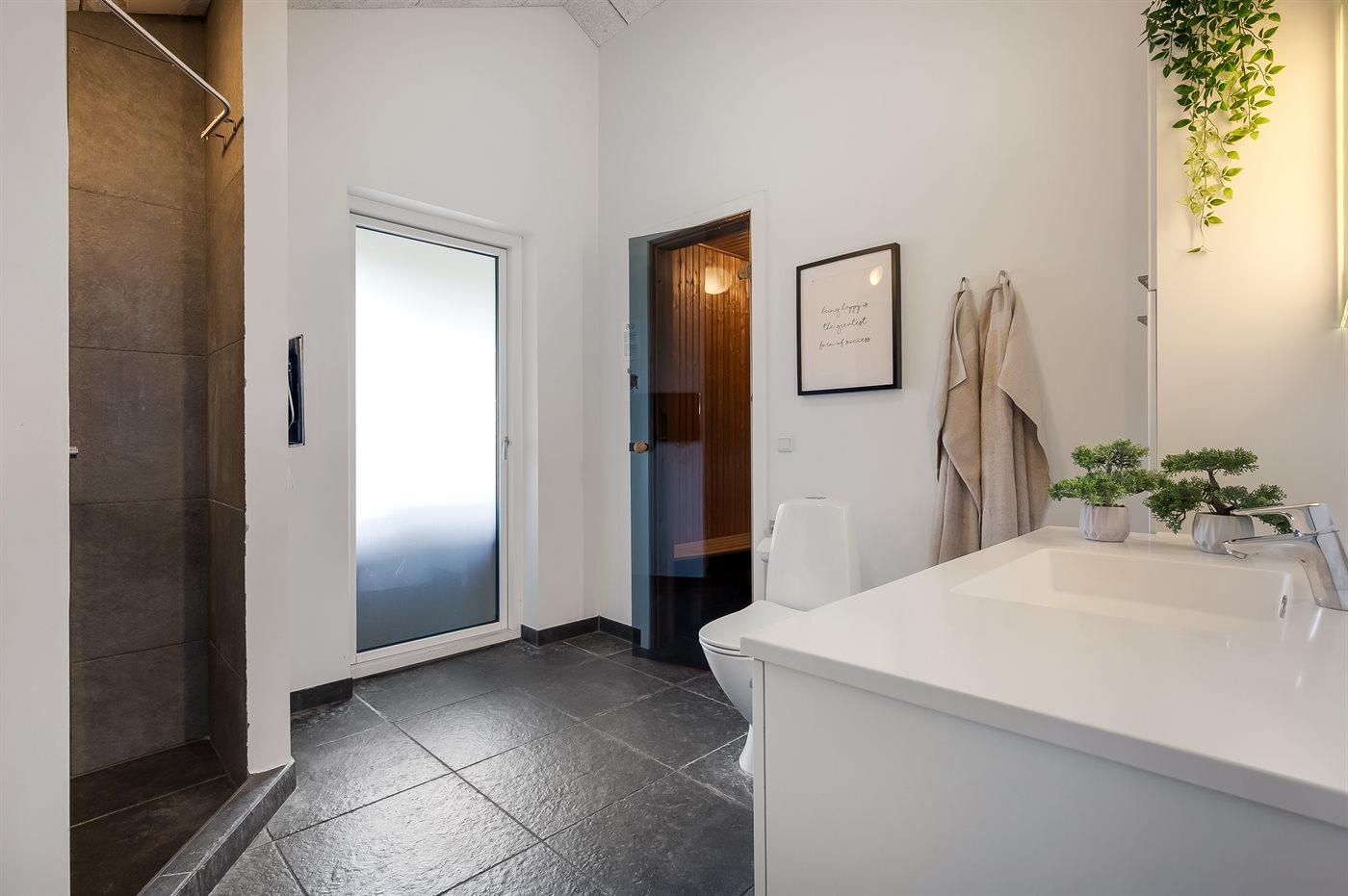 Es gibt 2 Badezimmer mit Duschnische und 2 Toiletten. Fußbodenheizung in 2 Badezimmern. Es steht eine Sauna zur Verfügung in der Sie sich so richtig entspannen können.