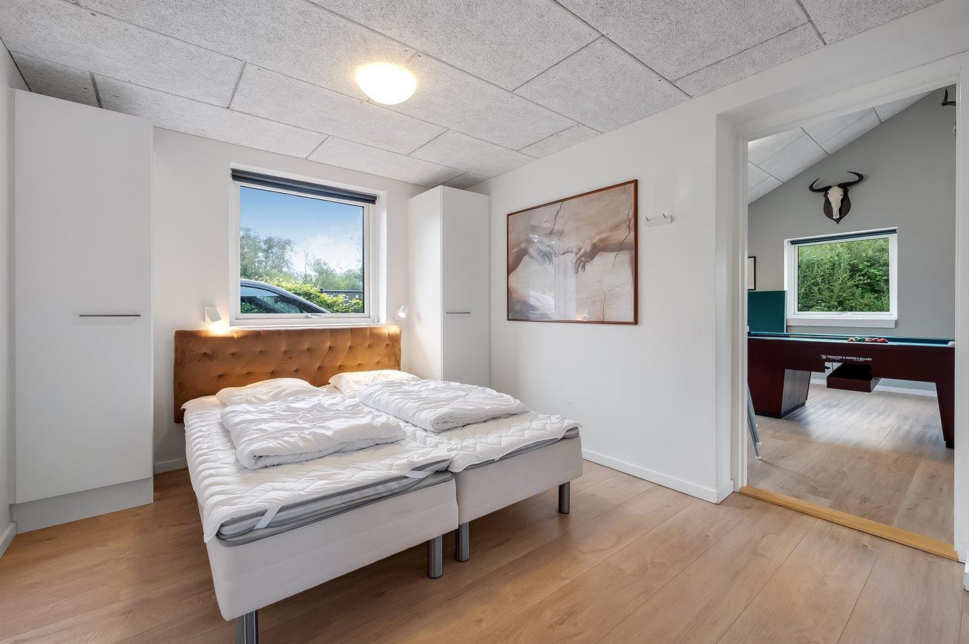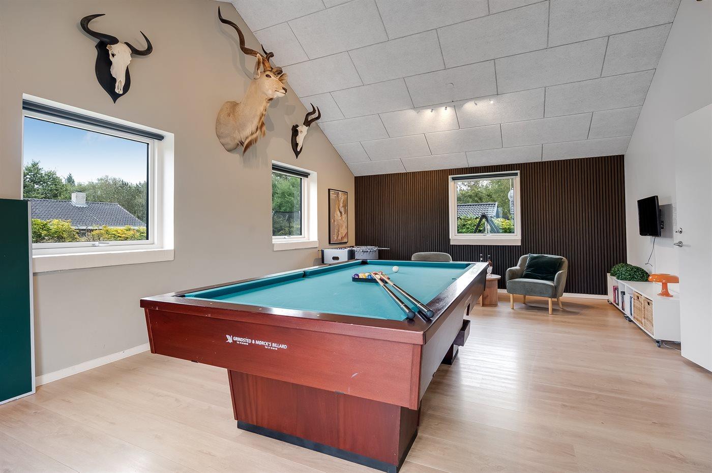 Die Einrichtung bietet geräumige Schlafzimmer mit sehr guten Betten sowie eine große, offene Wohnküche mit langem Esstisch, moderner Möblierung und Blick auf den schönen Poolbereich, der sowohl ein separates Kinderbecken als auch eine lustige Wasserrutsche umfasst. Das Ferienhaus verfügt außerdem über einen großen Aktivitätsraum mit unter anderem einem Billardtisch und Tischtennis – perfekt für gesellige Wettkämpfe.