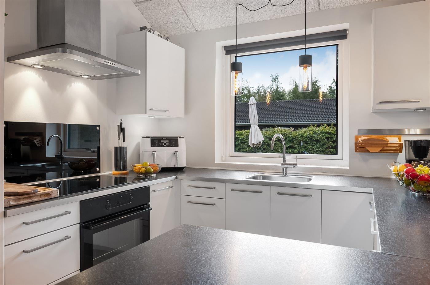 Die Küche ist mit Kühlschrank ausgestattet. Außerdem gibt es 4 Induktions-Kochzonen, Umluftofen, Mikrowelle, Airfryer sowie Geschirrspüler.