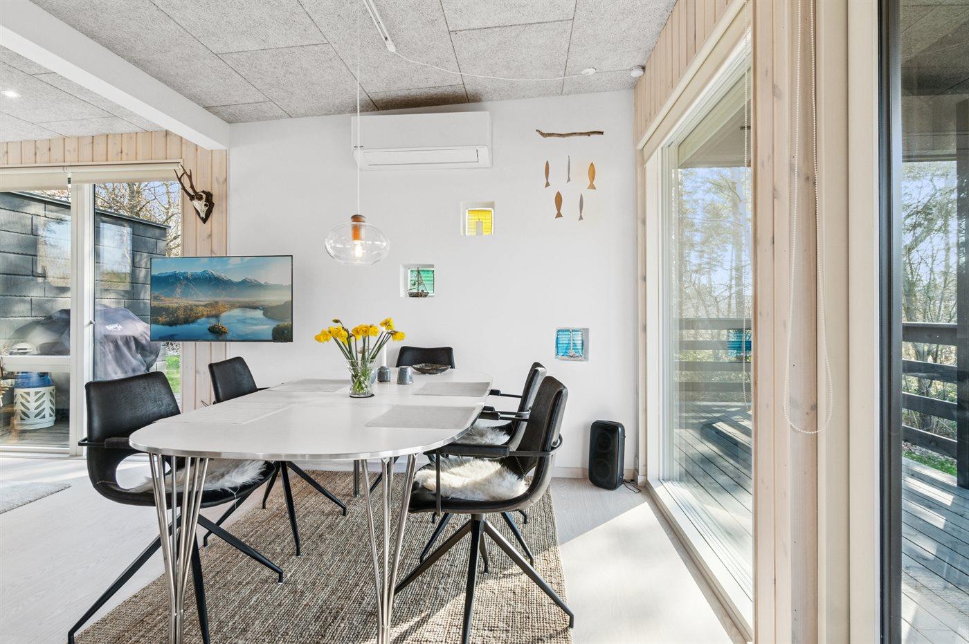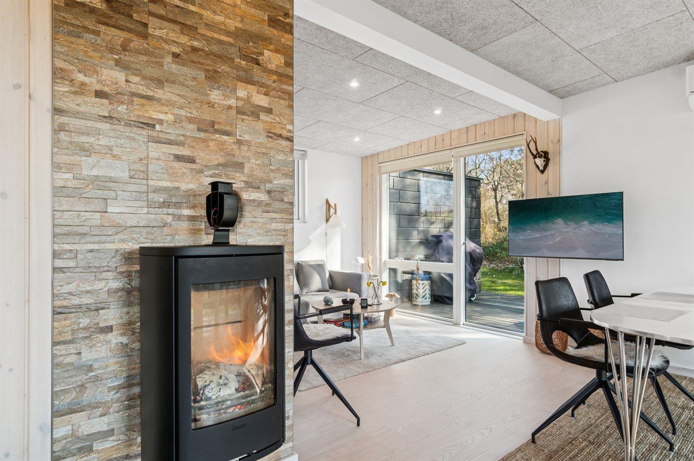 Das Ferienhaus bietet Platz für vier Personen und ist geschmackvoll eingerichtet mit zwei schönen Schlafzimmern mit bequemen Betten. Wohnbereich, Küche und Esszimmer sind offen miteinander verbunden und schaffen einen hellen und einladenden Aufenthaltsraum. Der Kamin sorgt an kühlen Tagen für Wärme und Gemütlichkeit, während eine Luft-Luft-Wärmepumpe das ganze Jahr über ein angenehmes Raumklima gewährleistet.