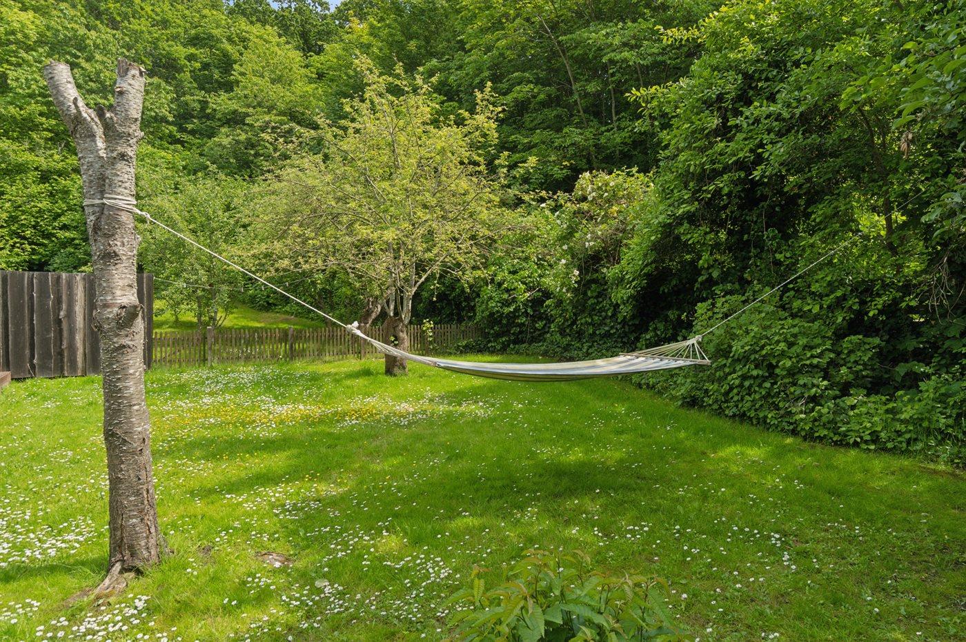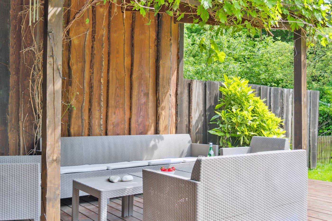 Draußen umgibt der Garten das Haus wie ein grüner Rahmen. Mehrere Terrassen machen es dir leicht, im Laufe des Tages Sonne, Schatten oder Windschutz zu finden. Der Garten ist geschlossen, eingezäunt und ruhig – ein Ort zum Spielen, Entspannen und für einen Hund, der gerne dabei ist.