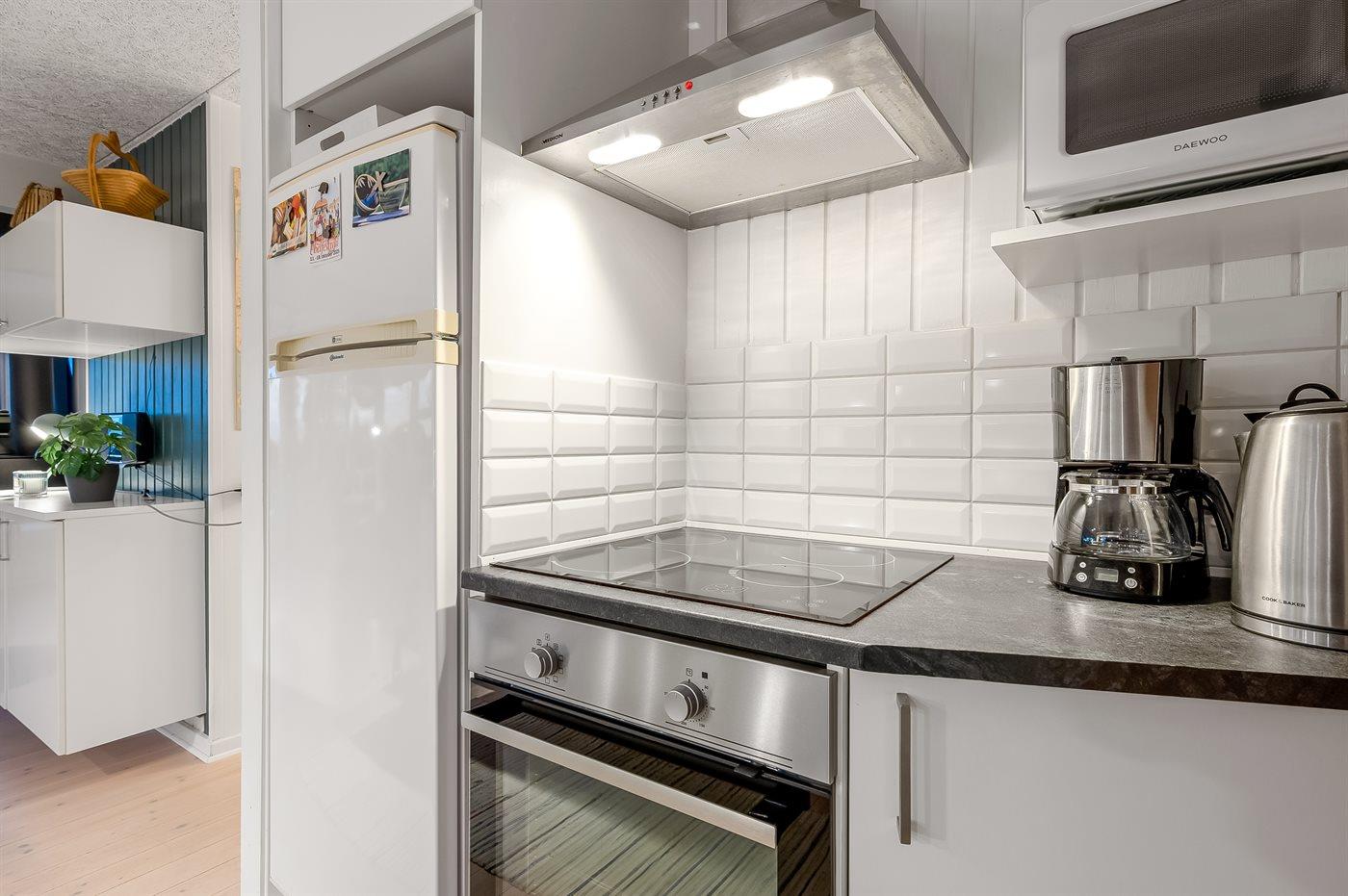 Die Küche ist mit Kühlschrank ausgestattet. Außerdem gibt es 4 Induktions-Kochzonen, Umluftofen, Mikrowelle sowie Geschirrspüler.