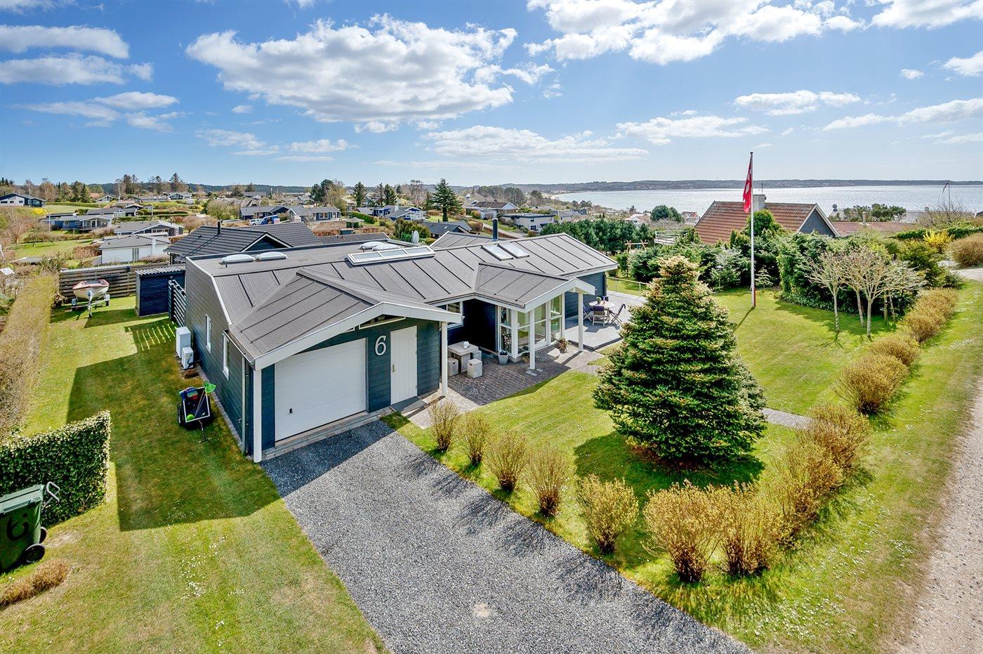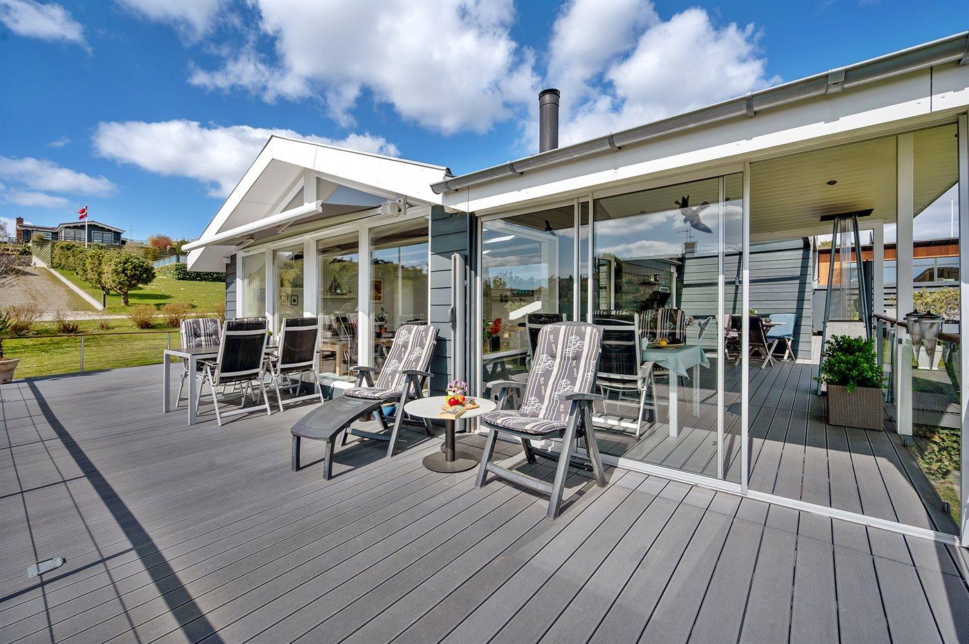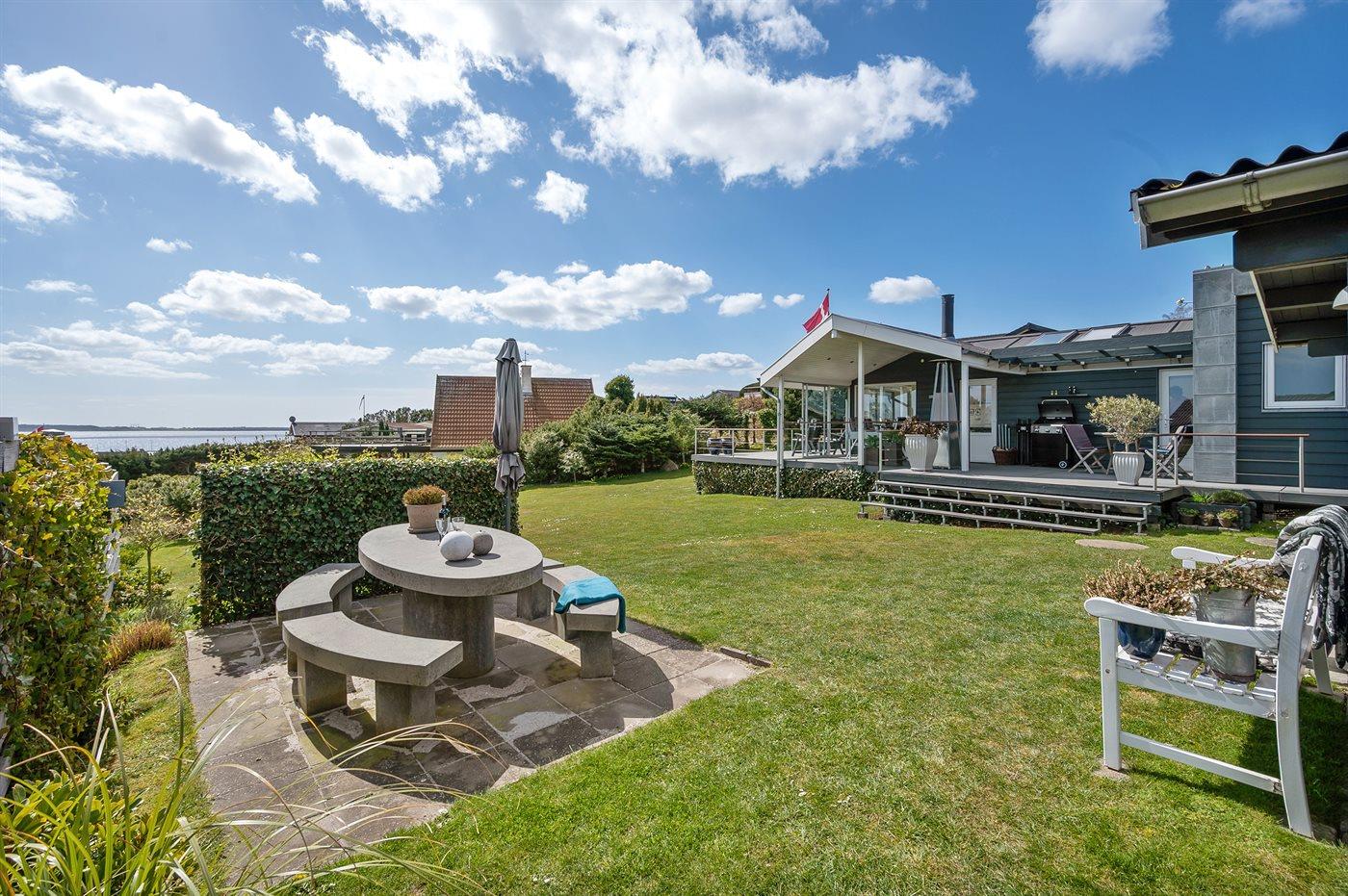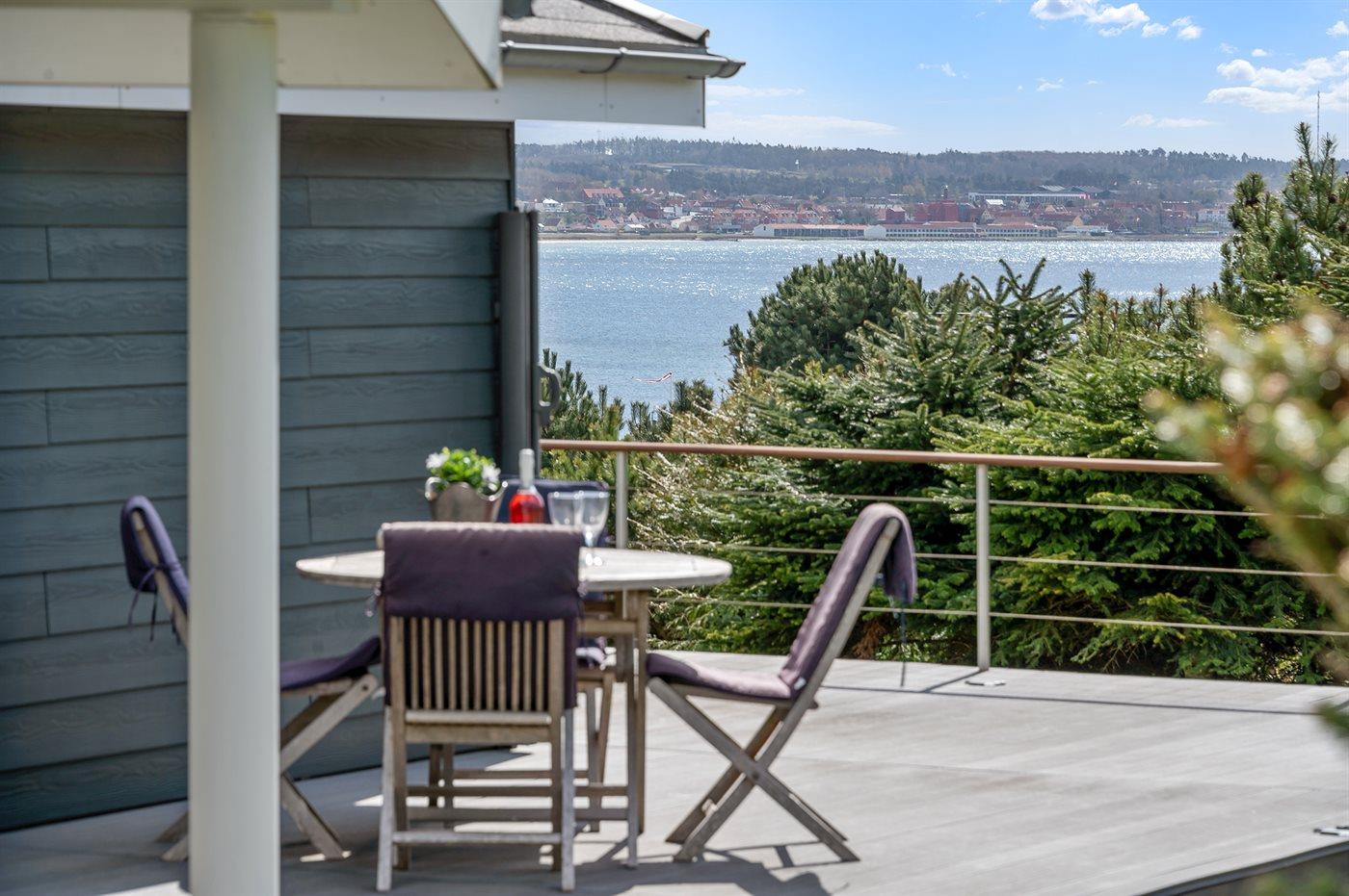 Hübsches und sehr gepflegtes Ferienhaus in fantastischer Lage: Sowohl von Haus, Grundstück als auch von den schönen Terrassen aus haben Sie einen tollen Blick auf das Wasser und das Städtchen Ebeltoft.