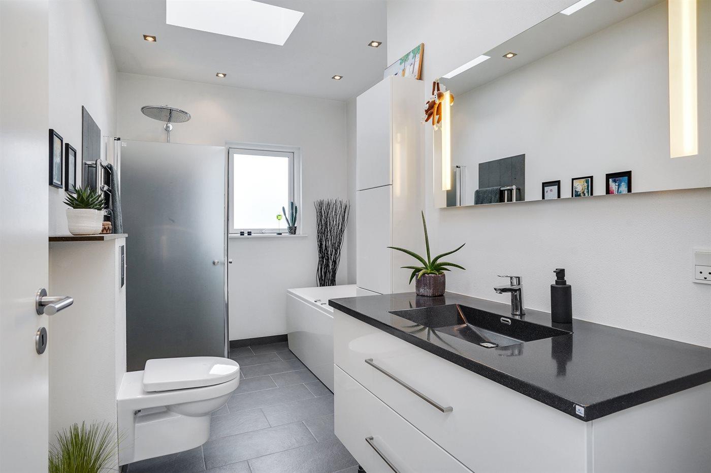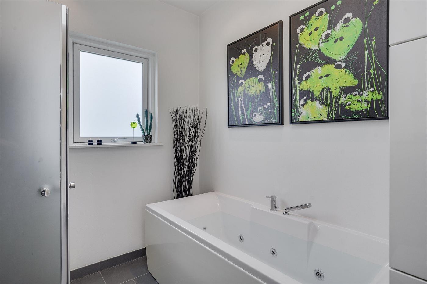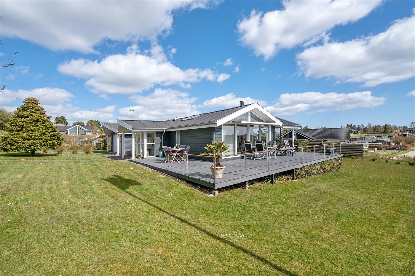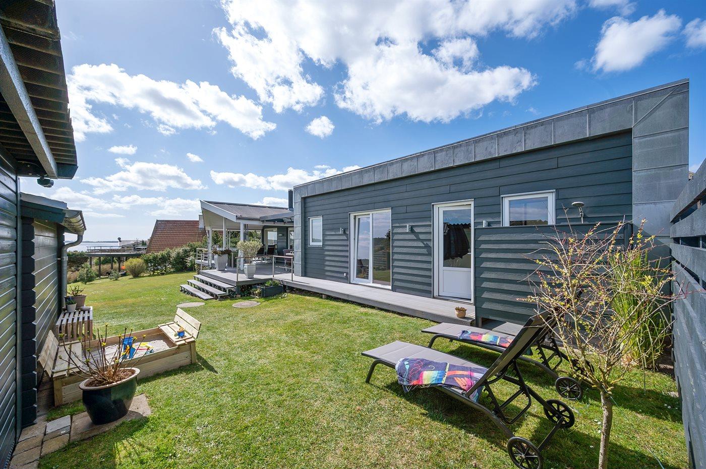 Modernes Ferienhaus mit Meerblick, Whirlpool und großer Terrasse in Ebeltoft, ideal für entspannte Tage am Wasser.