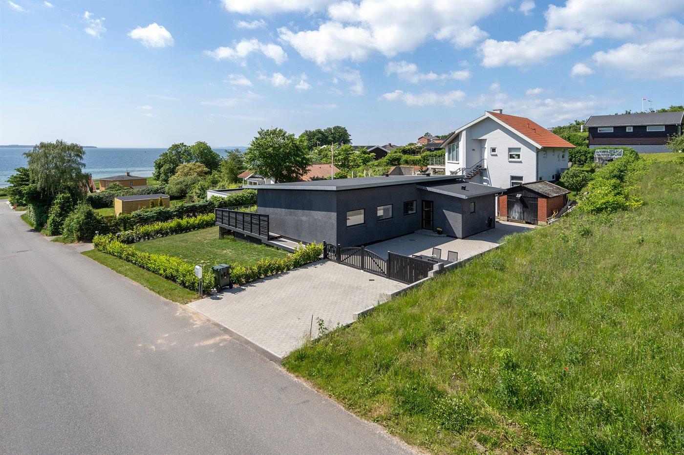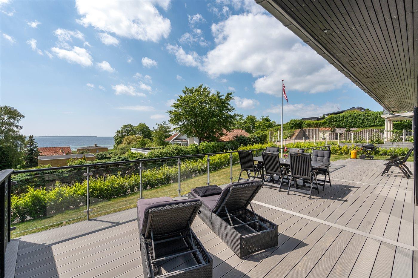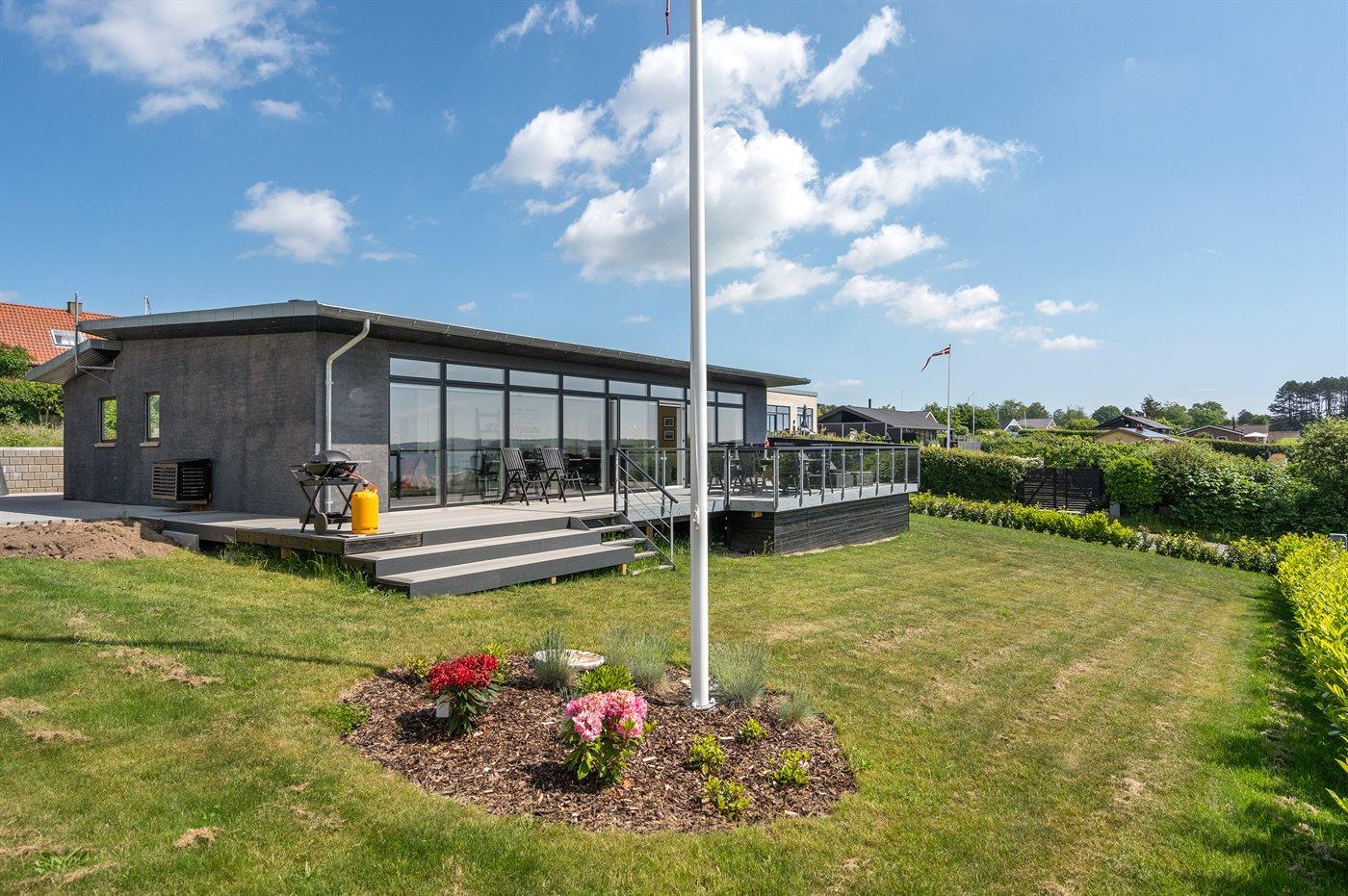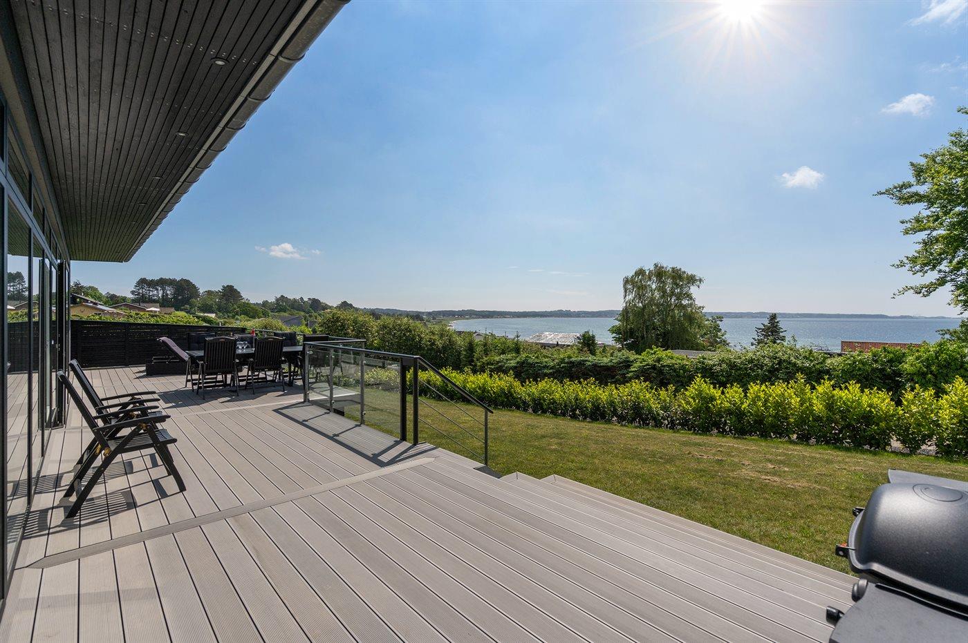 Modernes, renoviertes Ferienhaus mit Meerblick und großer Terrasse in Ebeltoft, ideal für entspannte Tage am Wasser.