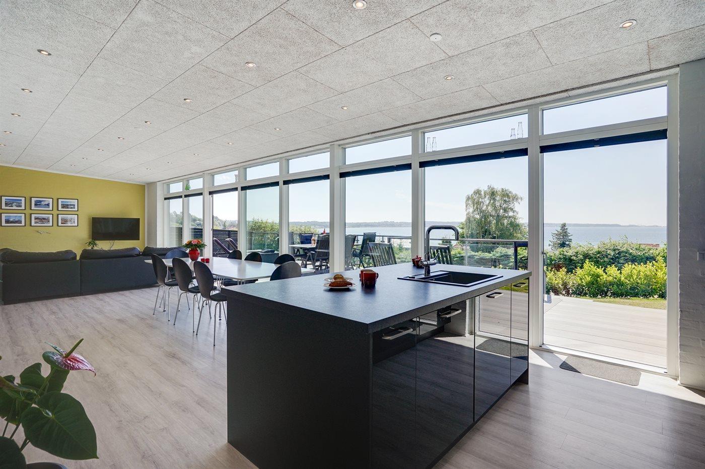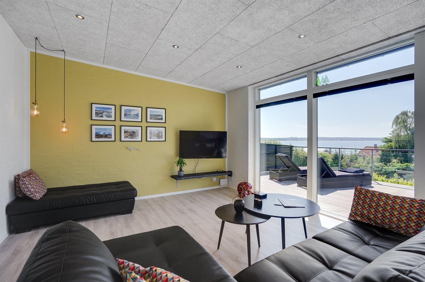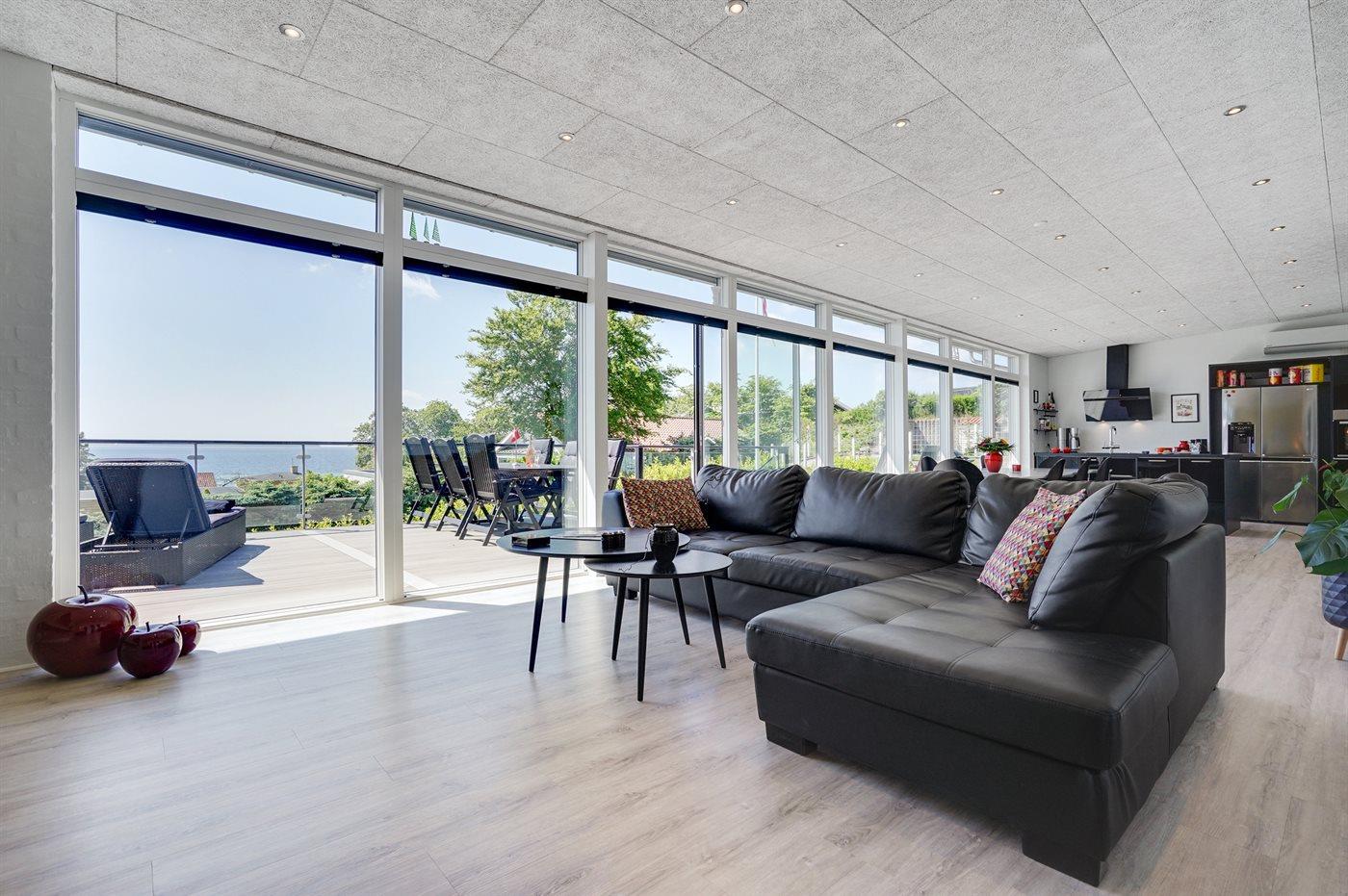 Modernes, renoviertes Ferienhaus mit Meerblick und großer Terrasse in Ebeltoft, ideal für entspannte Tage am Wasser.