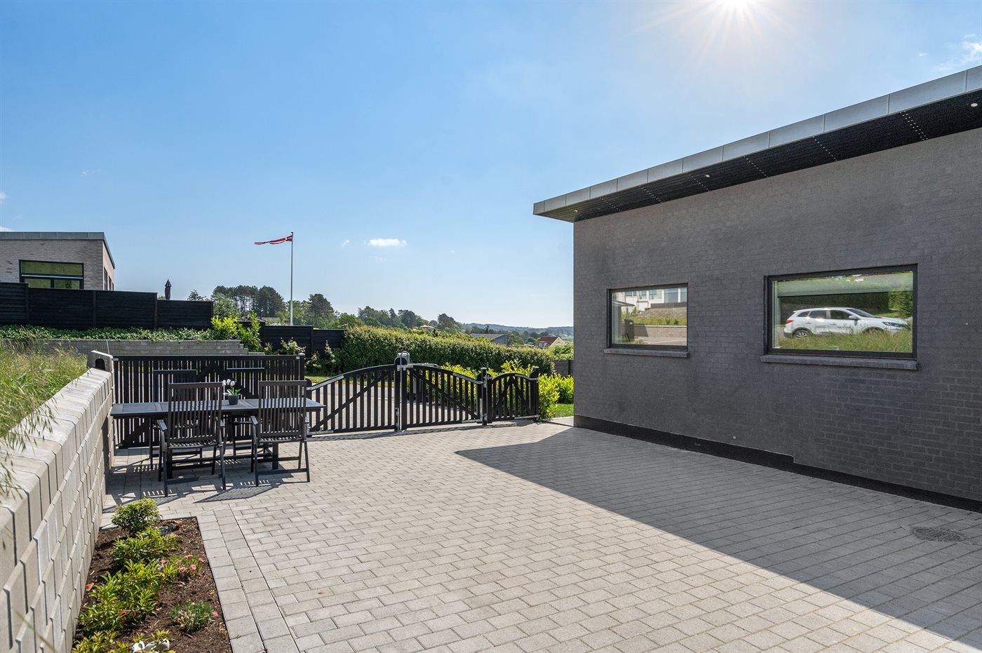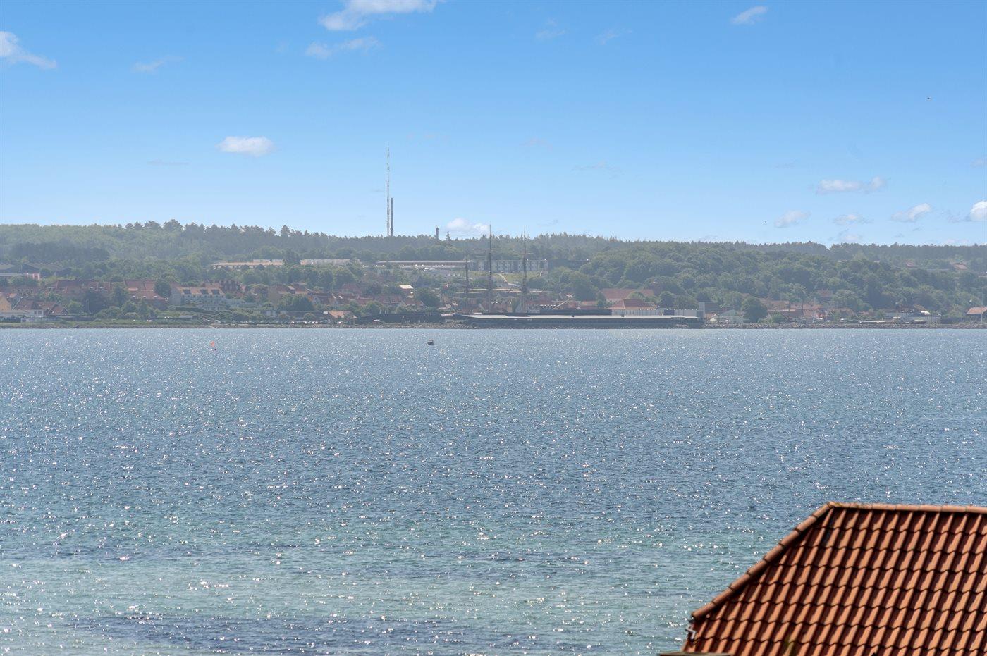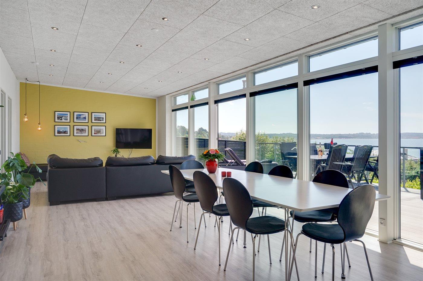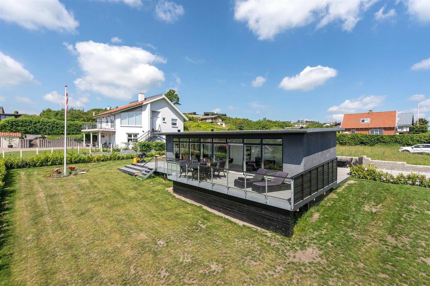 Modernes, renoviertes Ferienhaus mit Meerblick und großer Terrasse in Ebeltoft, ideal für entspannte Tage am Wasser.