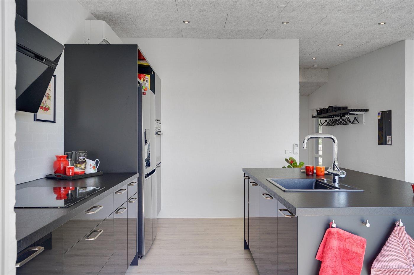 Die Küche ist mit amerikanischem Kühlschrank ausgestattet. Außerdem gibt es 4 Induktions-Kochzonen, Umluftofen, Mikrowelle sowie Geschirrspüler.