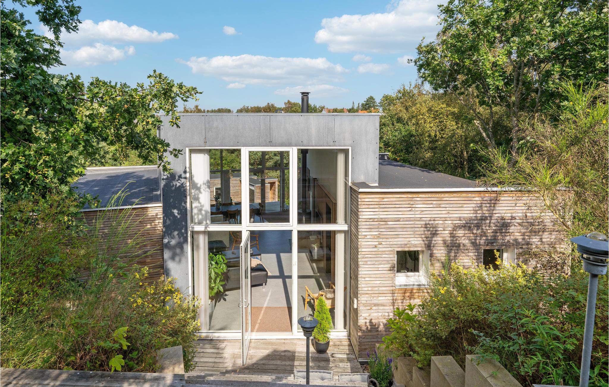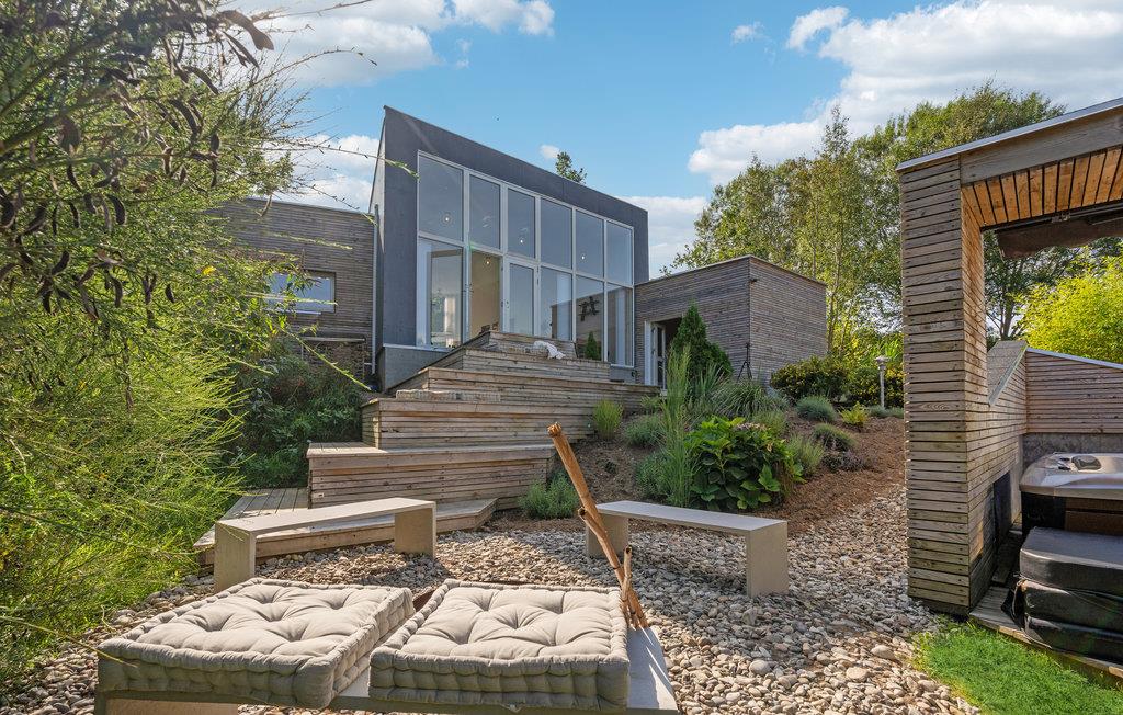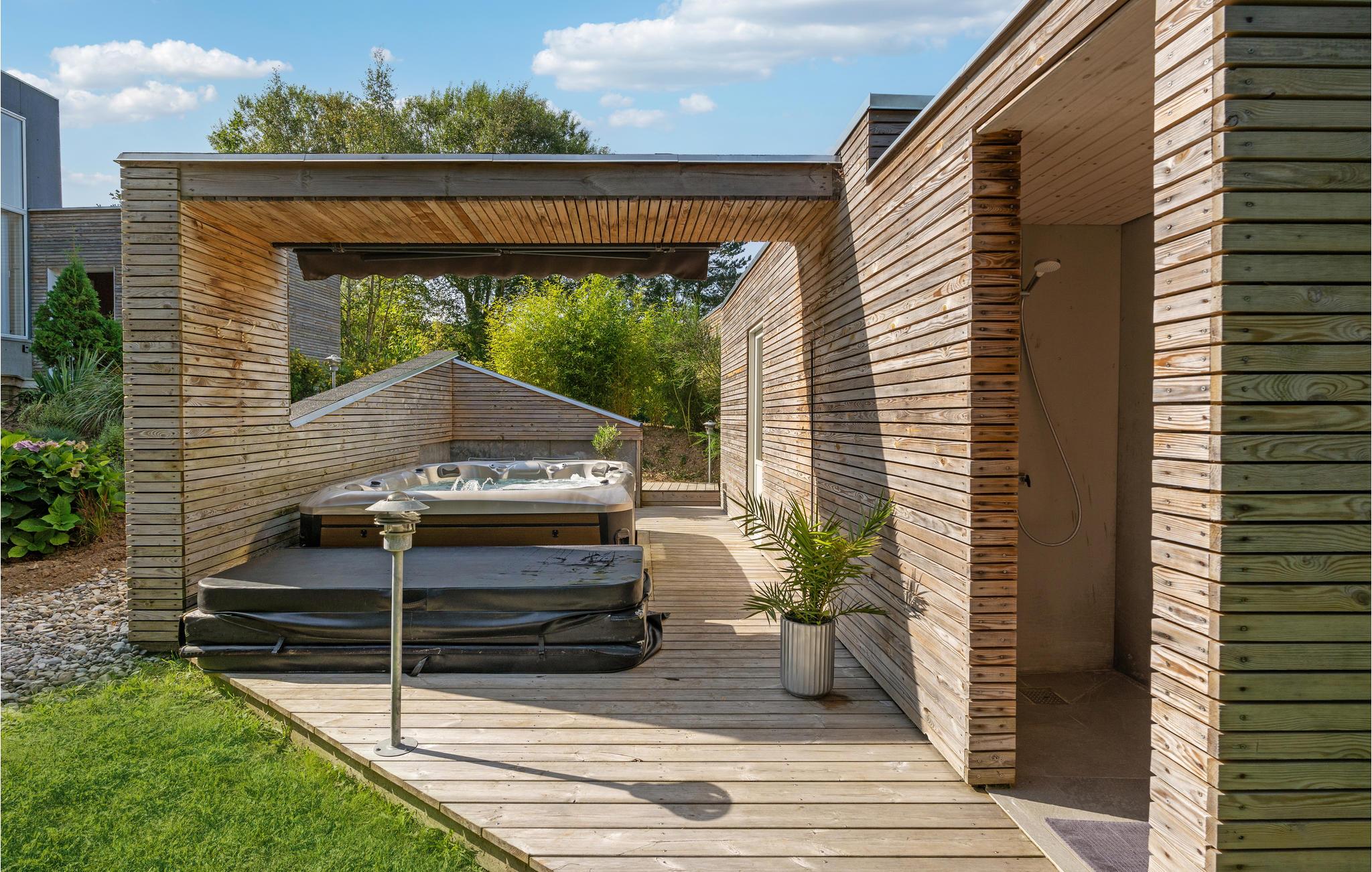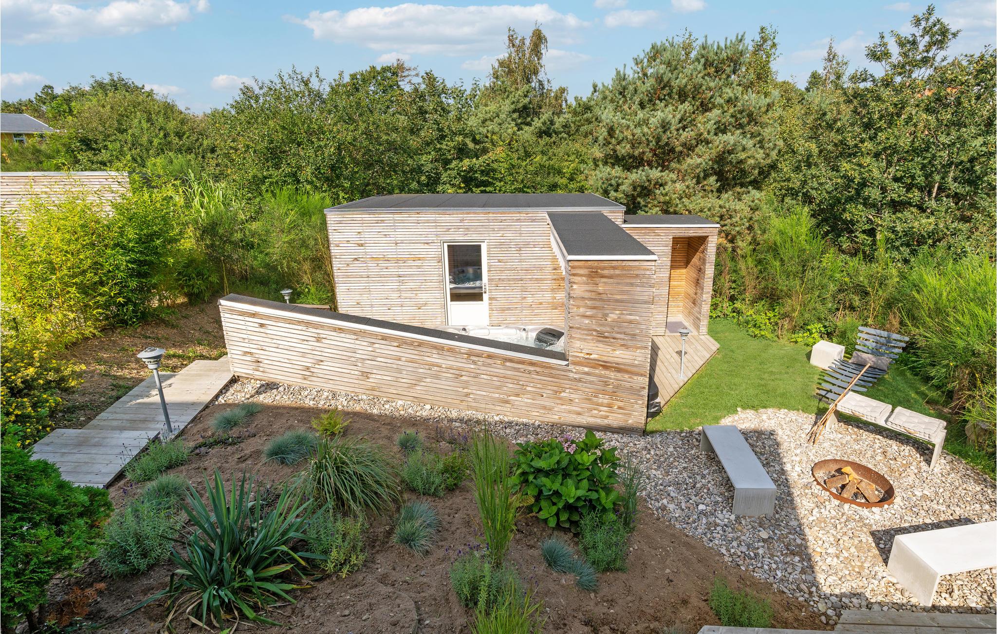 Dieses moderne Ferienhaus in Ebeltoft bietet Wellness mit Sauna und Jacuzzi sowie mehrere sonnige Terrassen auf einem Naturgrundstück.