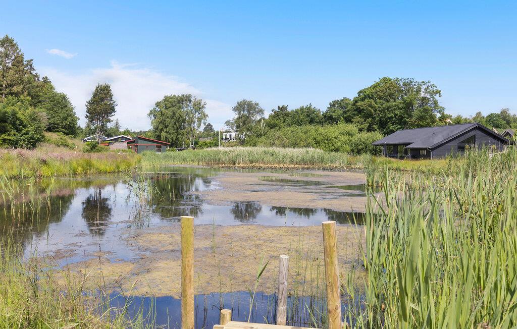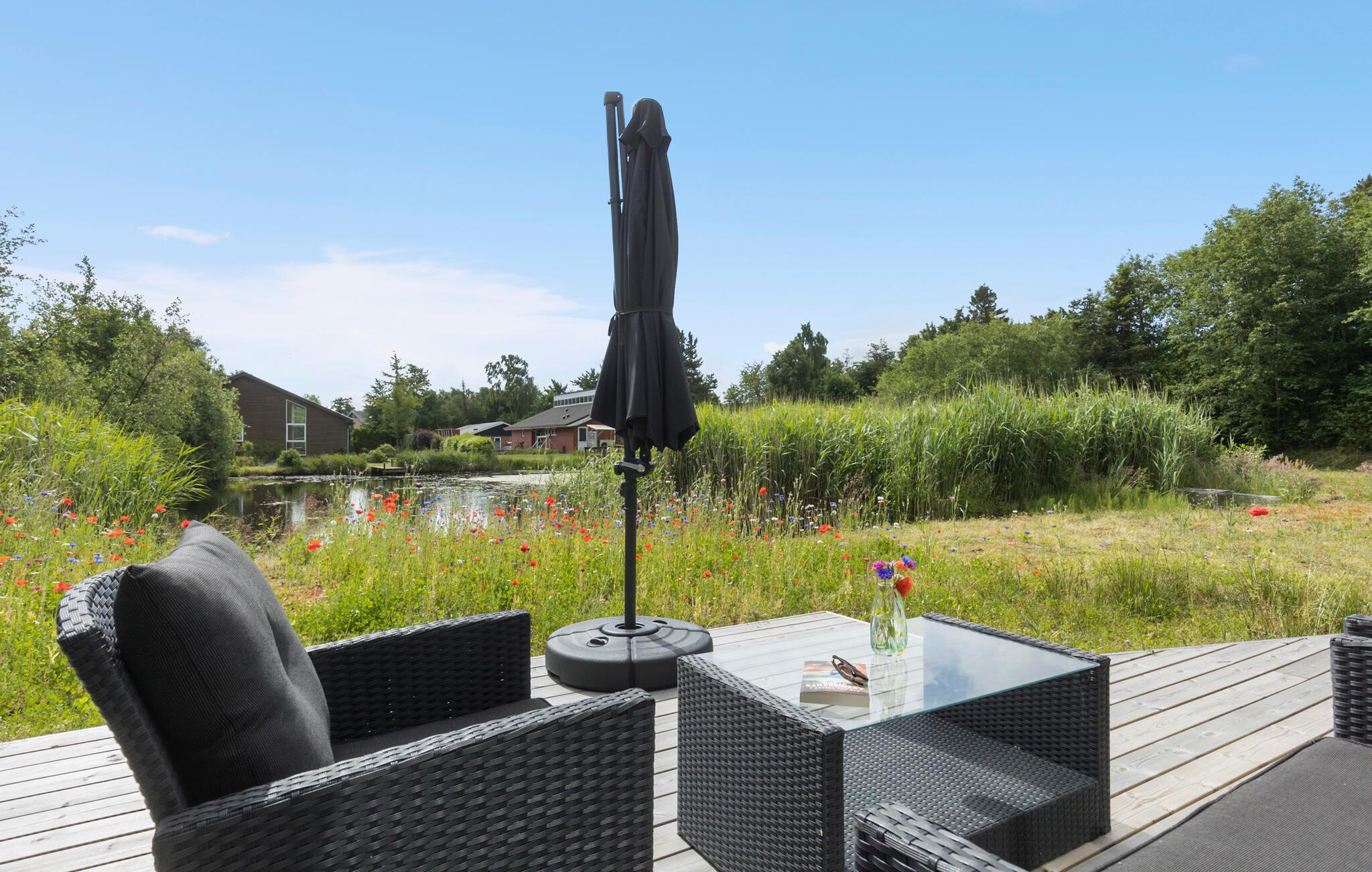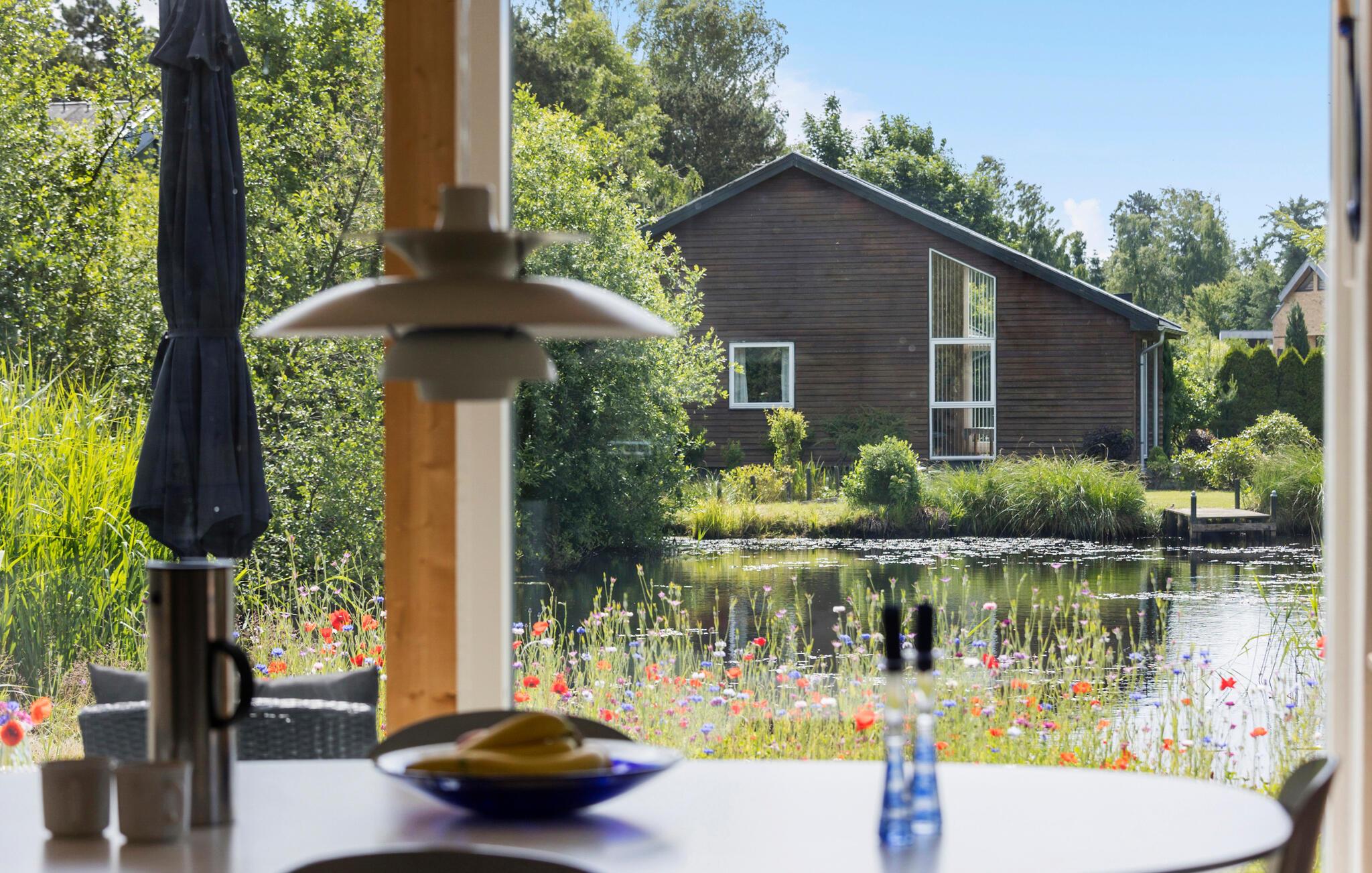 Ihr modernes Ferienhaus bietet Ihnen alle Annehmlichkeiten, die Sie für einen entspannten Aufenthalt benötigen. Ihr Ferienhaus besticht durch seine helle und offene Gestaltung, die von den großen Fenstern und dem hohen Holzdeckenprofil betont wird. Genießen Sie den gemütlichen Wohnbereich mit den komfortablen Sofas. Nutzen Sie die moderne Küche, die mit allen notwendigen Geräten ausgestattet ist, um köstliche Mahlzeiten zuzubereiten. Nehmen Sie Ihre Mahlzeiten am stilvollen Esstisch ein und lassen Sie den Blick durch die großen Fenster auf den idyllischen Garten und den Teich schweifen.