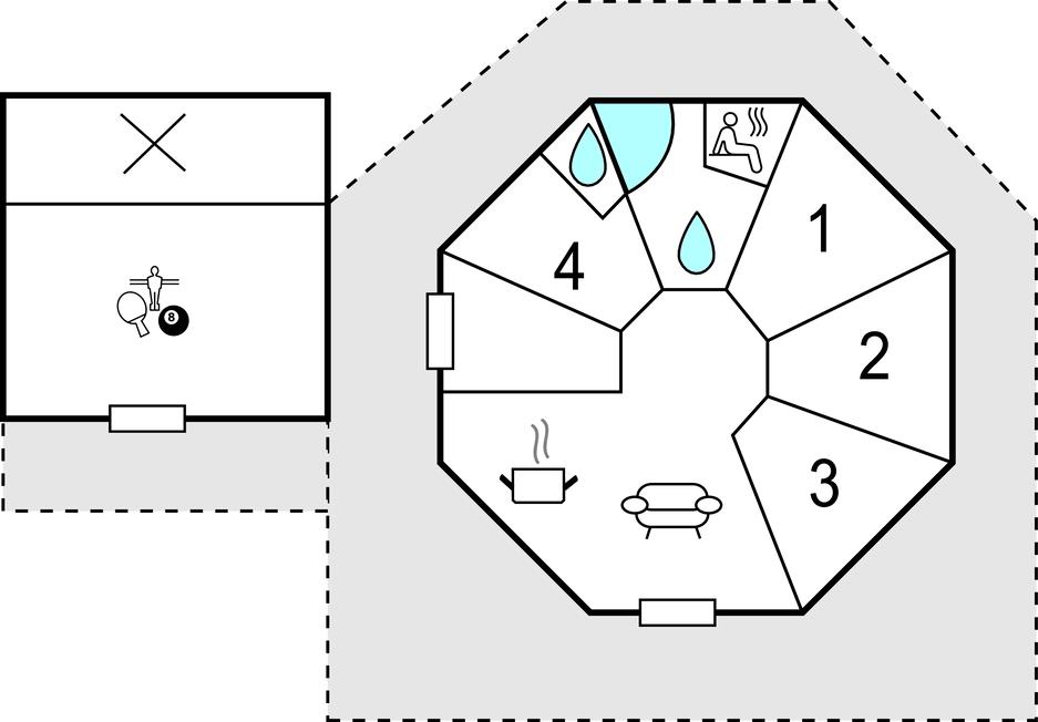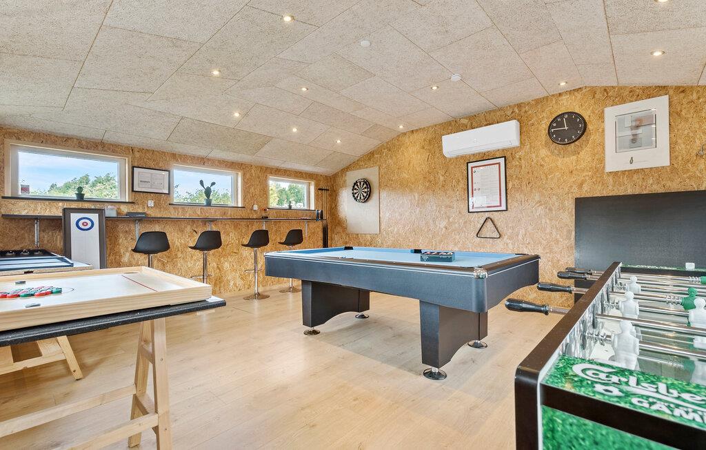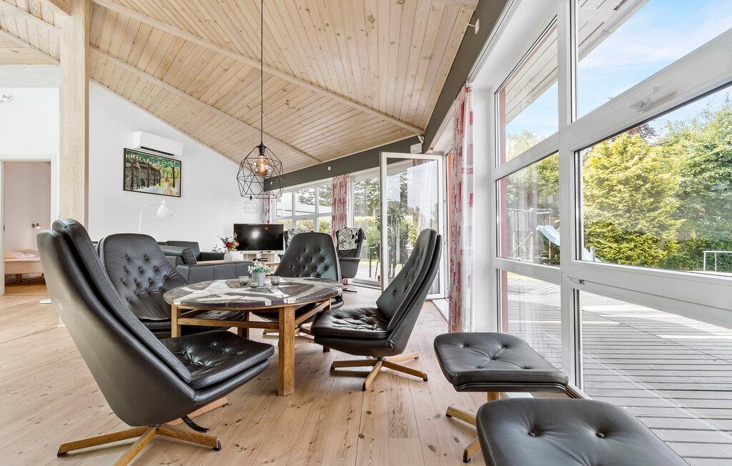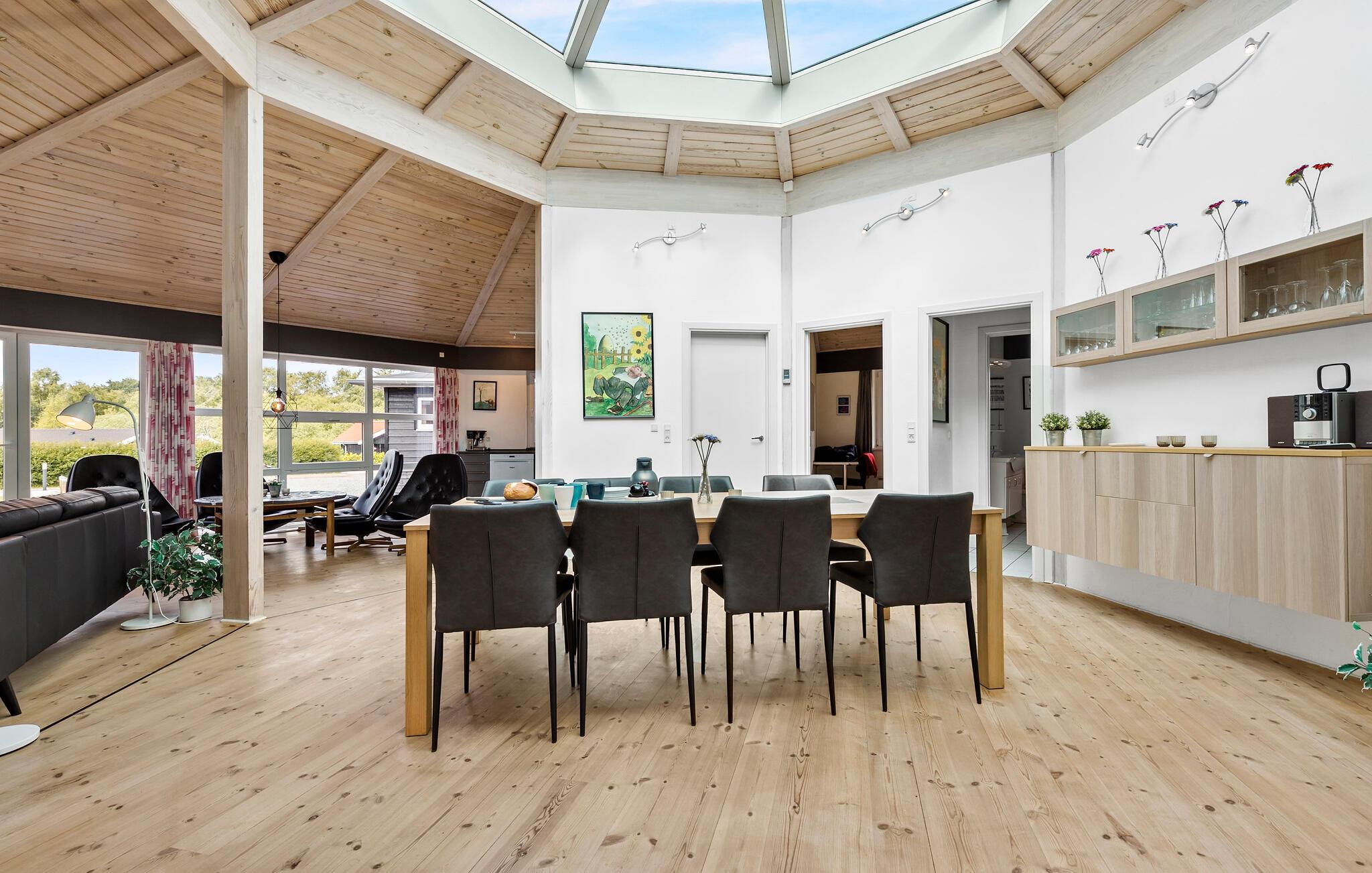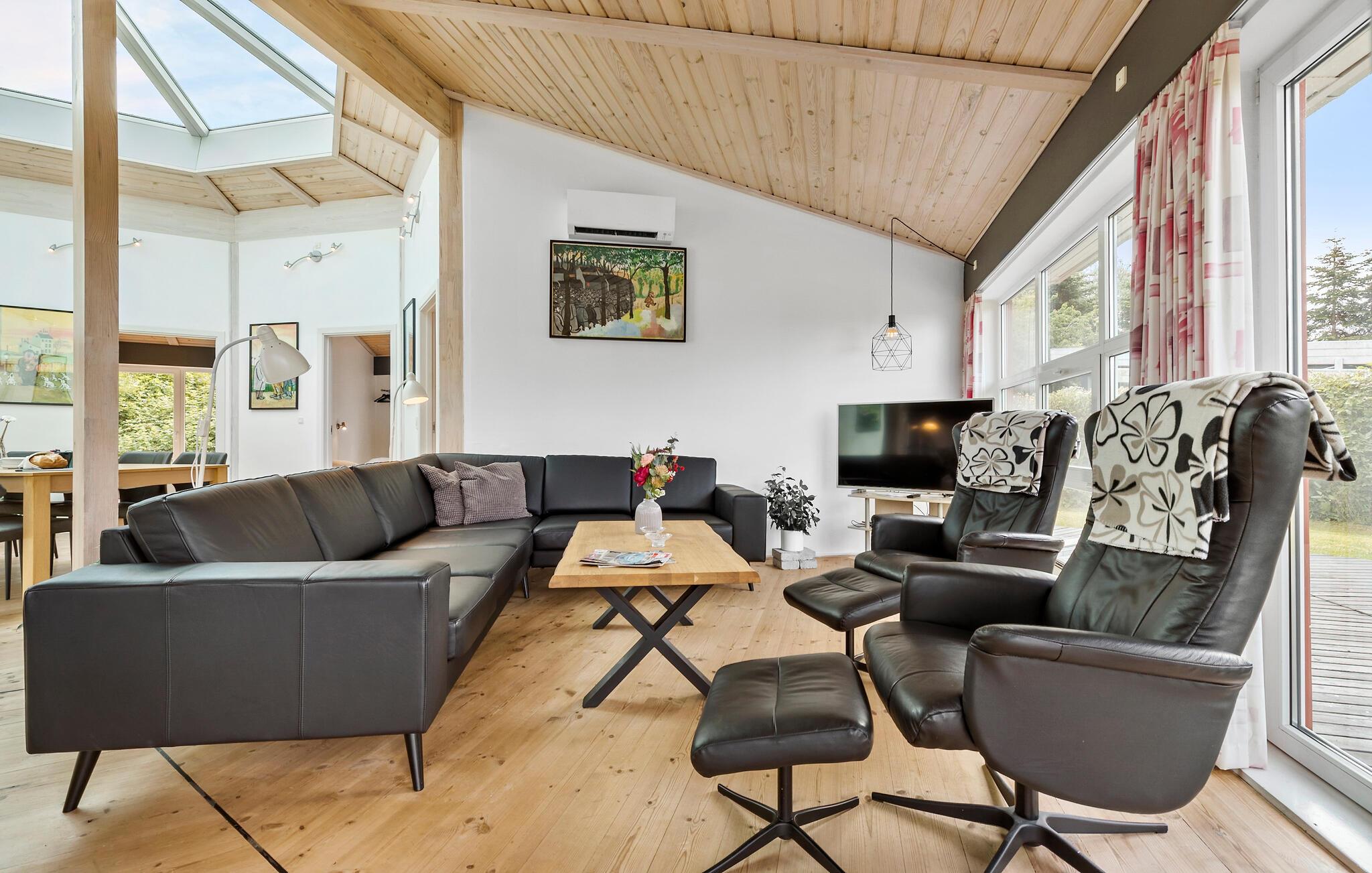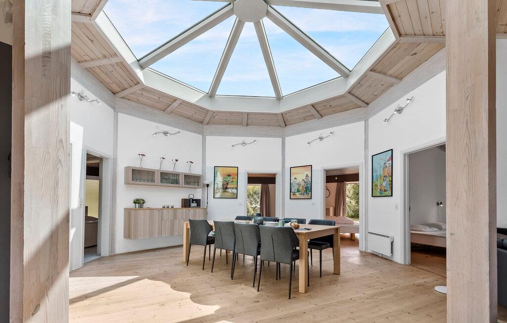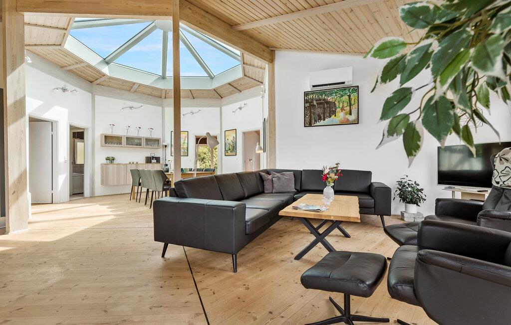 Stellen Sie sich vor, wie Sie in diesem architektonisch beeindruckenden Ferienhaus in Ebeltoft Strand ankommen. Die besondere Gestaltung mit einem Dachfensterpanorama in der Hausmitte flutet die hellen und freundlichen Räume mit natürlichem Licht. Das komfortable Interieur, inklusive einer gut ausgestatteten Küche, lädt Sie zum Verweilen ein. Entspannen Sie sich am Abend in der Sauna oder der Whirlpool-Badewanne und genießen Sie gemütliche Abende im großen und offenen Wohnzimmer. Ein Nebengebäude mit einladendem Aktivitätsraum und eine umgebende Terrasse, sowie ein Spielplatz im Garten, bieten Unterhaltung für Groß und Klein.