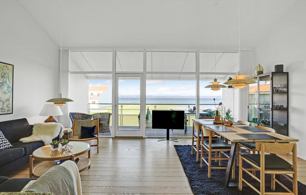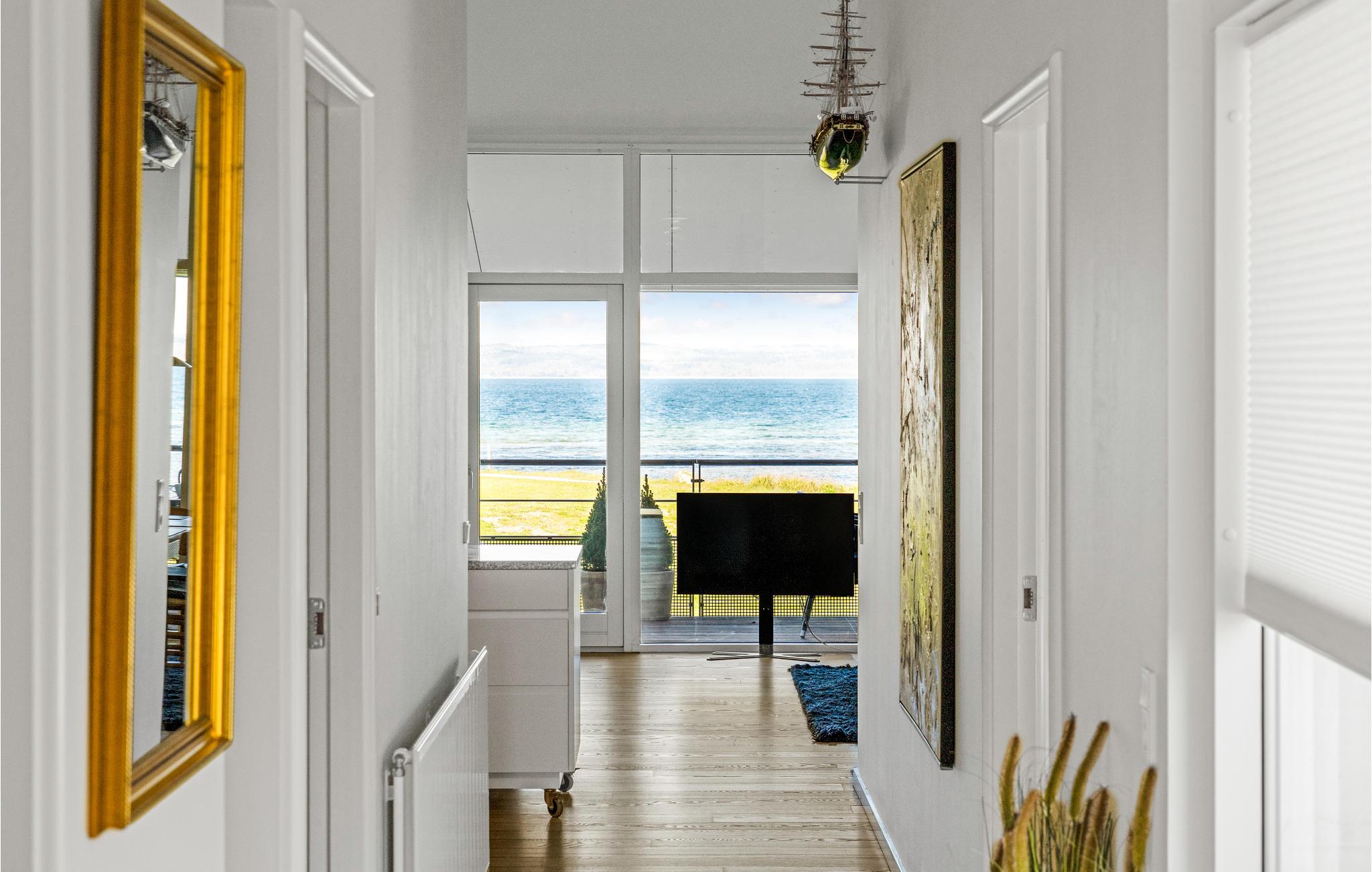 Moderne Ferienwohnung mit Panoramablick direkt am Strand von Ebeltoft Vig, ideal für erholsame Tage am Meer.