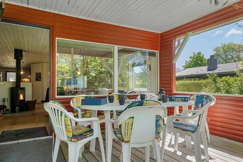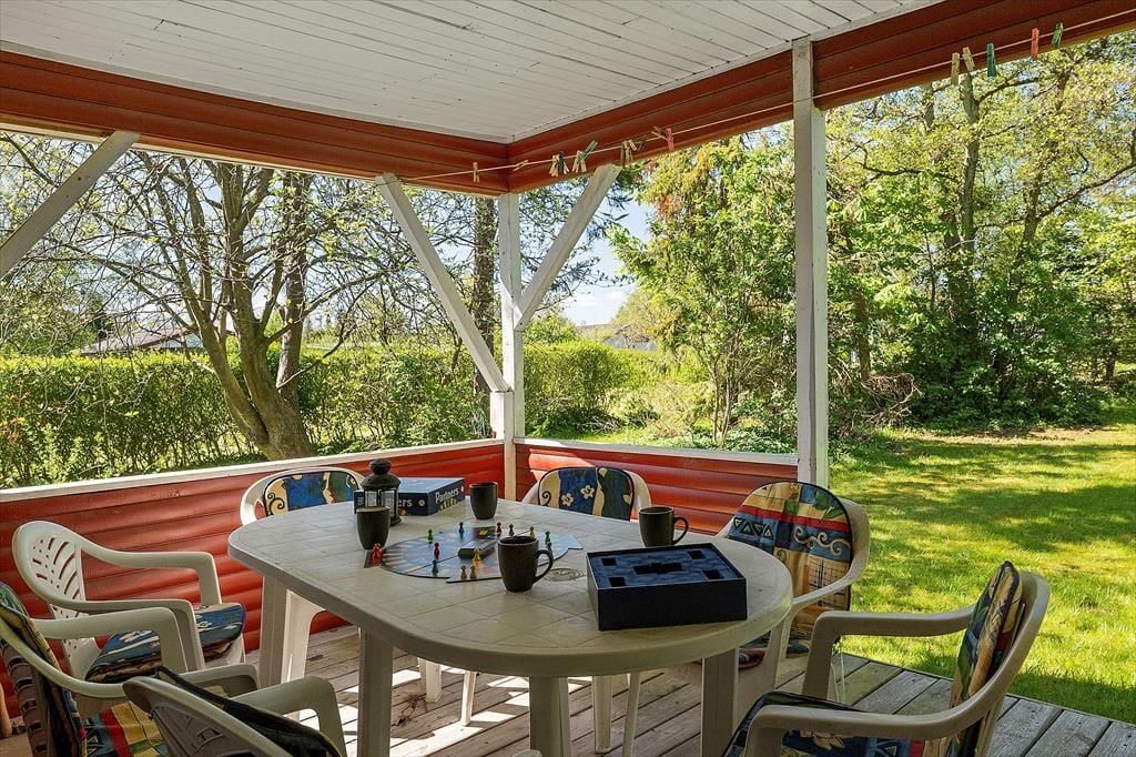 Draußen setzt sich die Ferienhausatmosphäre fort. Die überdachte Terrasse ist der perfekte Ort, um den Tag mit einer Tasse Kaffee zu beginnen, während die Morgensonne Ihre Nase wärmt und die Vögel im Hintergrund zwitschern. Hier kann man lange sitzen - sowohl wenn die Sonne hoch steht als auch wenn der Tau fällt - denn die Dachkonstruktion bietet Schutz, wenn das Wetter sich verschlechtert. Auf dem Gelände gibt es viel Platz zum Spielen und Entspannen, und die Kinder können frei herumlaufen, während die Erwachsenen in aller Ruhe ein gutes Buch lesen oder ein Grillabendessen vorbereiten. Wenn die Dunkelheit hereinbricht und die Glut des Grills noch warm ist, ist dies der perfekte Ort, um den Tag mit einem Snack und einem Urlaubsgespräch unter freiem Himmel ausklingen zu lassen. Hier ist es einfach, sich dem Urlaubsspaß hinzugeben.