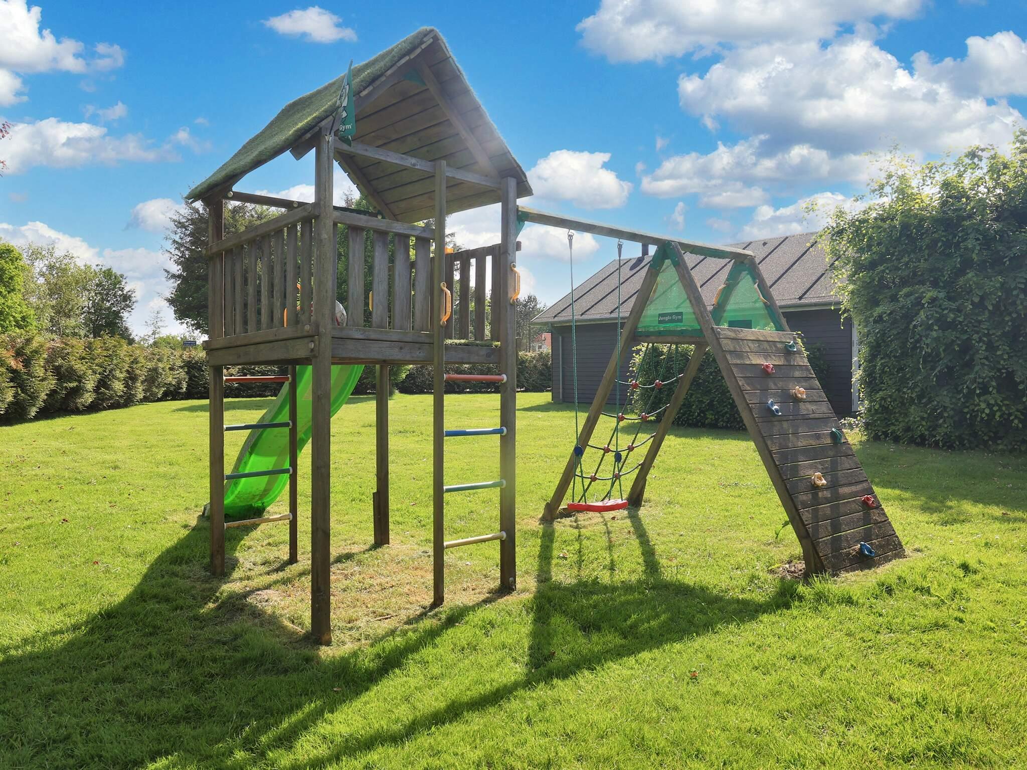 Auf beiden Seiten des Hauses befinden sich Terrassenflächen, die zum Grillen, Sonnenbaden und Ausspannen einladen. Das Grundstück ist ruhig gelegen und bietet Rasenfläche und Spielturm, sodass sich vor allem die Kinder prima austoben können. Das Ferienhausgebiet ist ruhig und Baden kann man entweder am Limfjord oder am Kattegat.