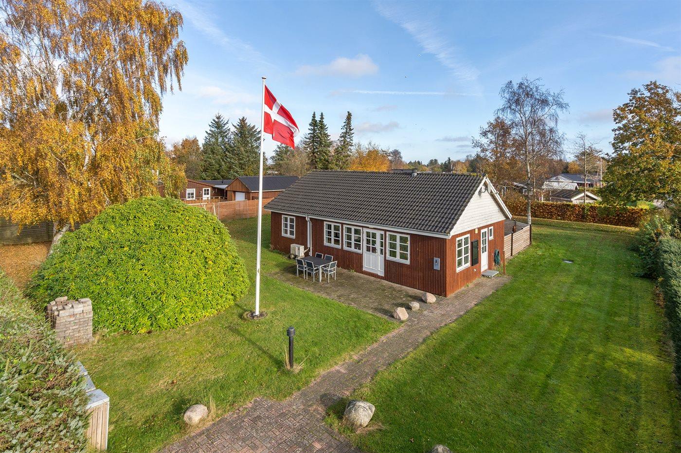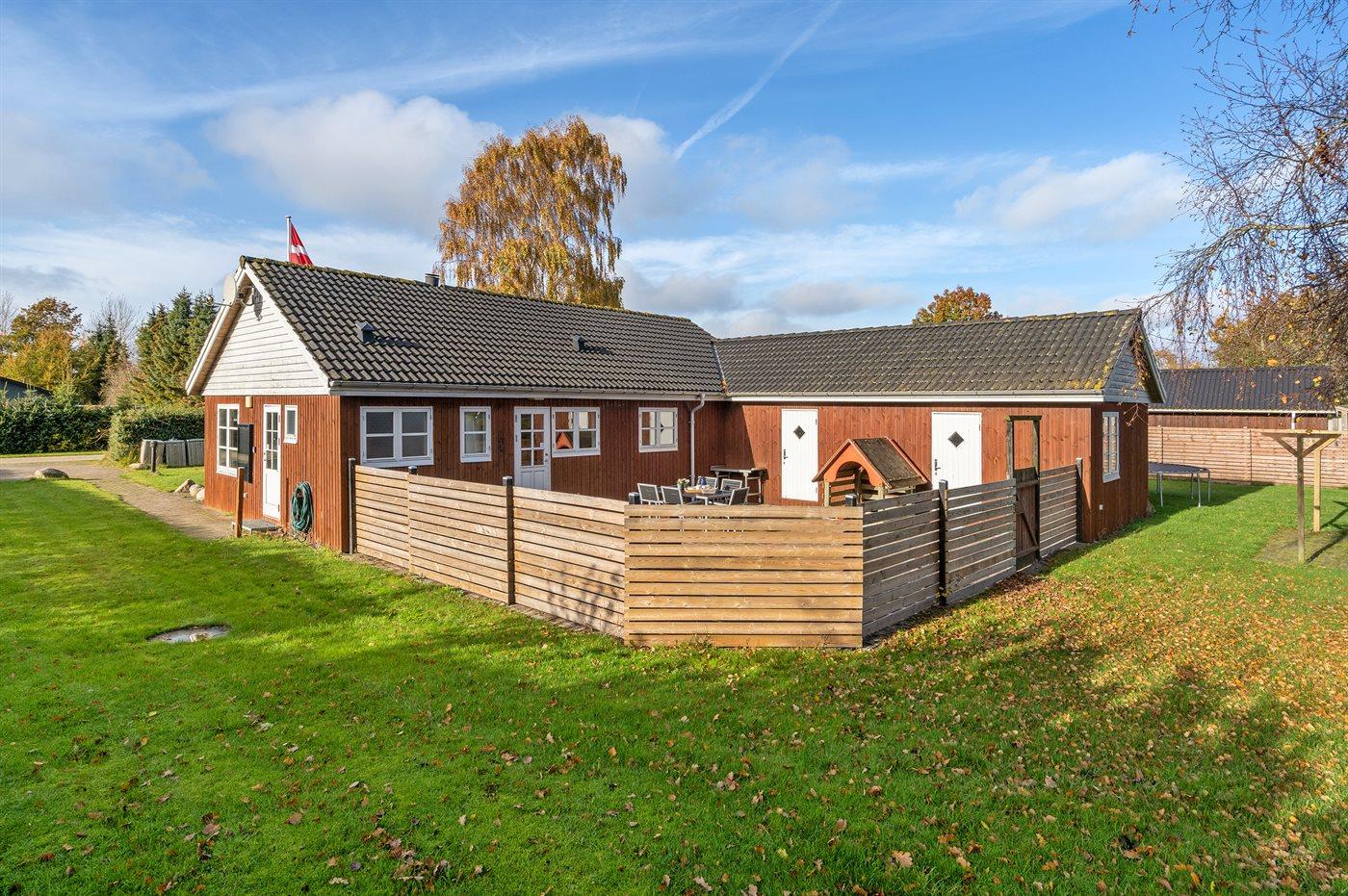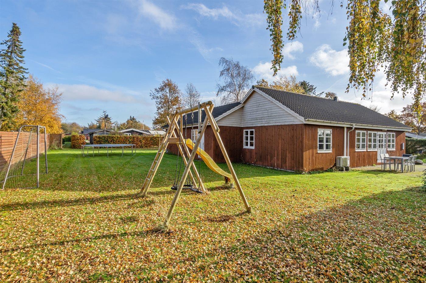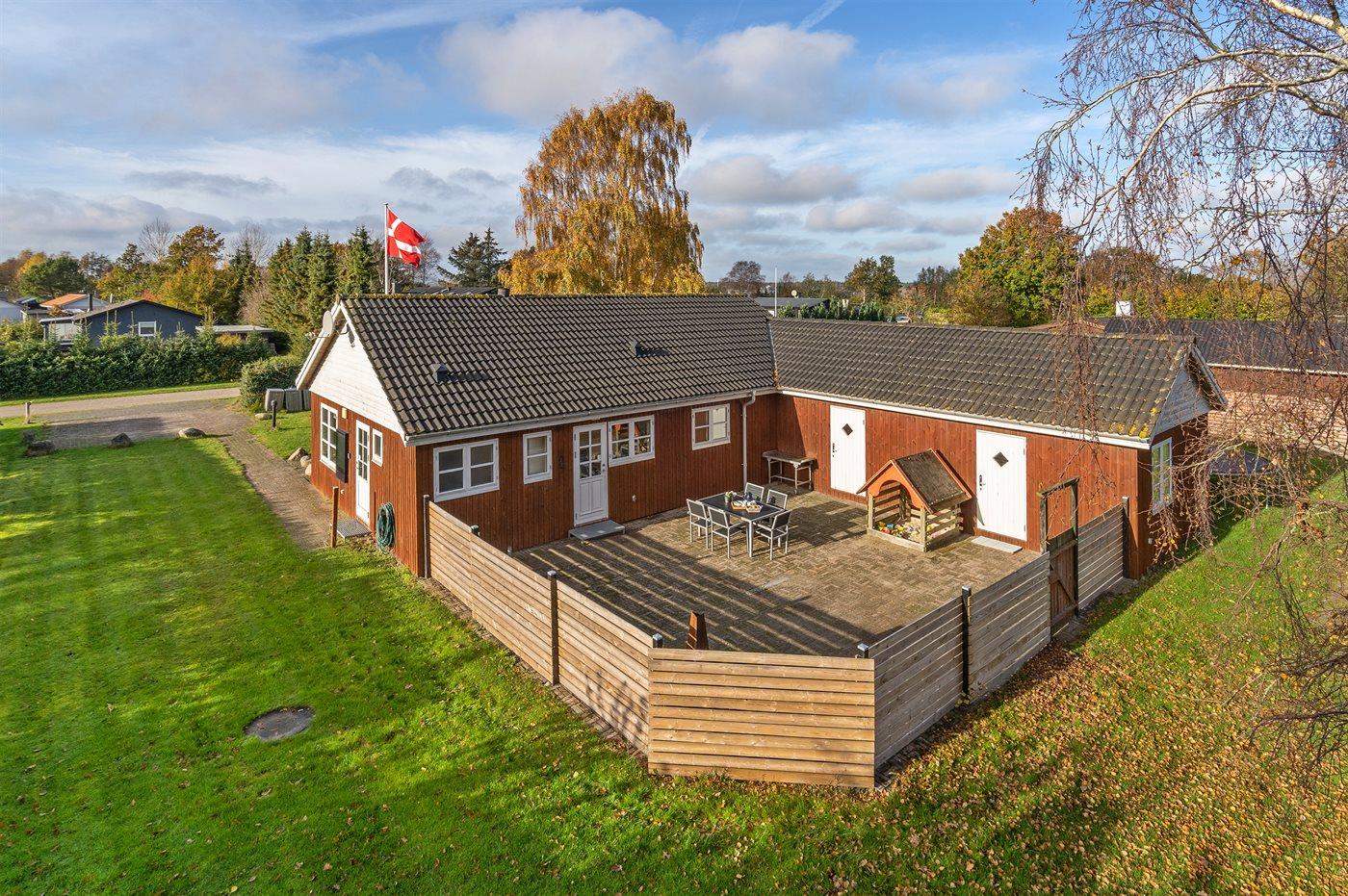 Gemütliches Holzferienhaus mit großer Terrasse, Spielplatz und Nähe zum Meer in Storvorde, Dänemark.