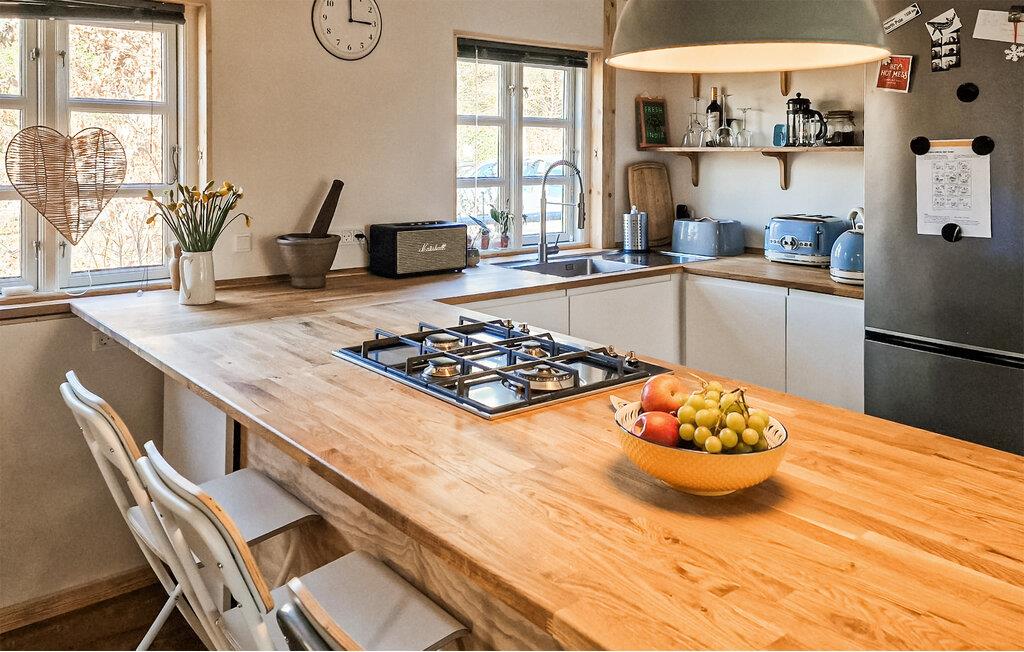 Treten Sie ein und erleben Sie die behagliche Atmosphäre, die durch liebevolle Details geprägt ist. Der kompakte Wohnbereich lädt Sie dazu ein, gemeinsam zur Ruhe zu kommen und den Alltag hinter sich zu lassen. Nehmen Sie in dem bequemen Sessel oder auf dem Sofa Platz und genießen Sie die wohlige Wärme des Kaminofens, während das Licht durch die großen Fenstertüren fällt. Nutzen Sie die offene Küche mit zentraler Kochinsel, um gemeinsam zu kochen und neue Rezepte auszuprobieren. Verweilen Sie am Tresen oder am Tisch und lassen Sie die Zeit bei guten Gesprächen verstreichen.