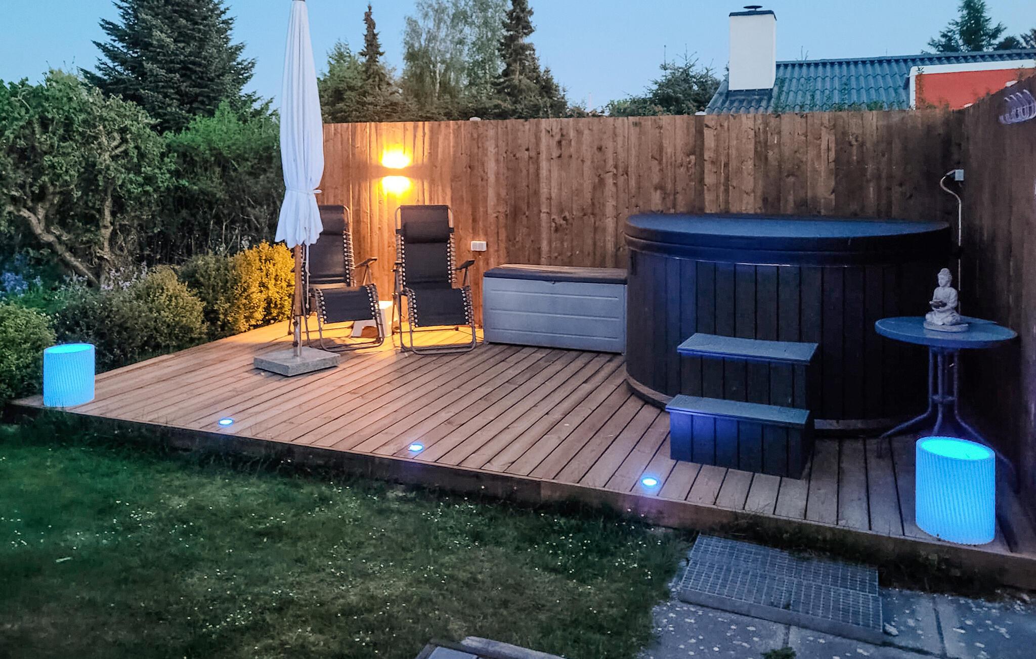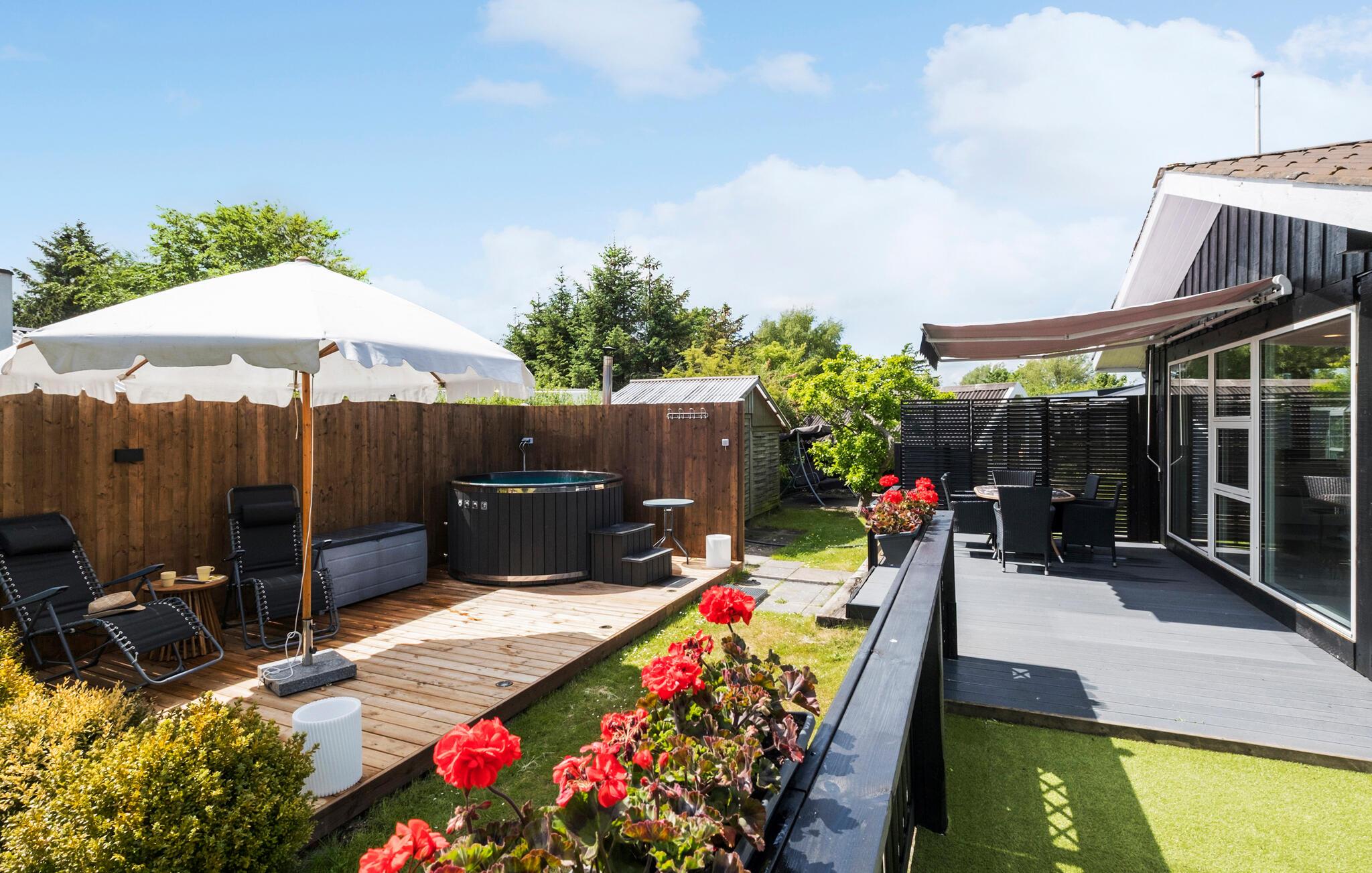 Charmantes Ferienhaus mit finnischem Holzbad, Whirlpool und Kamin nahe Egense Strand für entspannte Familienurlaube.