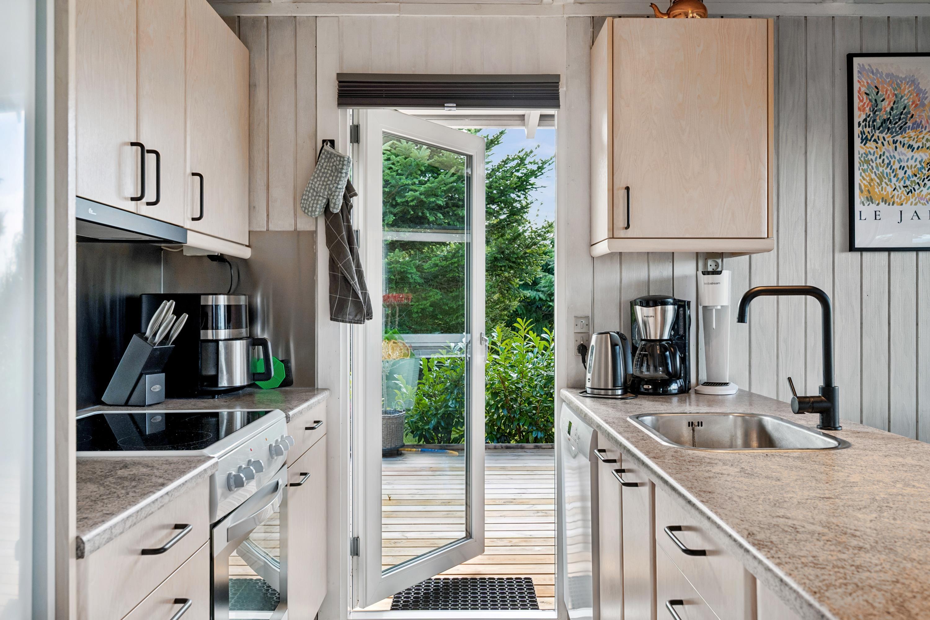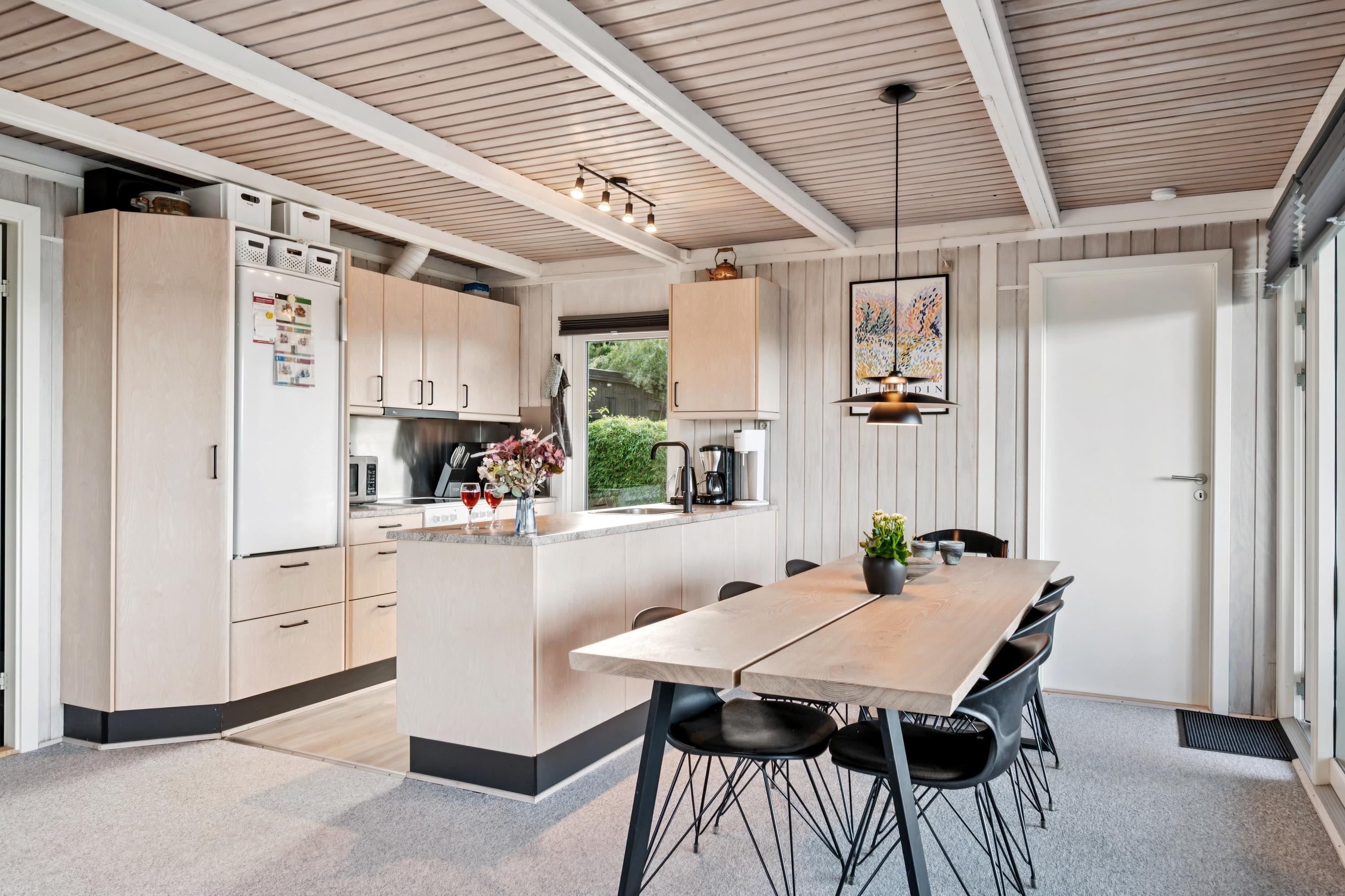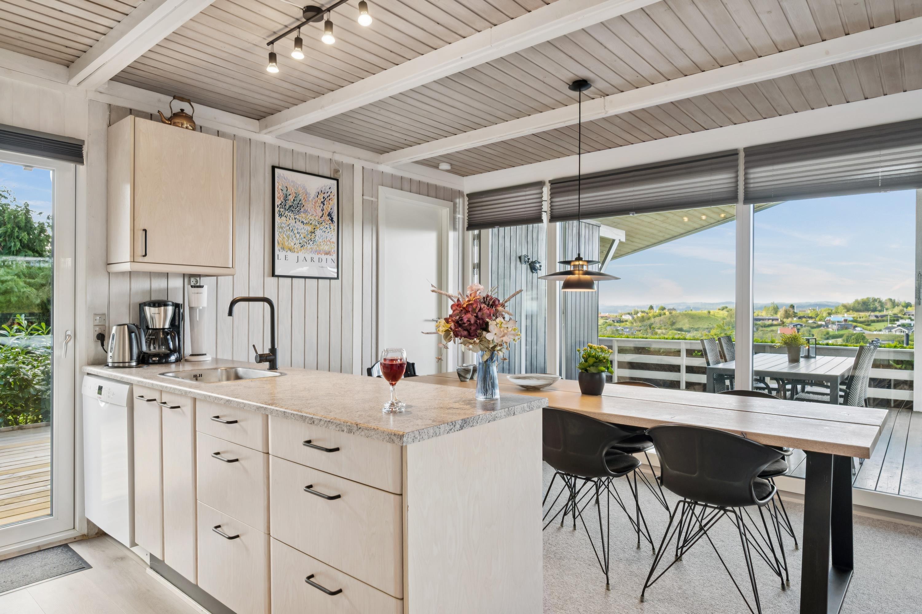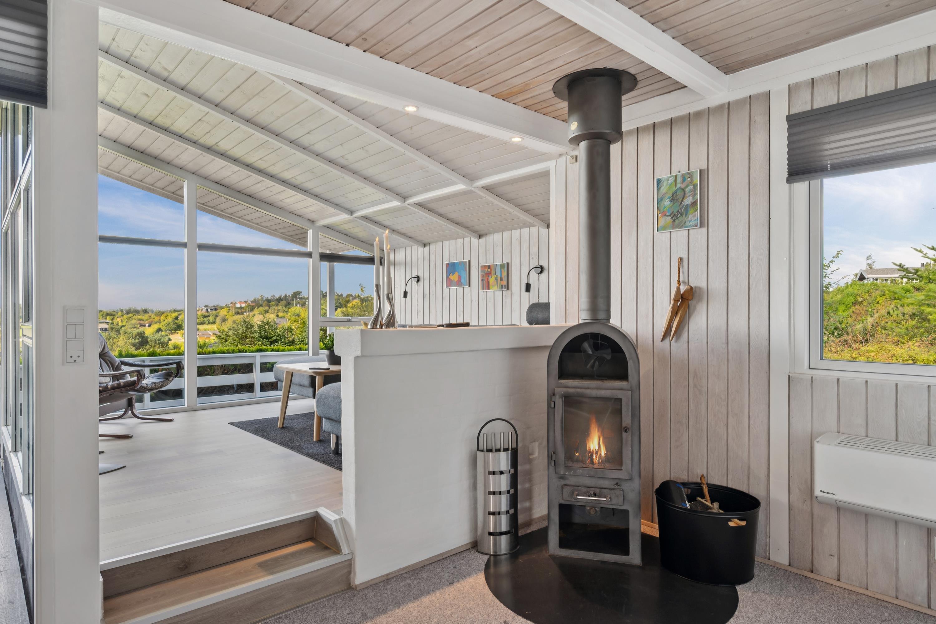 Willkommen in diesem gemütlichen und gepflegten Ferienhaus. Das Wohnzimmer ist geschmackvoll eingerichtet und bietet einen herrlichen Blick auf das Wasser. Die gut ausgestattete Küche verfügt u. a. über einen Geschirrspüler und hat direkten Zugang zu einer schönen Terrasse mit Gartenmöbeln. Angrenzend an die Küche liegt das gemütliche Esszimmer mit Holzofen und Wärmepumpe – von hier gelangen Sie ebenfalls auf eine überdachte Terrasse mit Gartenmöbeln. Das Badezimmer ist modern eingerichtet mit Dusche und Waschmaschine.