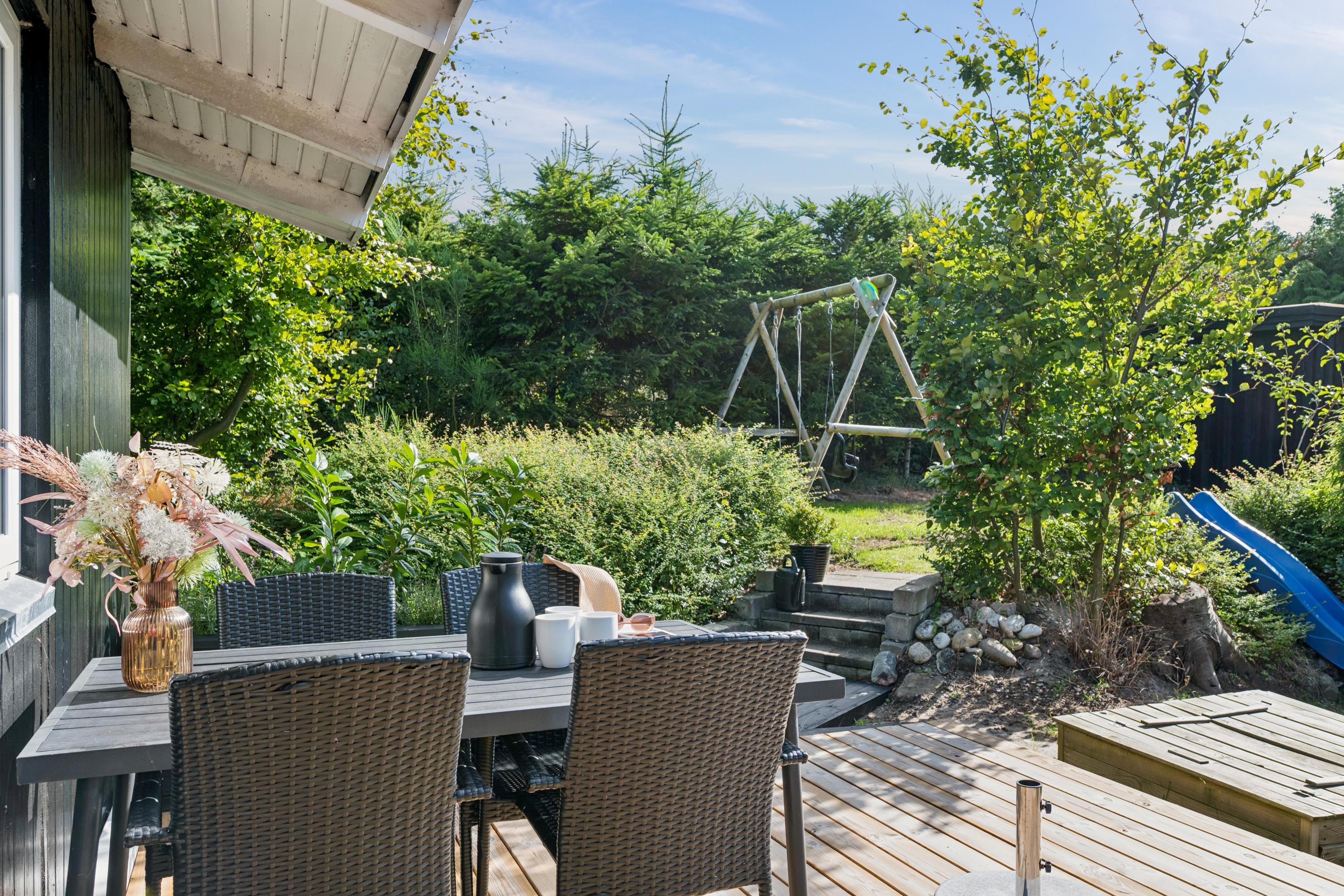 Die Schlafplätze des Ferienhauses verteilen sich auf drei gute Schlafzimmer. Für die kleinen Feriengäste stehen Hochstuhl und Kinderbett bereit. Das Ferienhaus liegt erhöht auf einem gepflegten Grundstück mit großer Rasenfläche. Es gibt mehrere windgeschützte Terrassen mit Gartenmöbeln, und für Kinder sind Schaukeln, Sandkasten und Rutsche vorhanden. Reisen Sie mit mehreren Familien, so können in derselben Straße noch fünf weitere Häuser gemietet werden.