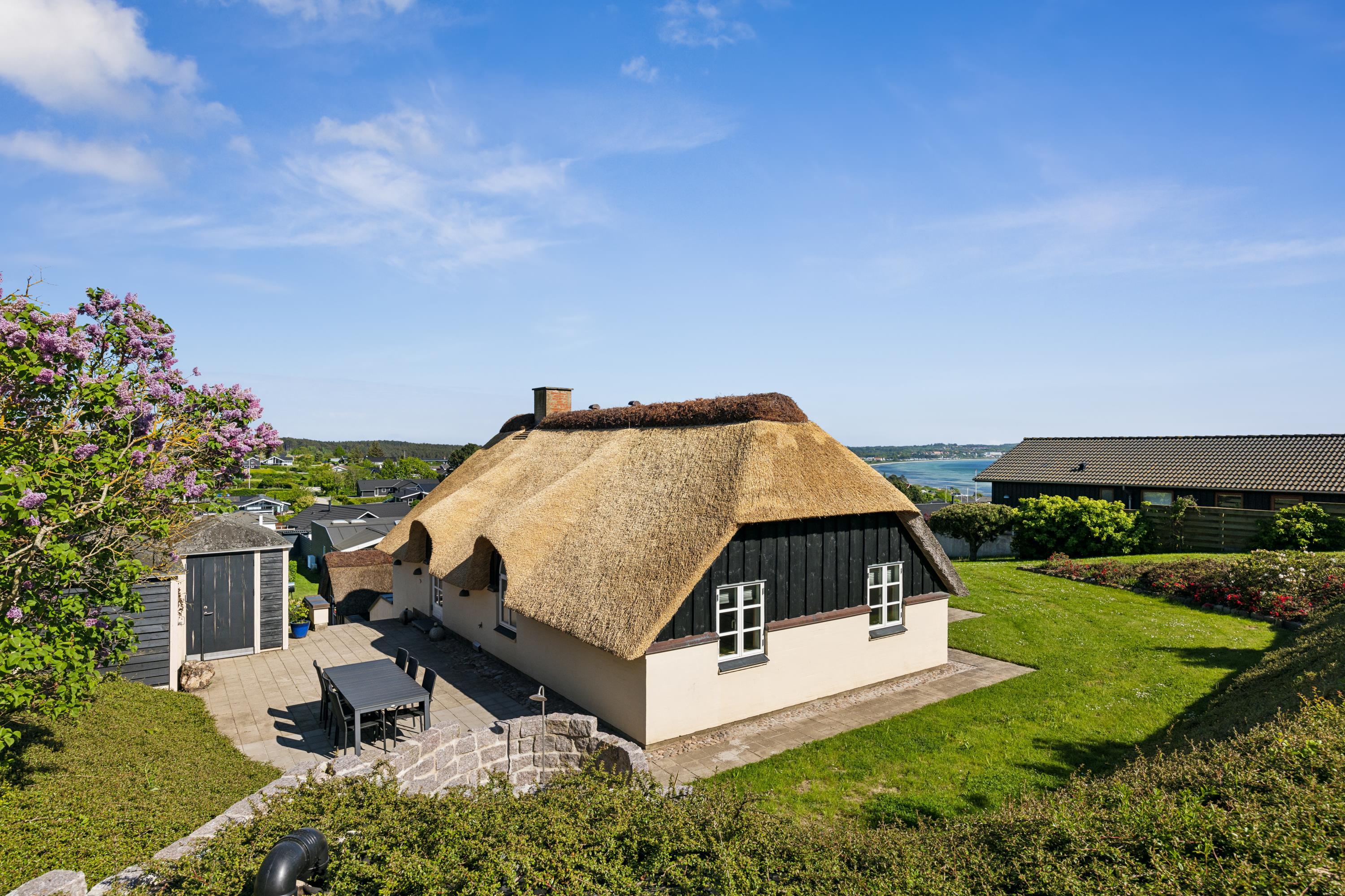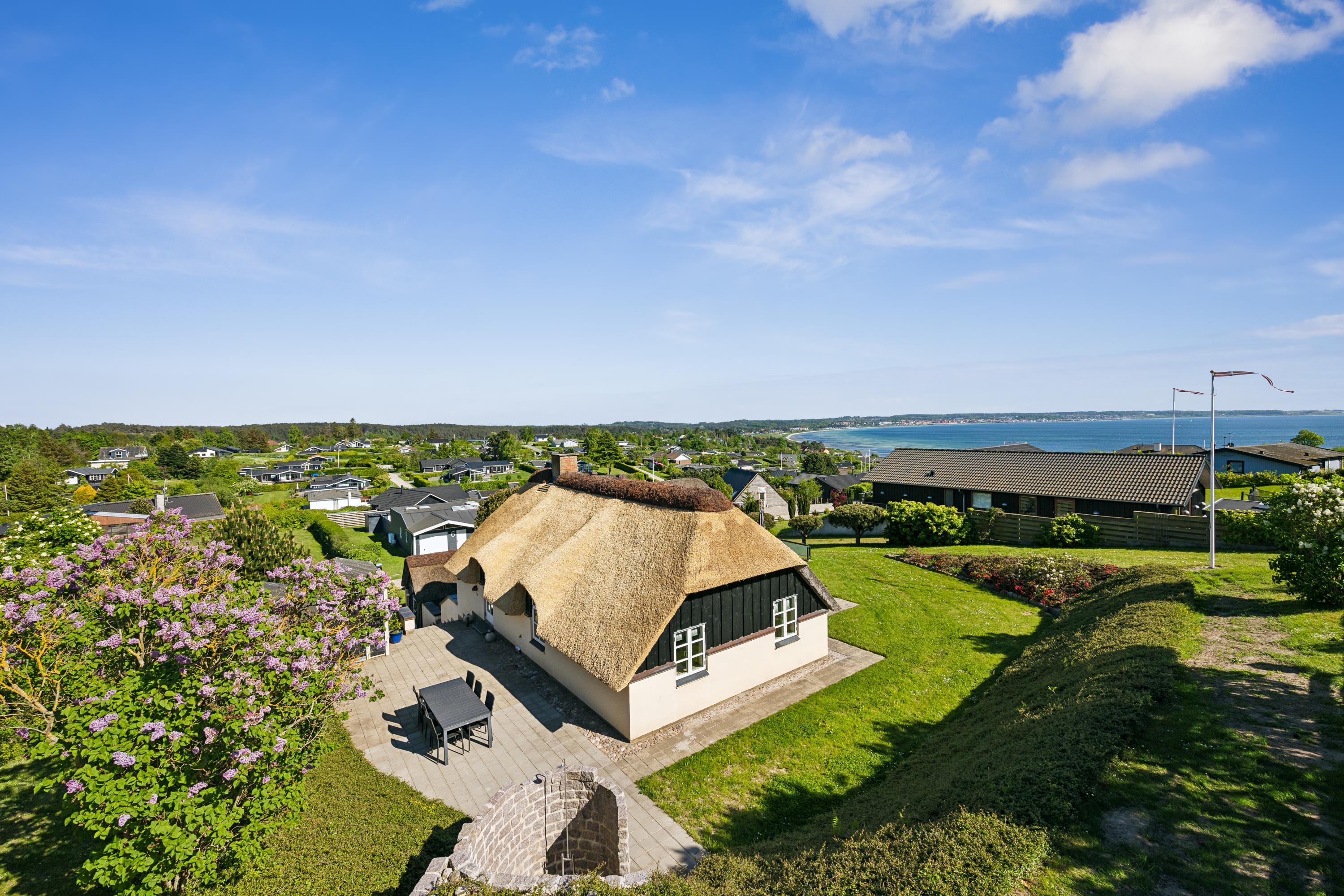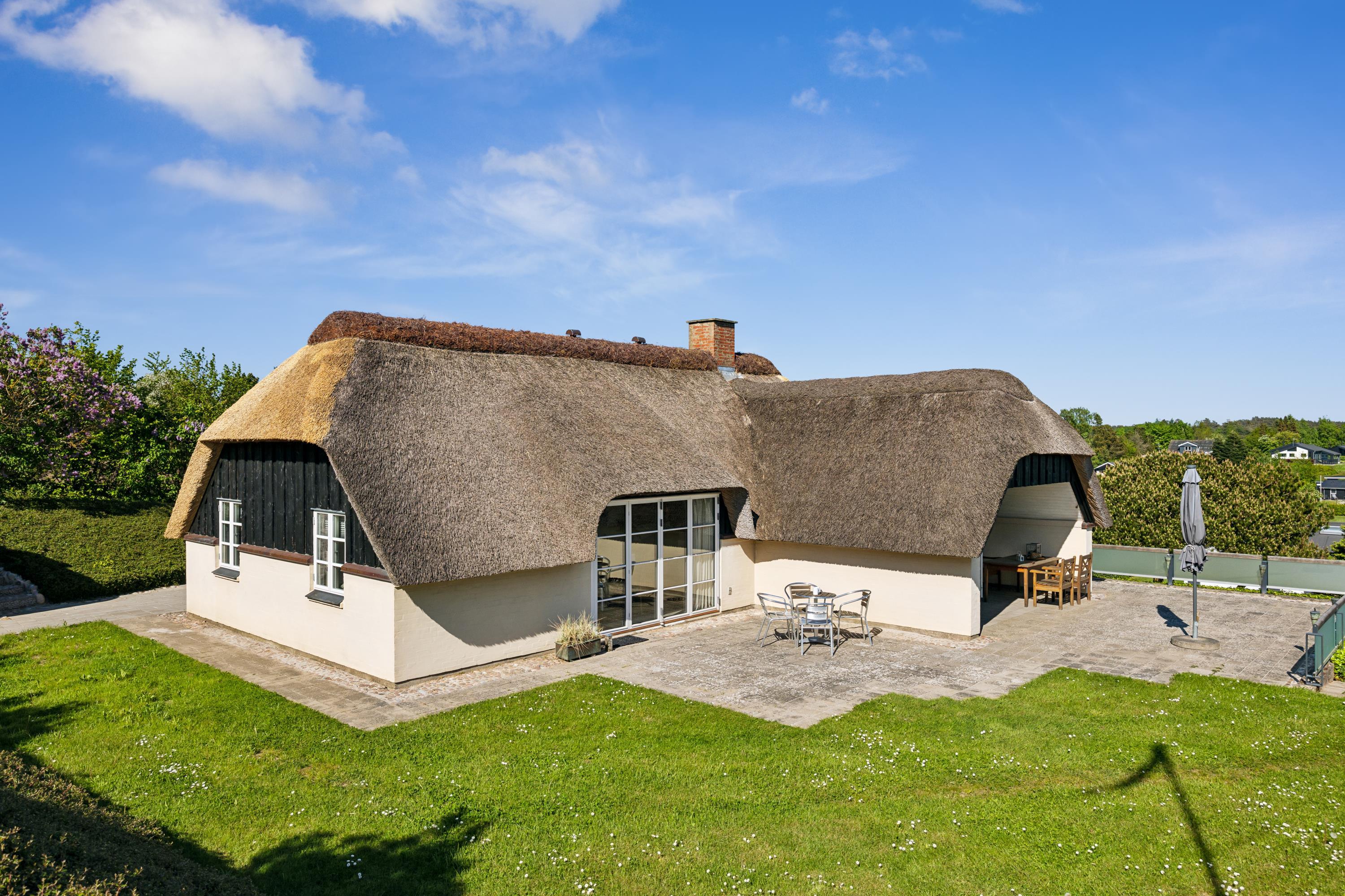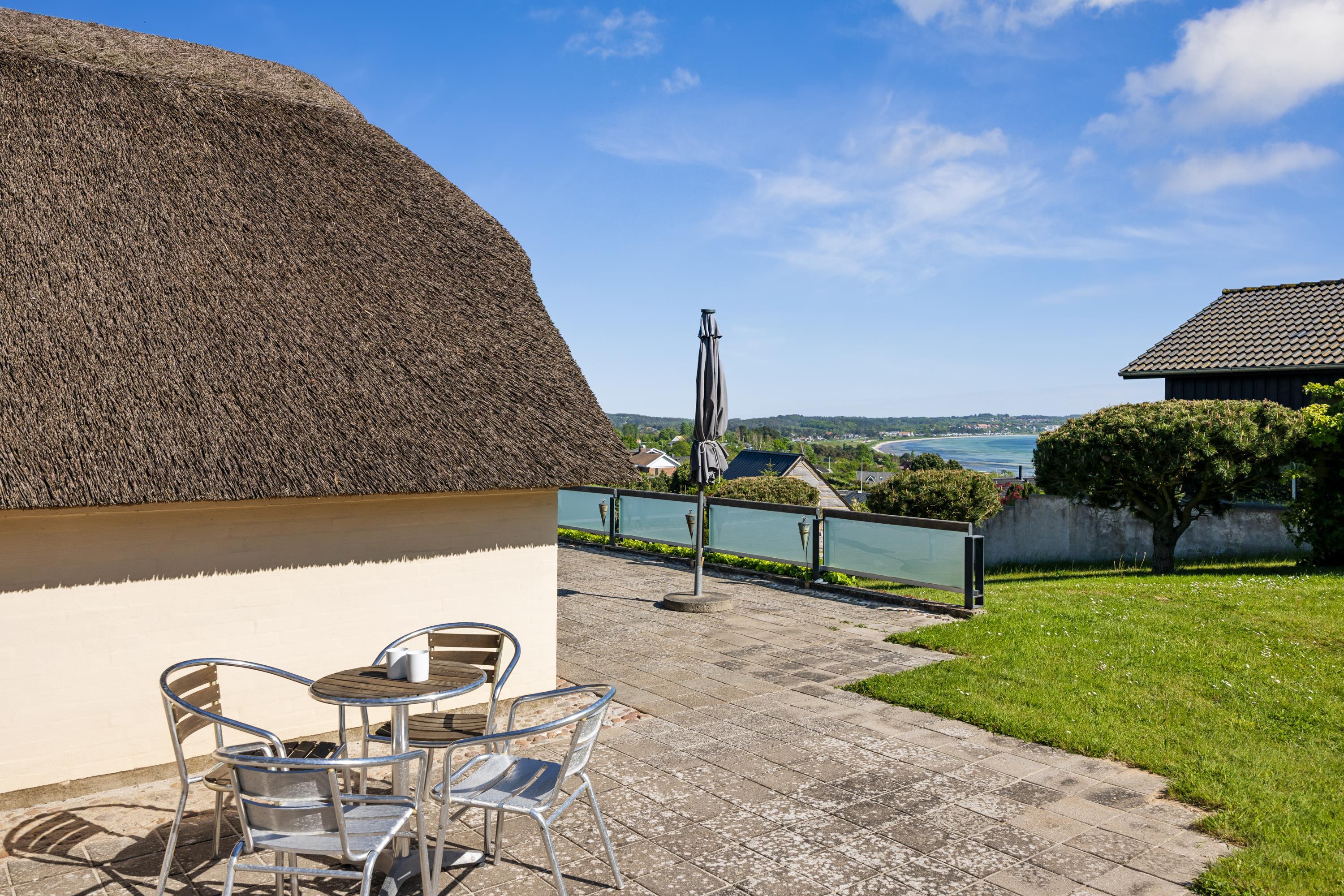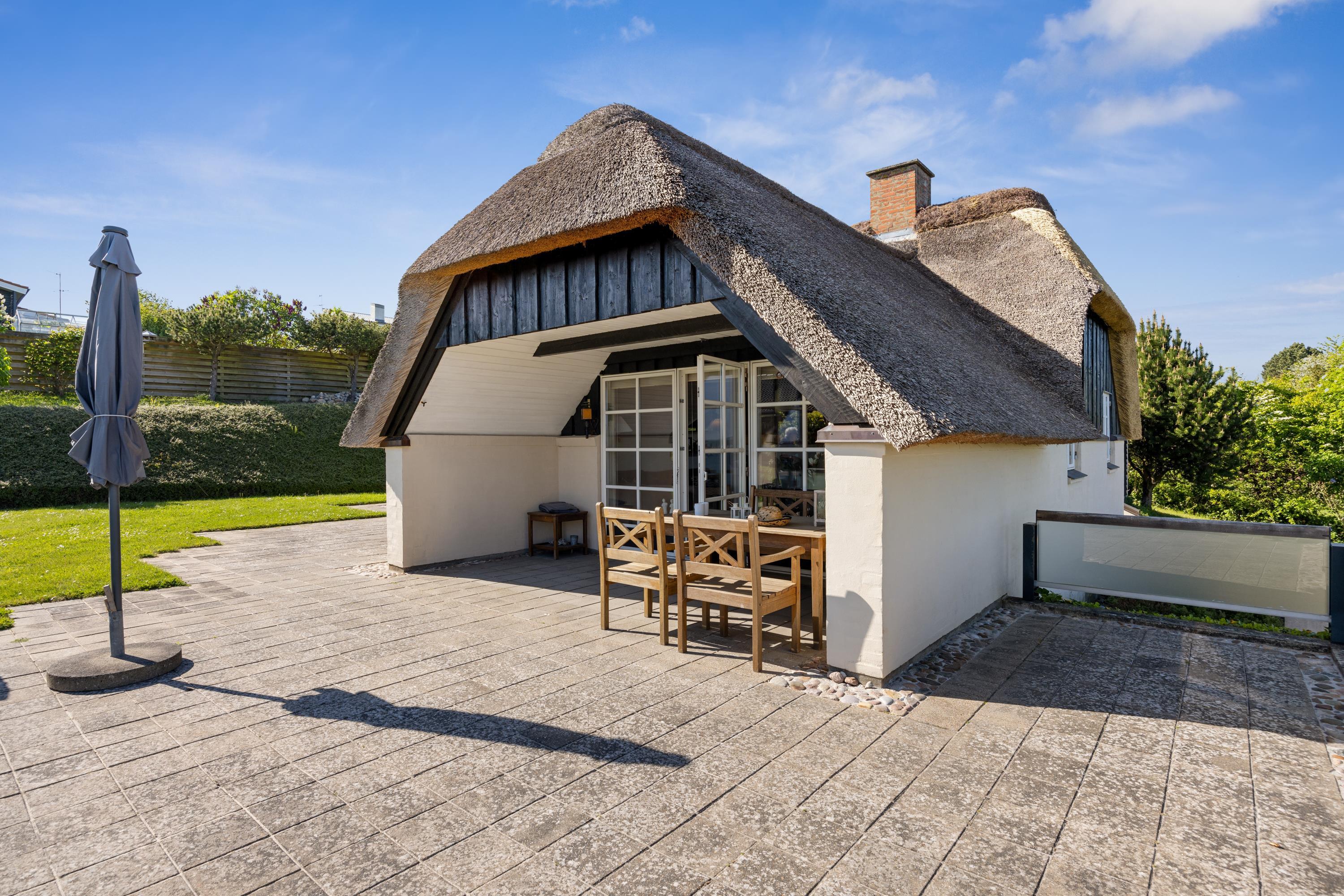 Dieses äußerst gepflegte Ferienhaus ist ein seltenes Juwel. Hier erwarten Sie 88 m2 reetgedeckte Idylle, hoch gelegen mit Panoramablick auf die Bucht Ebeltoft Vig und die hügelige Landschaft bei Egsmark Strand. Das Haus ist von schönen Fliesenterrassen, gen Süden teilweise überdacht, und einem ungestörten Innenhof umgeben, wo man die Sonne von morgens bis abends genießen kann. Gute Gartenmöbel, Liegestühle, Sonnenschirm und Grill sind vorhanden. Es gibt einen Carport und einen abschließbaren Schuppen.