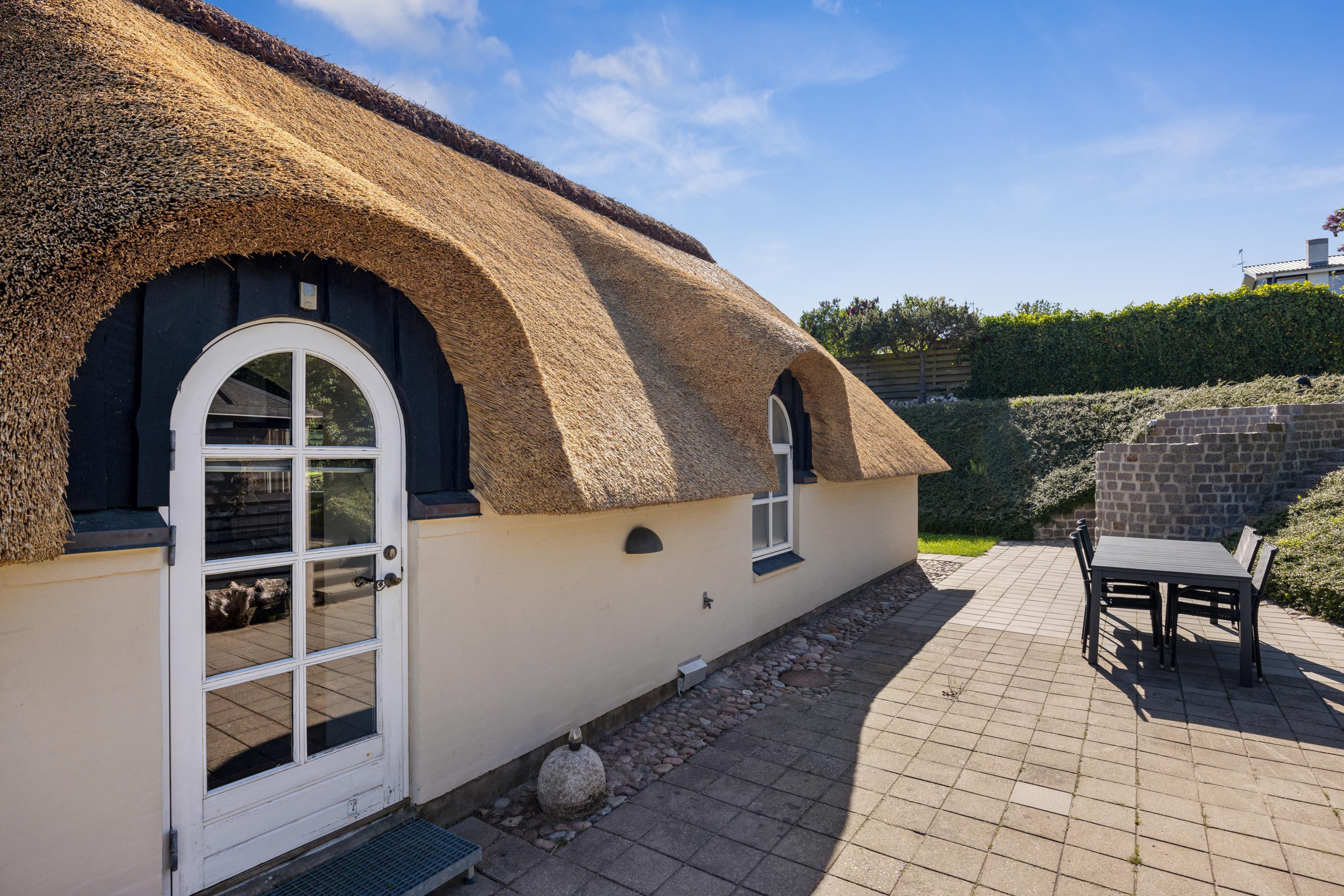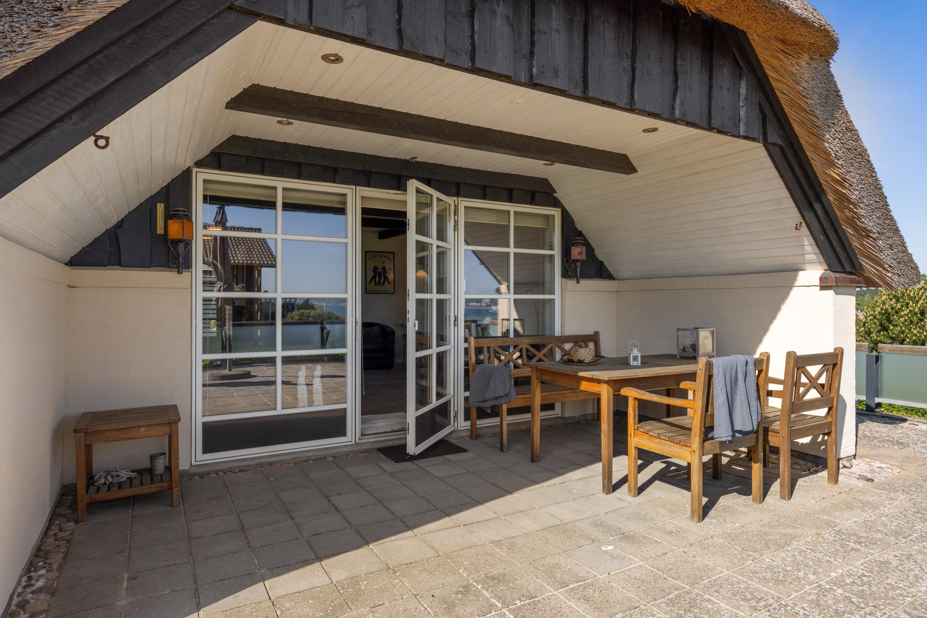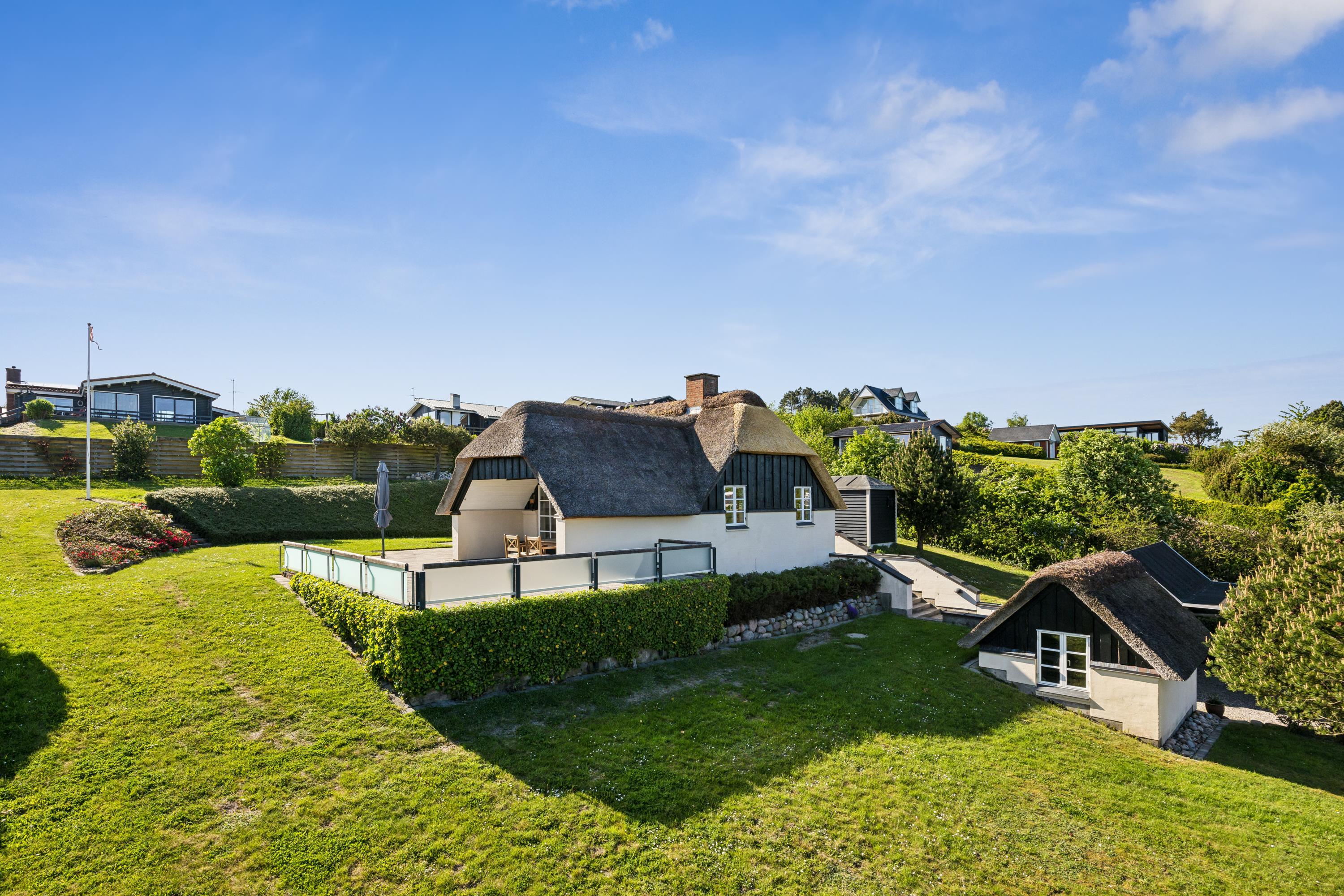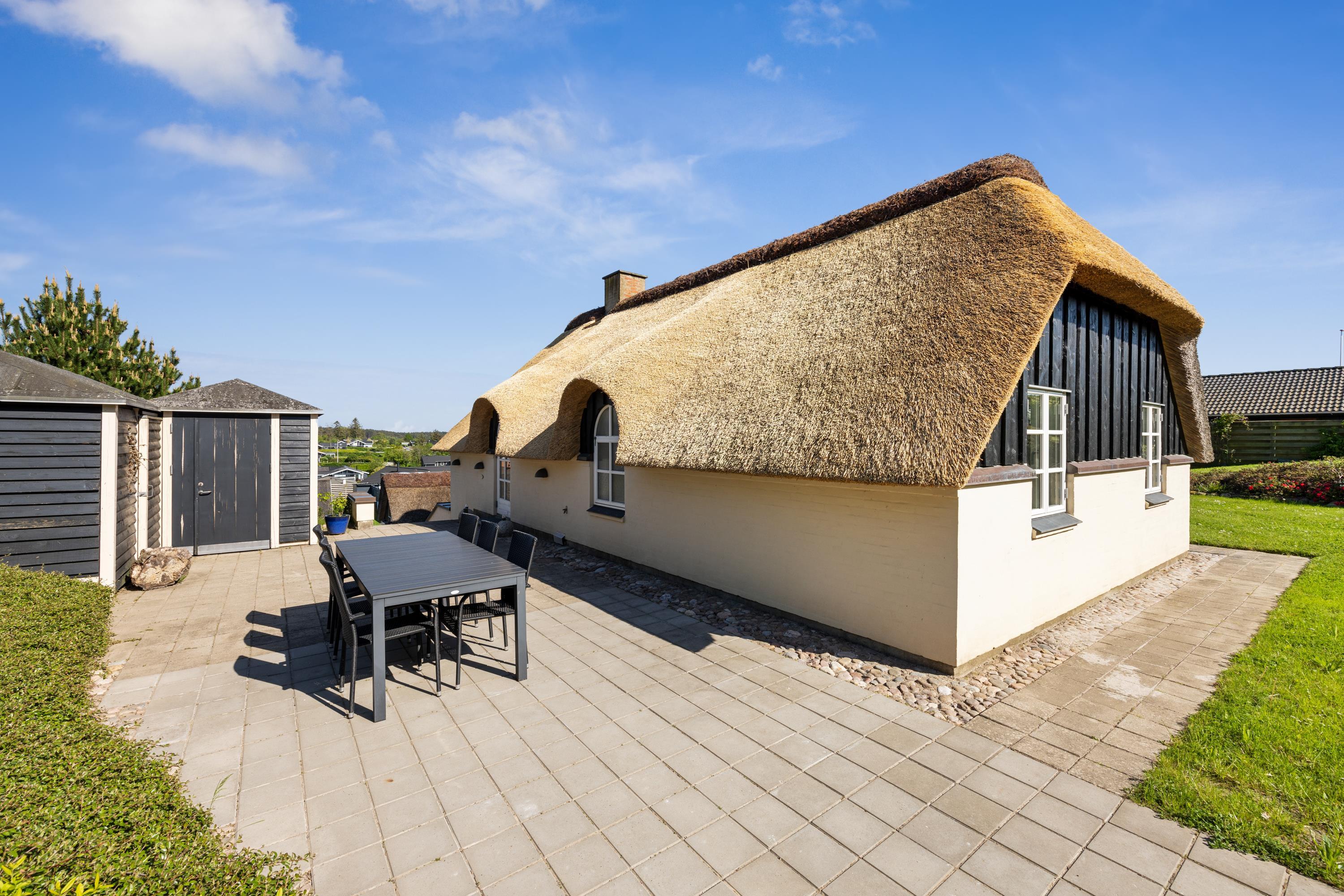 Dieses äußerst gepflegte Ferienhaus ist ein seltenes Juwel. Hier erwarten Sie 88 m2 reetgedeckte Idylle, hoch gelegen mit Panoramablick auf die Bucht Ebeltoft Vig und die hügelige Landschaft bei Egsmark Strand. Das Haus ist von schönen Fliesenterrassen, gen Süden teilweise überdacht, und einem ungestörten Innenhof umgeben, wo man die Sonne von morgens bis abends genießen kann. Gute Gartenmöbel, Liegestühle, Sonnenschirm und Grill sind vorhanden. Es gibt einen Carport und einen abschließbaren Schuppen.