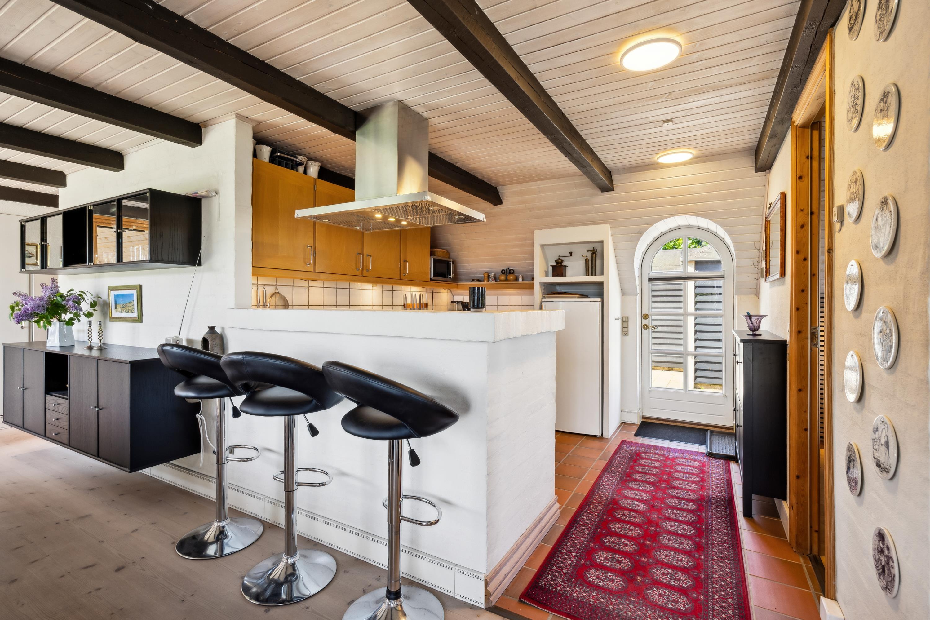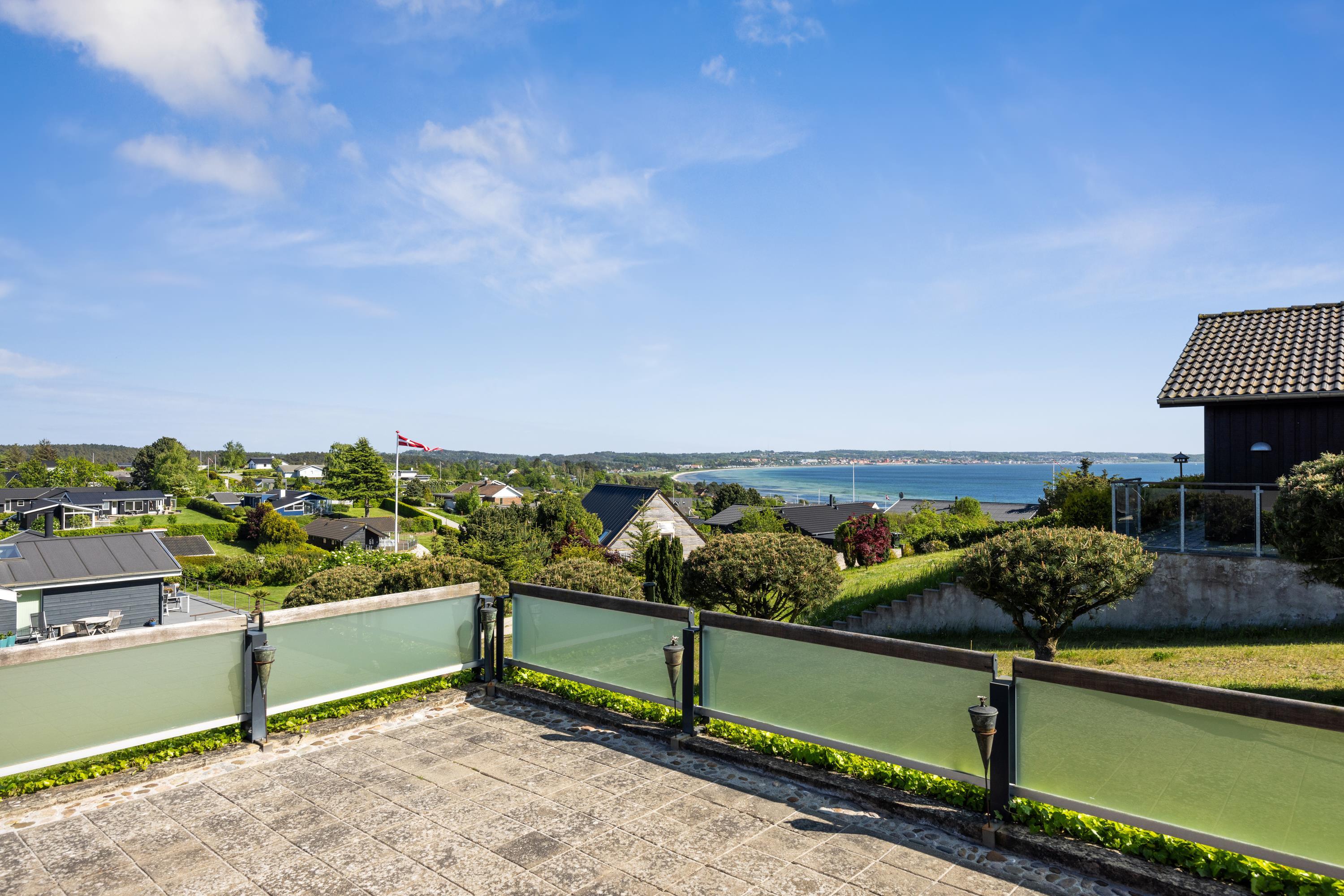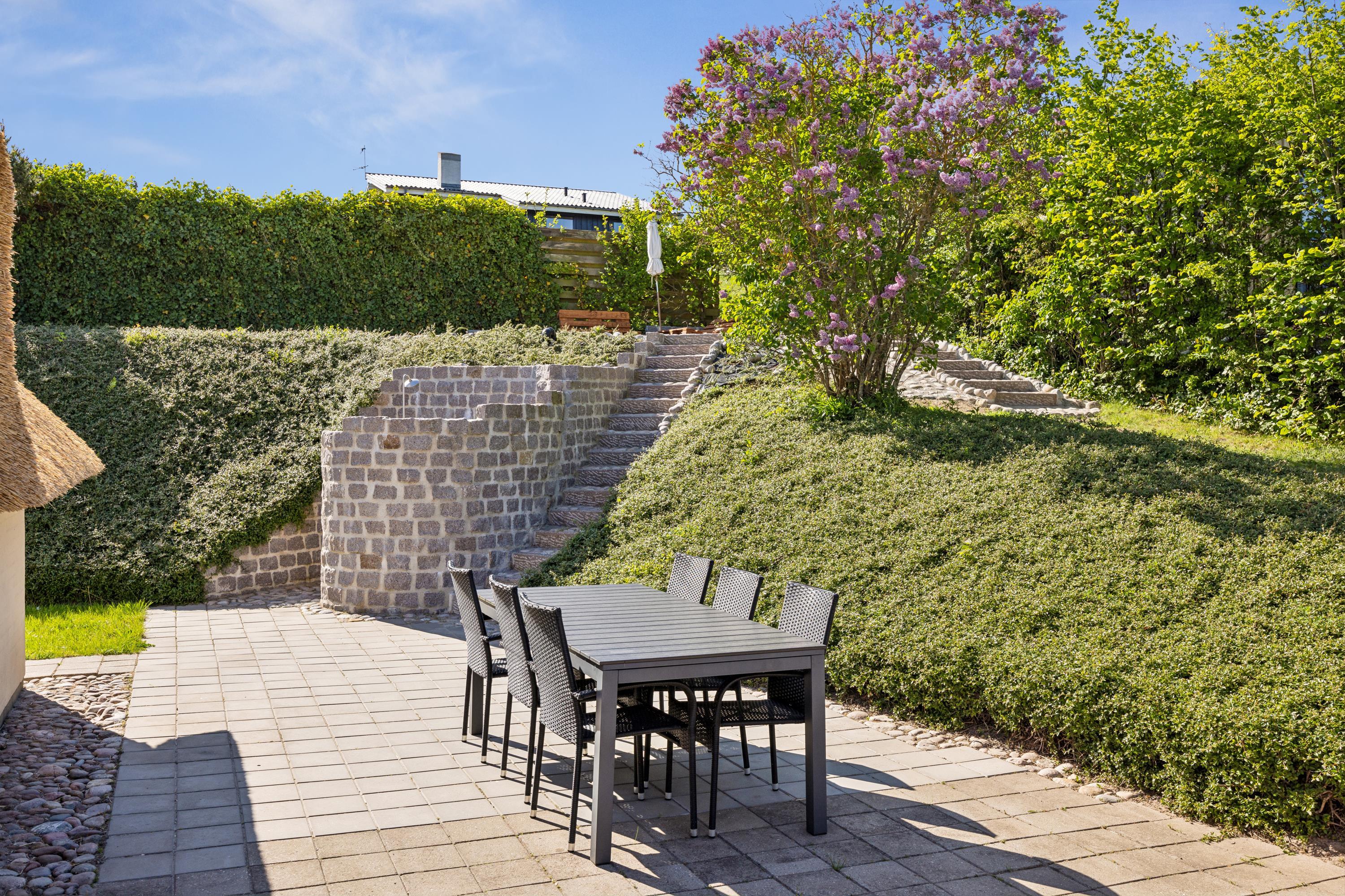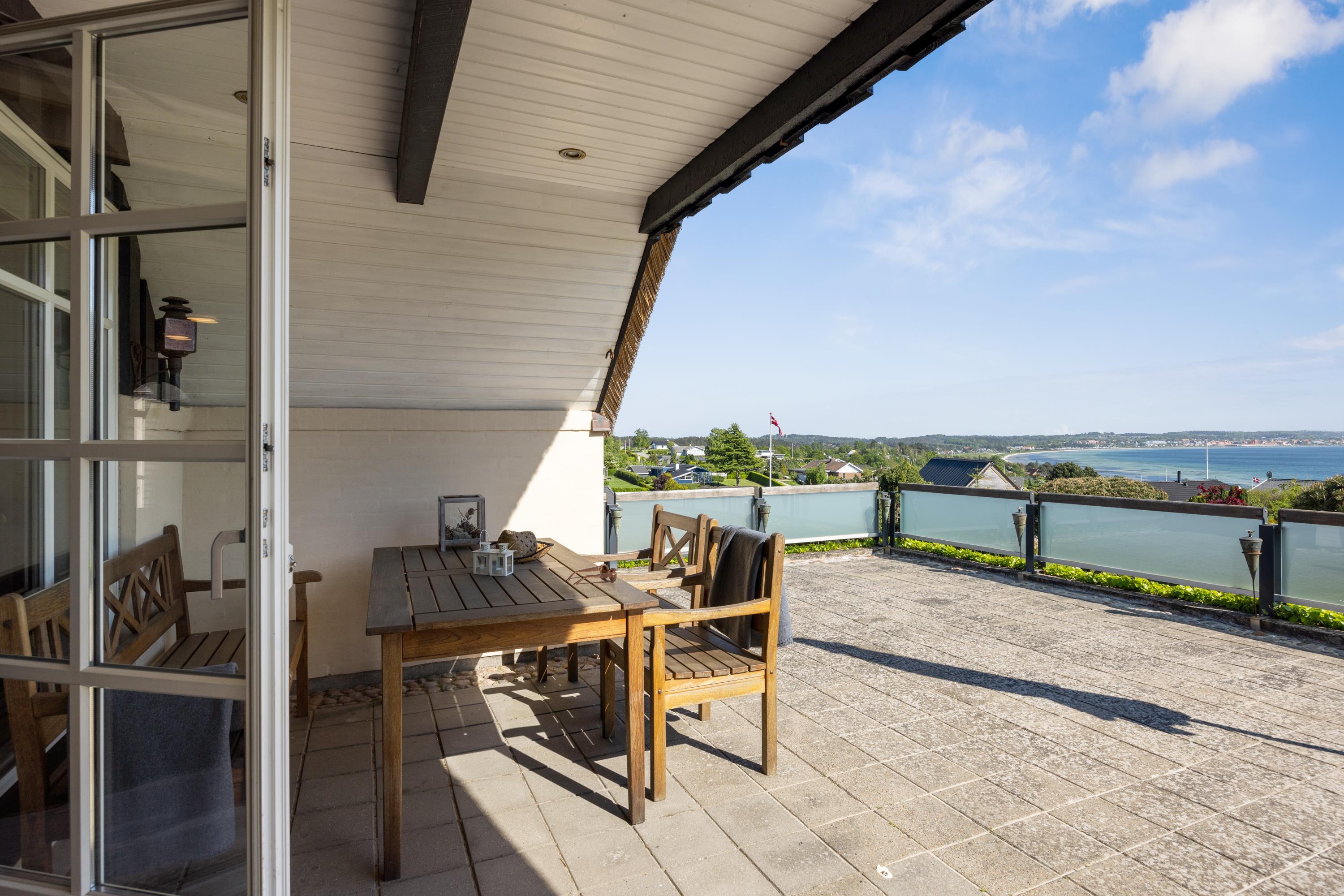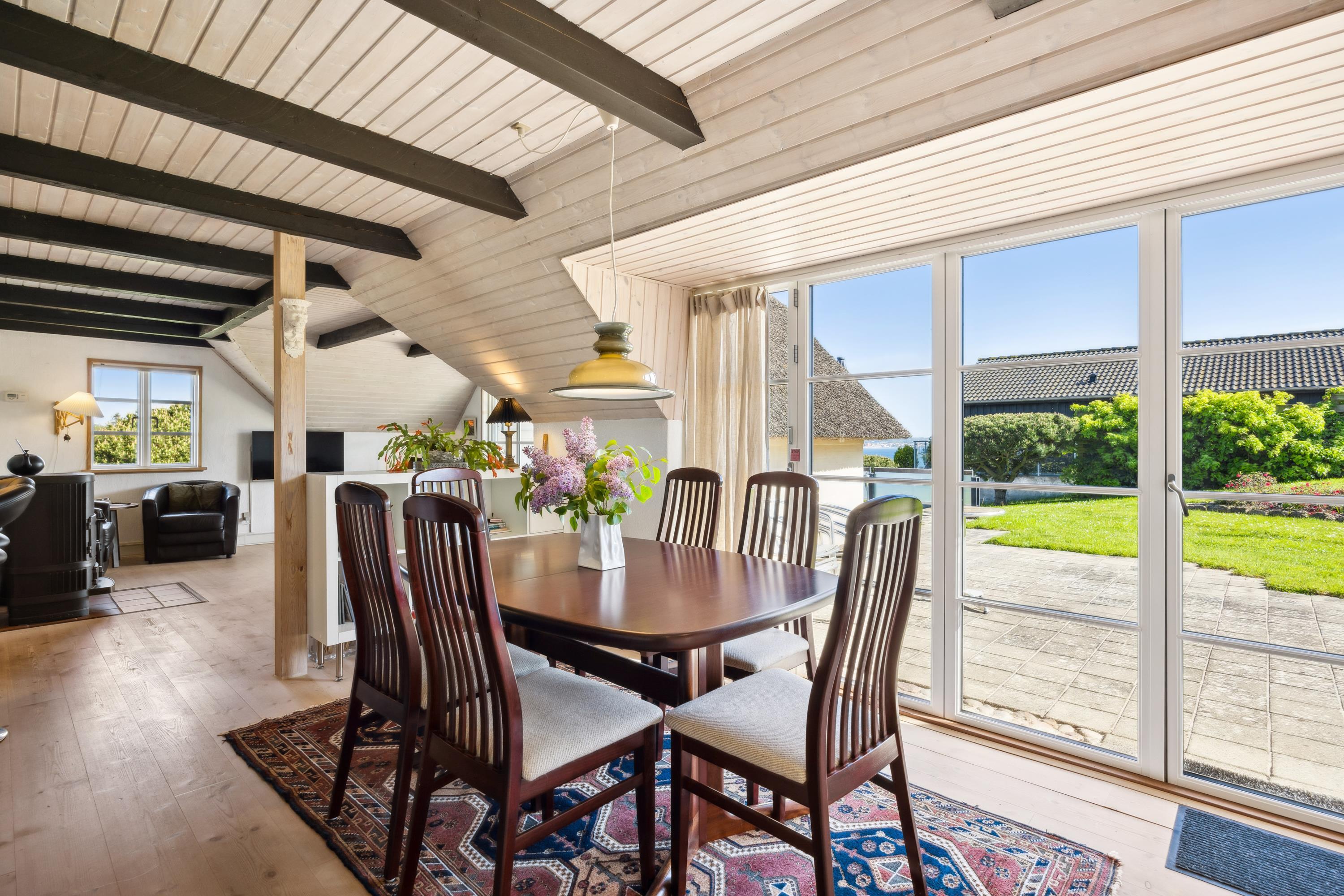 Dieses äußerst gepflegte Ferienhaus ist ein seltenes Juwel. Hier erwarten Sie 88 m2 reetgedeckte Idylle, hoch gelegen mit Panoramablick auf die Bucht Ebeltoft Vig und die hügelige Landschaft bei Egsmark Strand. Das Haus ist von schönen Fliesenterrassen, gen Süden teilweise überdacht, und einem ungestörten Innenhof umgeben, wo man die Sonne von morgens bis abends genießen kann. Gute Gartenmöbel, Liegestühle, Sonnenschirm und Grill sind vorhanden. Es gibt einen Carport und einen abschließbaren Schuppen.